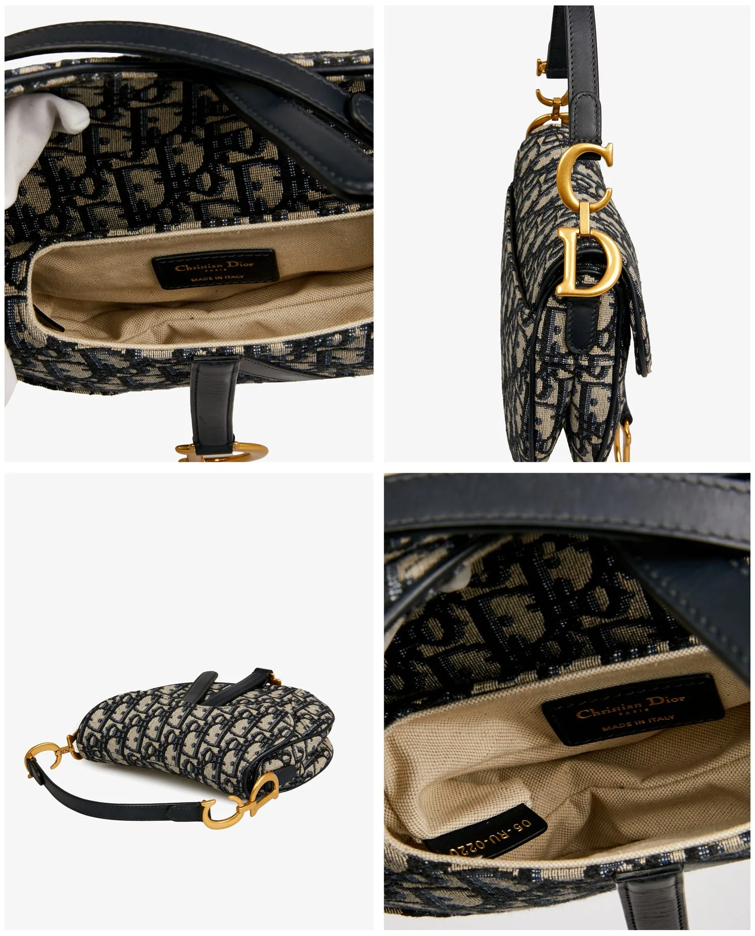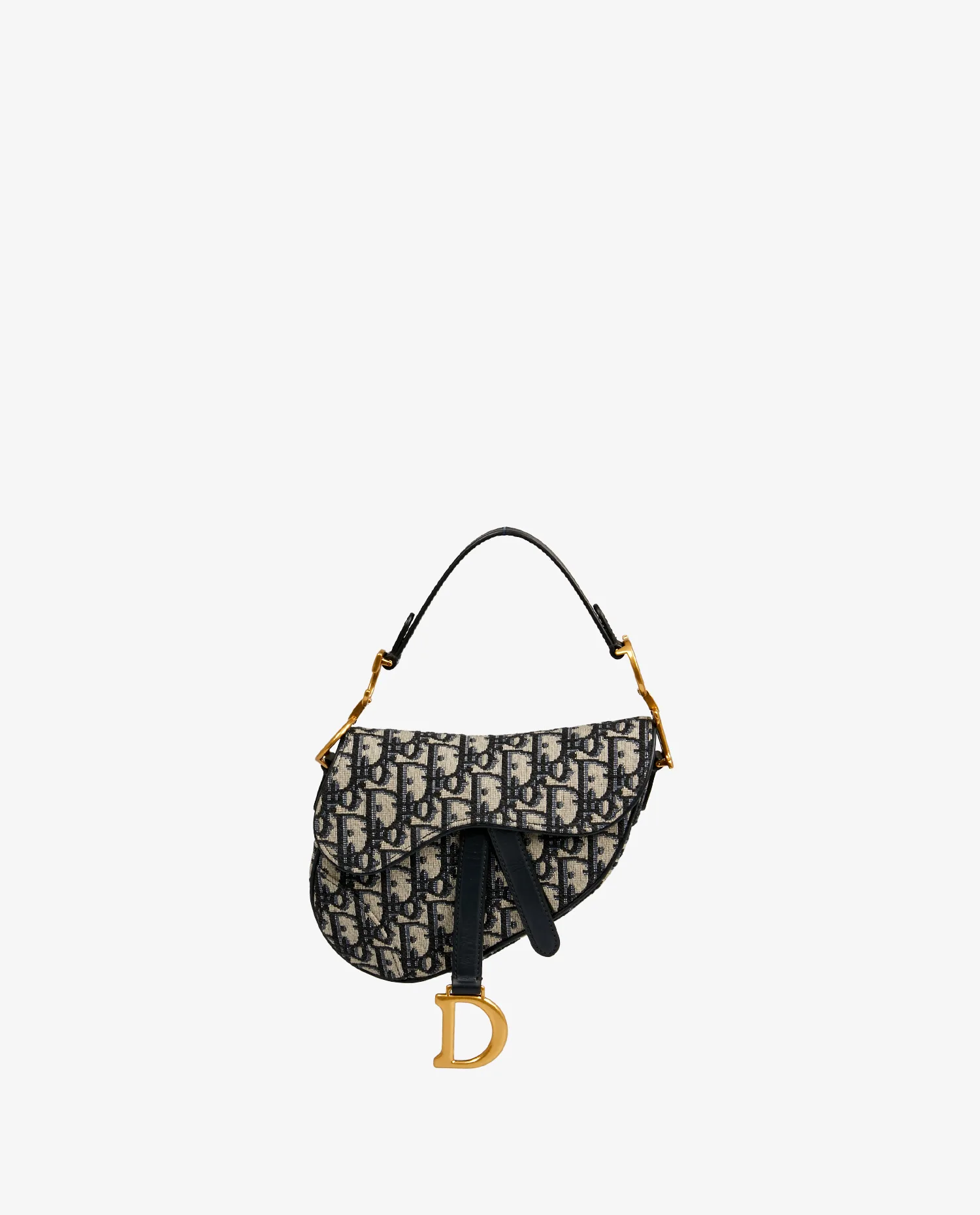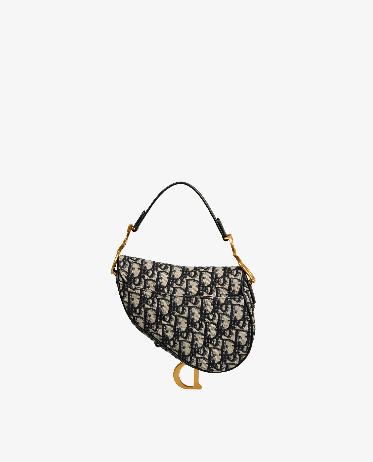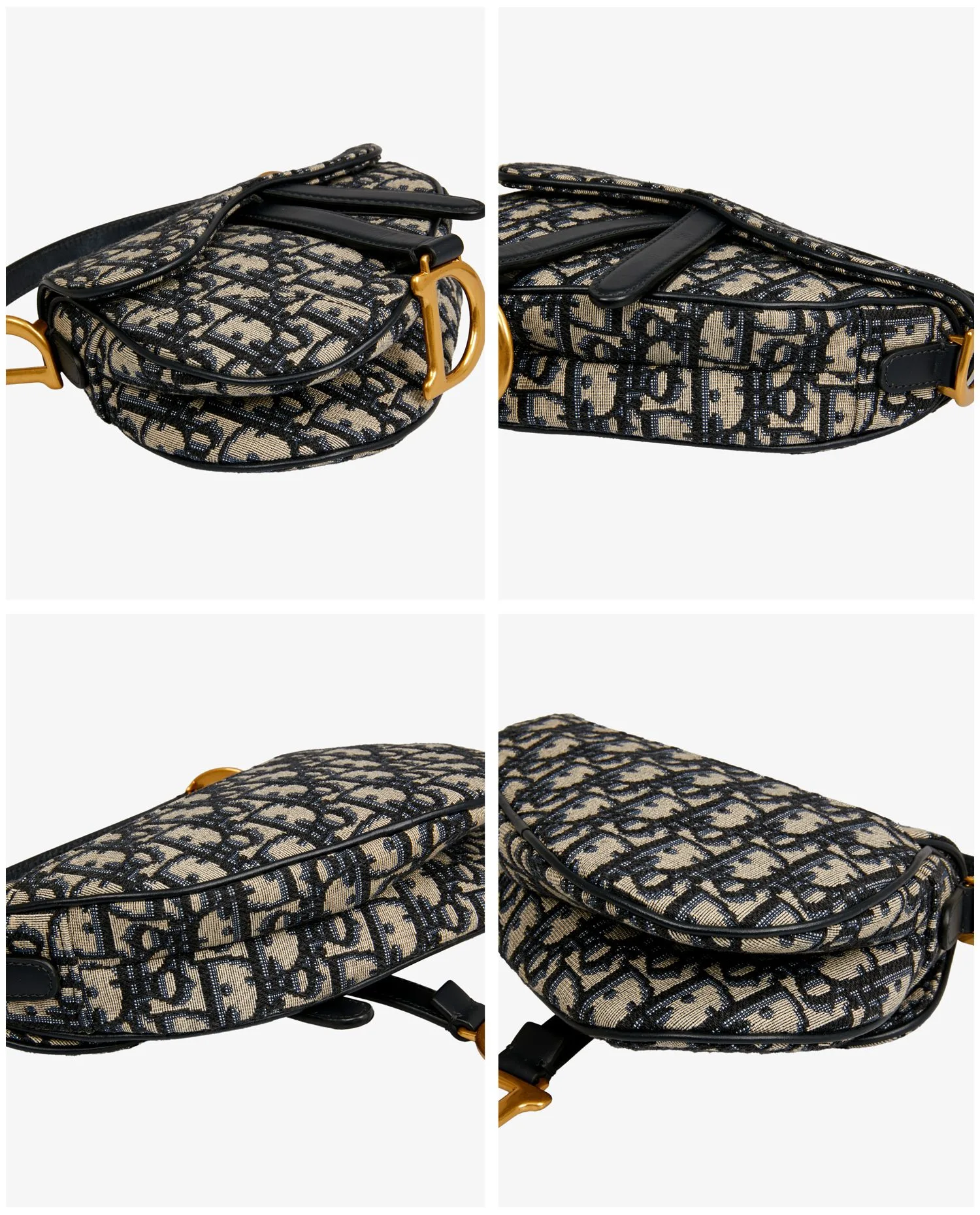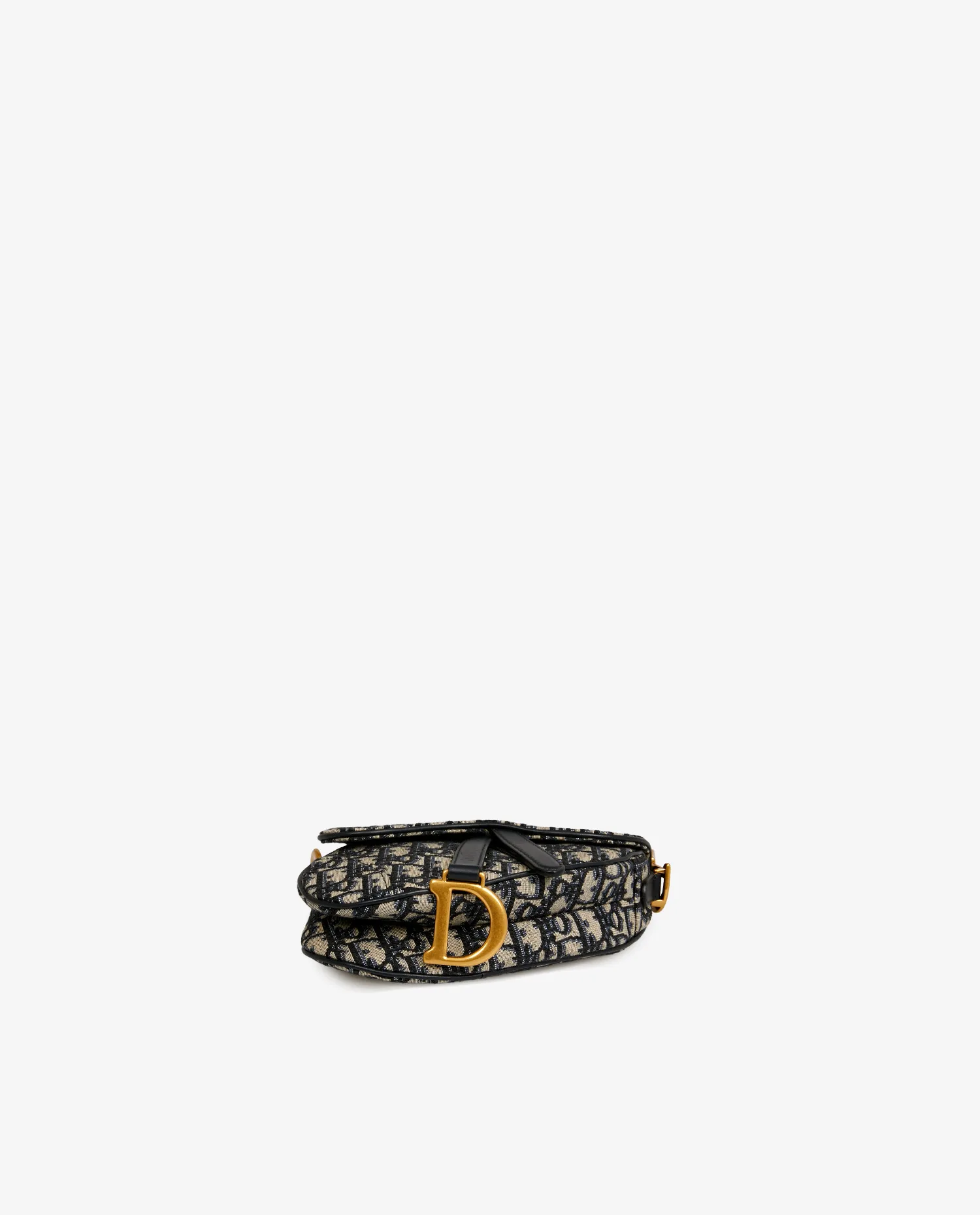 Le sac présente une toile jacquard Dior Oblique bleu sur fond beige, encadrée de finitions en cuir bleu marine. Le rabat à fermeture magnétique dissimulée est orné d’un pendentif rigide « D » en métal doré vieilli, assorti aux crochets latéraux siglés « CD » fixés à la anse courte. L’ensemble conserve la silhouette asymétrique emblématique du modèle Saddle.