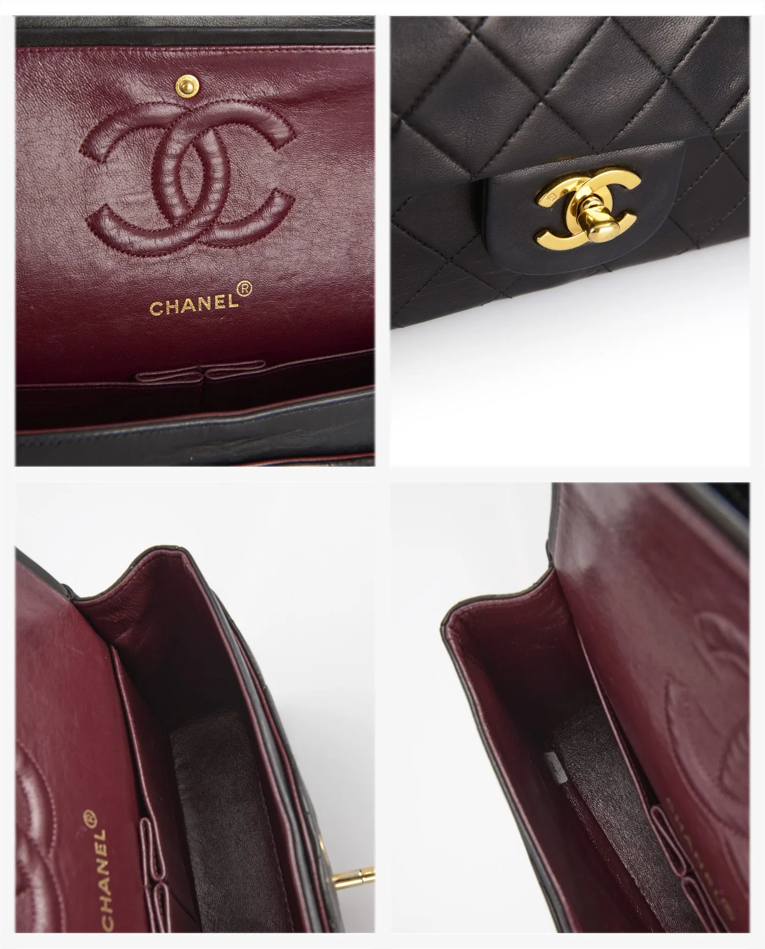 L’intérieur est doublé de cuir bordeaux, teinte historique choisie par Coco Chanel elle-même pour sa capacité à faire ressortir les effets personnels. On y trouve une première poche zippée sous le rabat supérieur, une seconde poche plaquée, une poche à rouge à lèvres et un compartiment principal. L’ensemble est conçu pour optimiser l’organisation, tout en conservant une esthétique sobre. Le logo embossé “Chanel” ainsi que le numéro de série sont visibles à l’intérieur.
