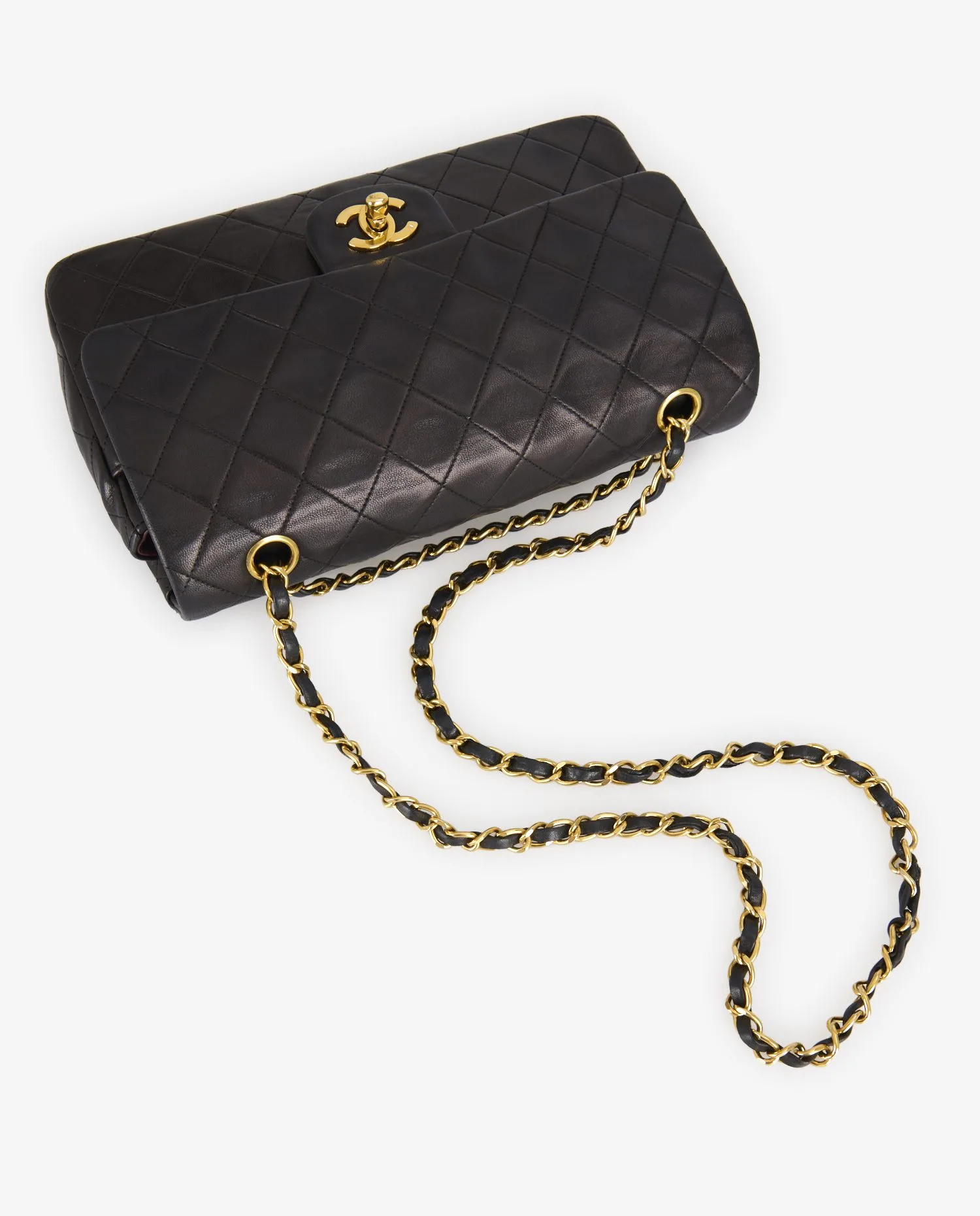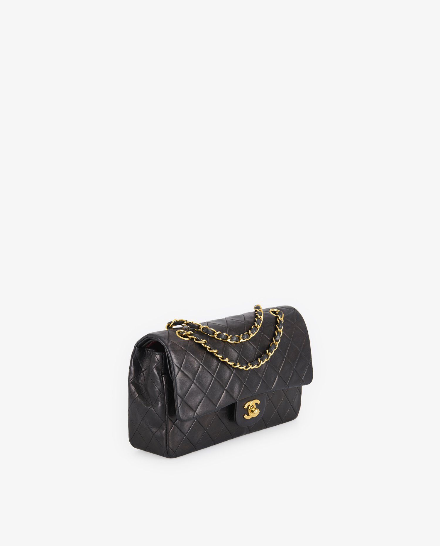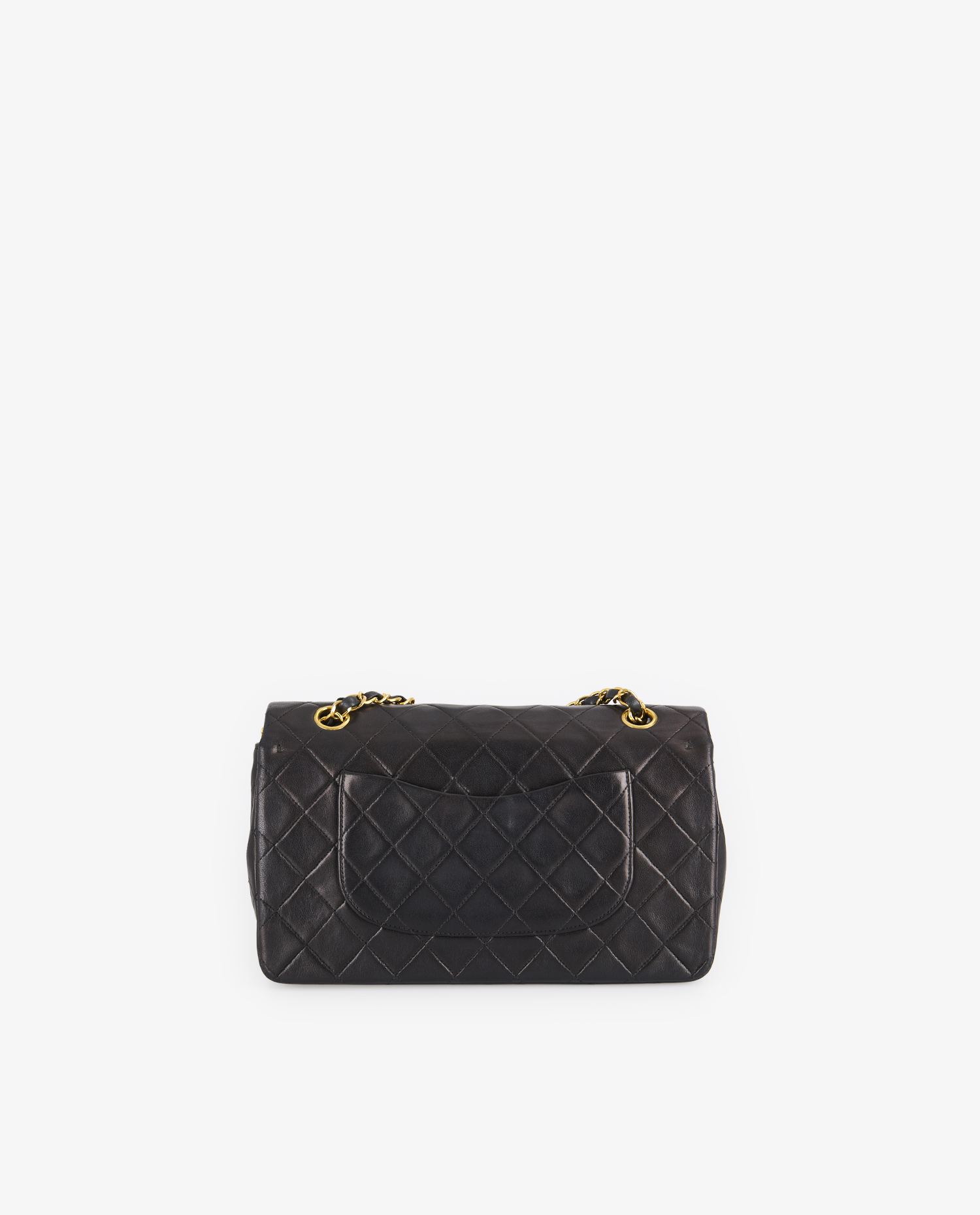 La surface extérieure en cuir d’agneau présente un matelassage régulier en losanges, signature iconique de Chanel. Le fermoir à tourniquet doré arbore le logo CC en relief, avec une brillance encore présente. La chaîne entrelacée de cuir noir et de métal doré permet deux types de portés. Une poche plaquée au dos offre un accès rapide à de petits objets. Le format moyen et la structure rigide assurent un maintien optimal du volume. Les coins présentent une légère patine liée à l’usage, sans perte de forme.