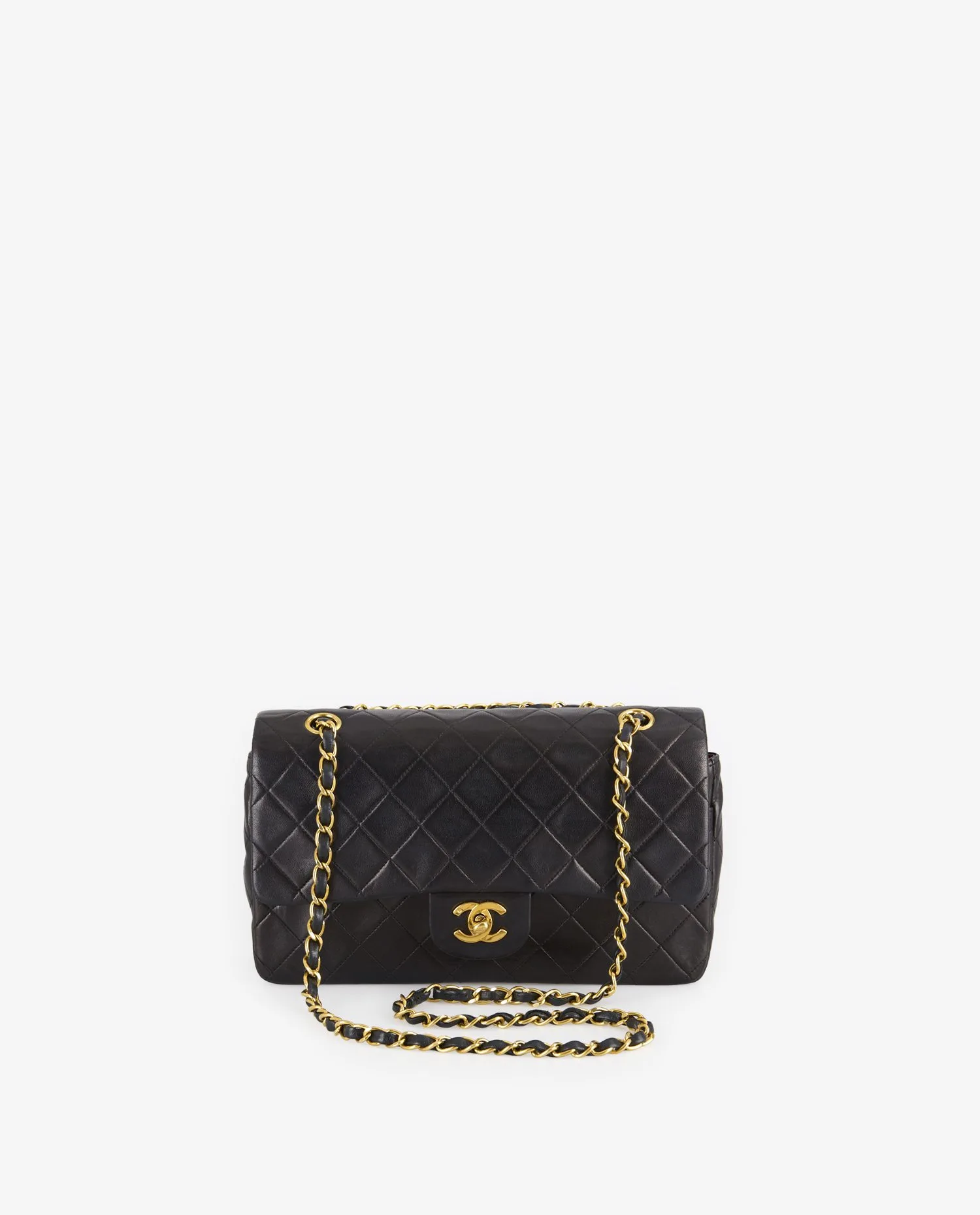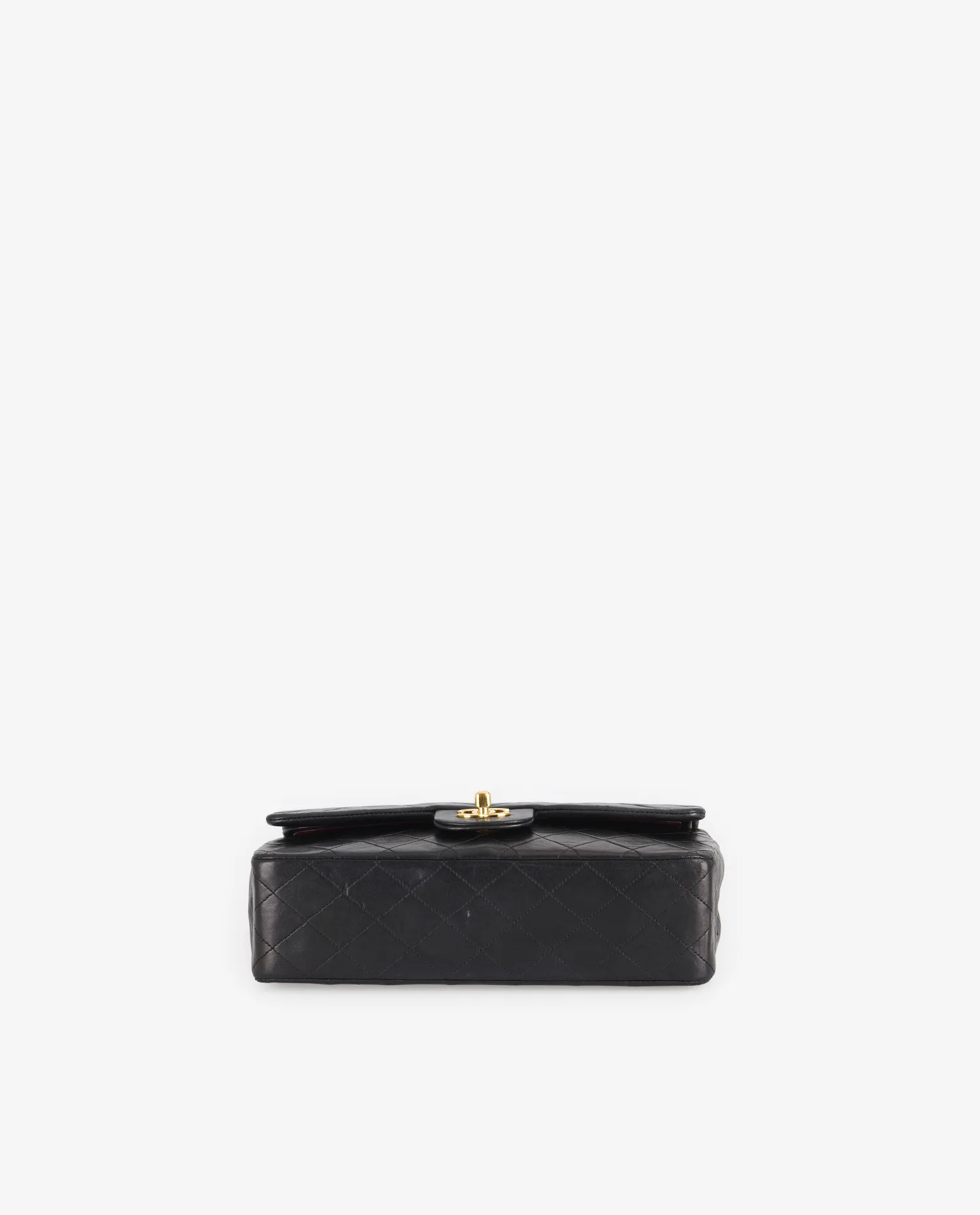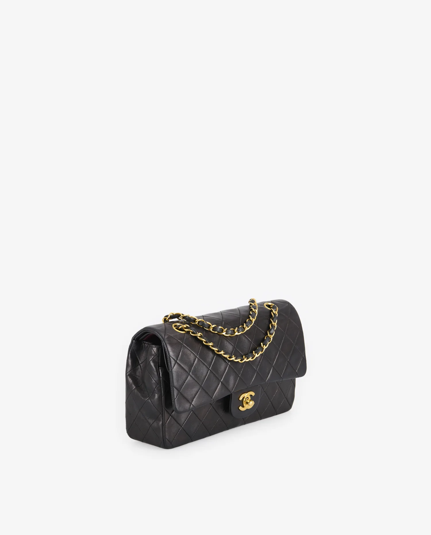 La surface extérieure en cuir d’agneau présente un matelassage régulier en losanges, signature iconique de Chanel. Le fermoir à tourniquet doré arbore le logo CC en relief, avec une brillance encore présente. La chaîne entrelacée de cuir noir et de métal doré permet deux types de portés. Une poche plaquée au dos offre un accès rapide à de petits objets. Le format moyen et la structure rigide assurent un maintien optimal du volume. Les coins présentent une légère patine liée à l’usage, sans perte de forme.