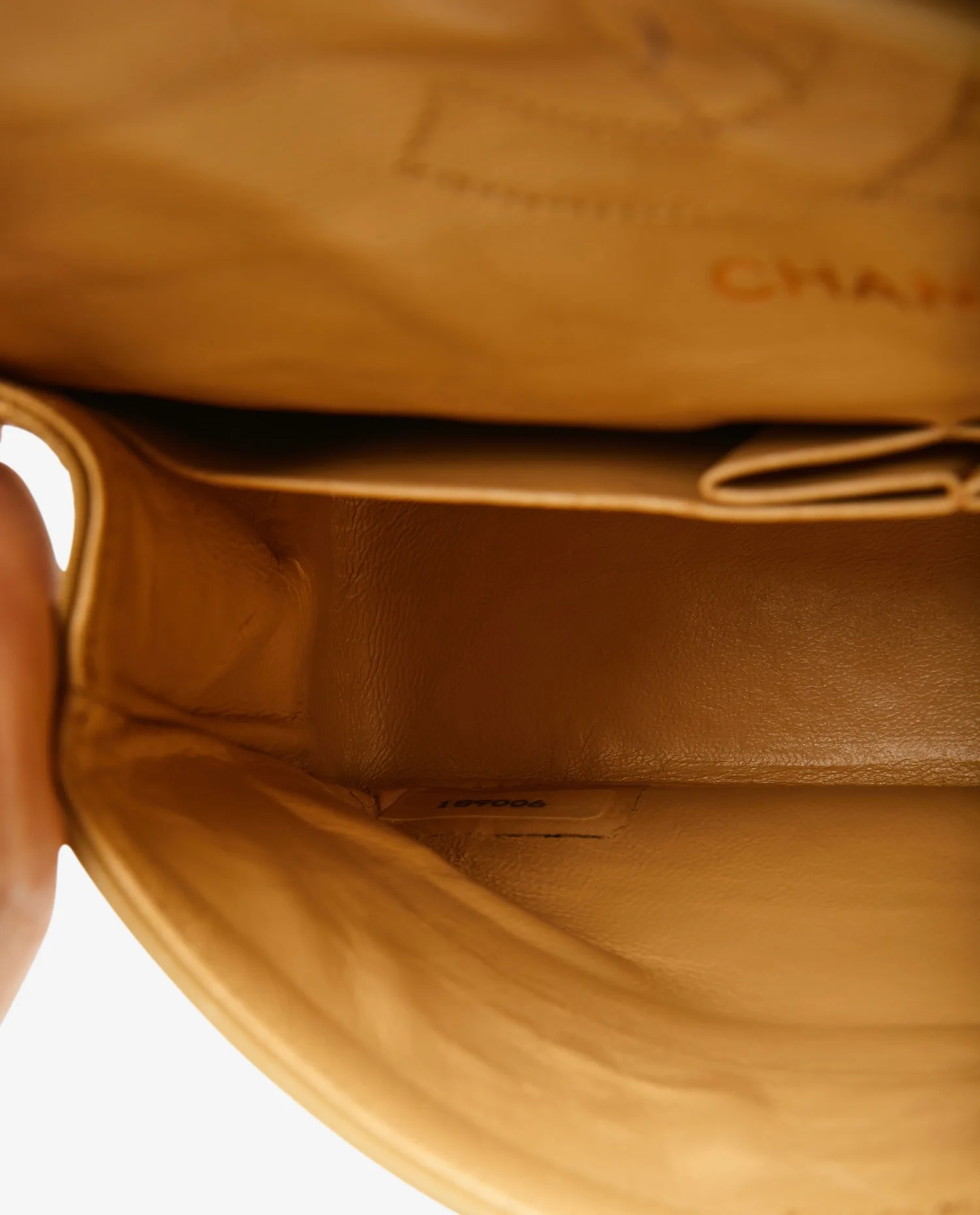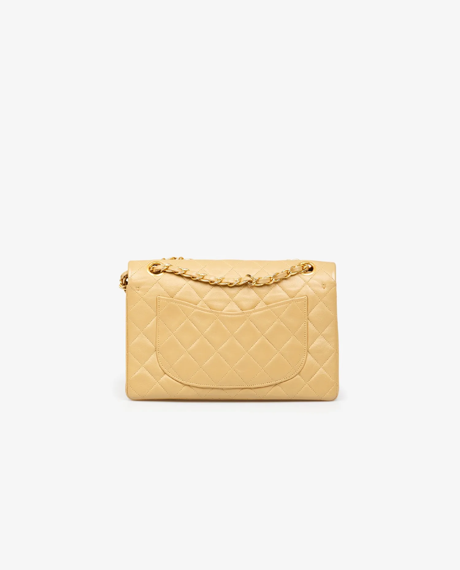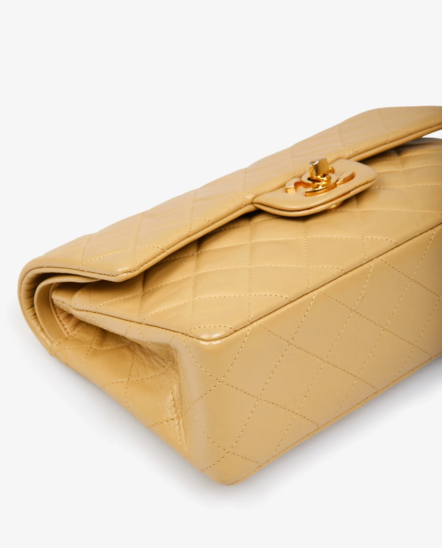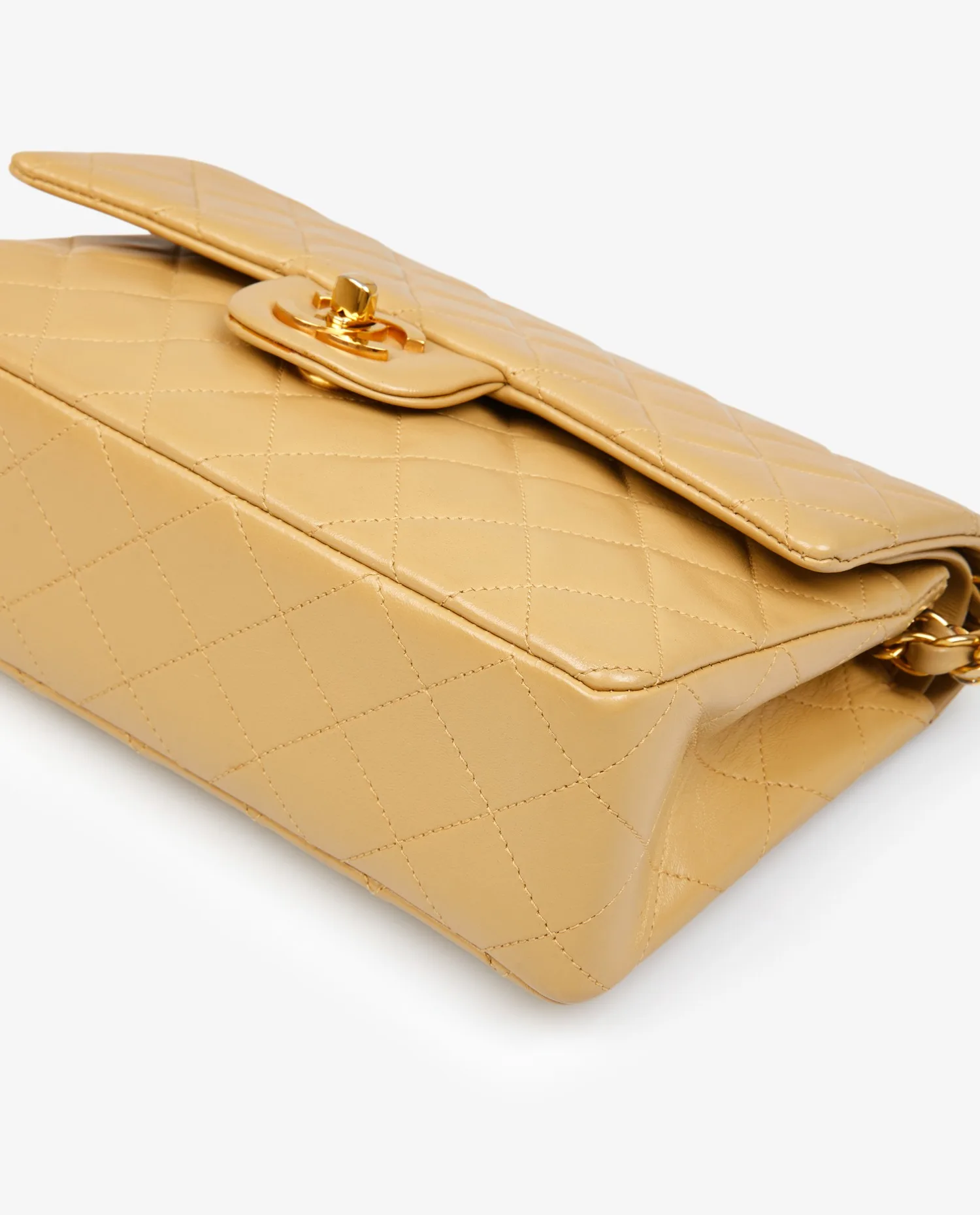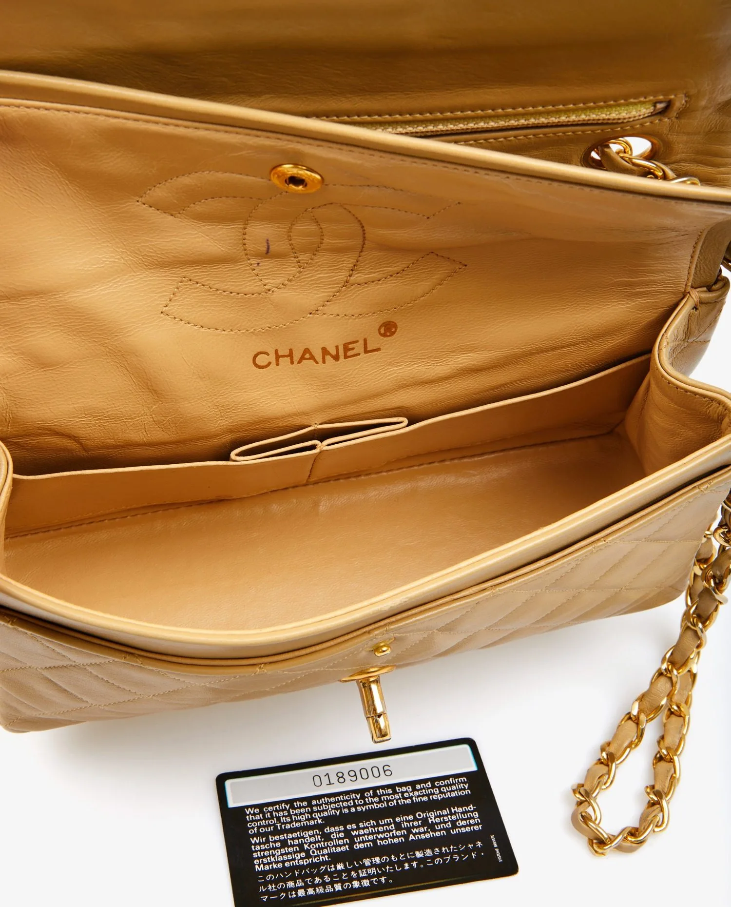 Sac Classique Chanel double rabat matelassé, en cuir d’agneau beige. Porté épaule (76cm). Datant de 1986/88. En très bon état.