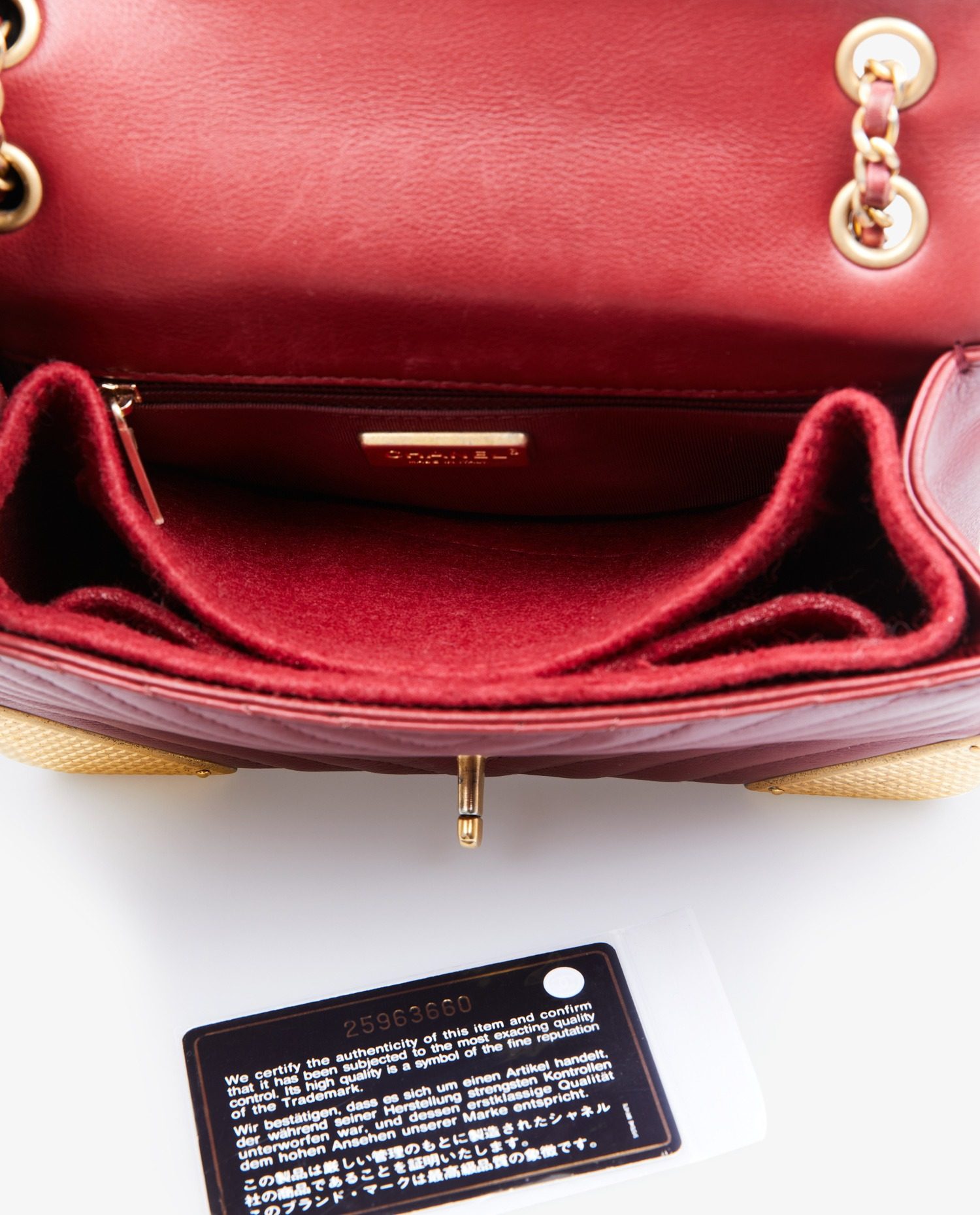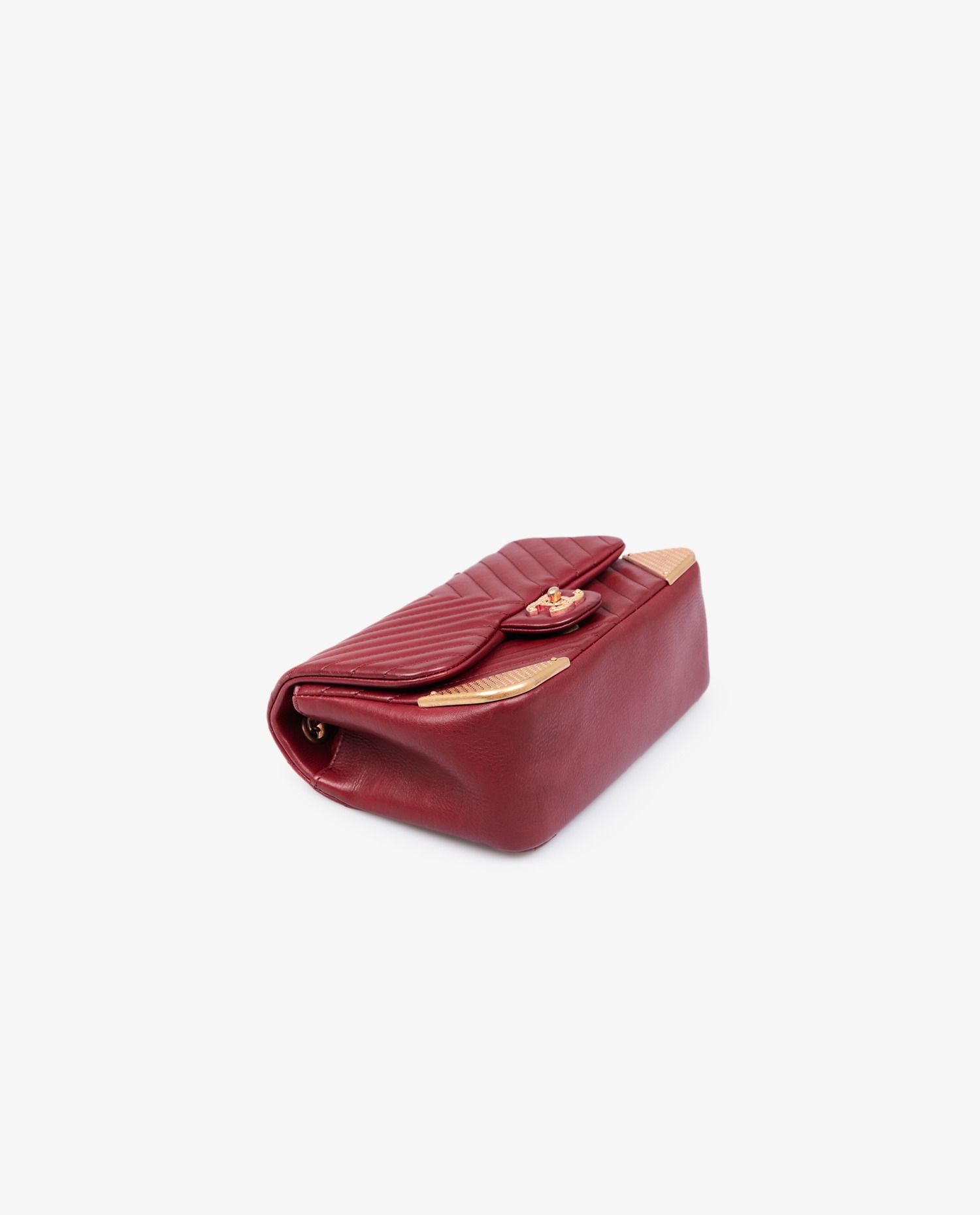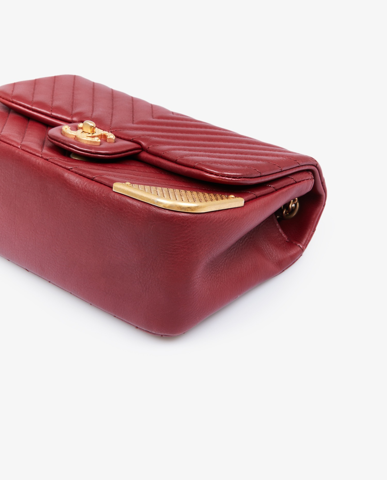 Sac Chanel Classique 20cm chevrons bordeaux. Fermoir doré matelassé et martelé. Fermoir CC. Porté épaule ou bandoulière (94cm). L’intérieur est en tissu. En très bon état.