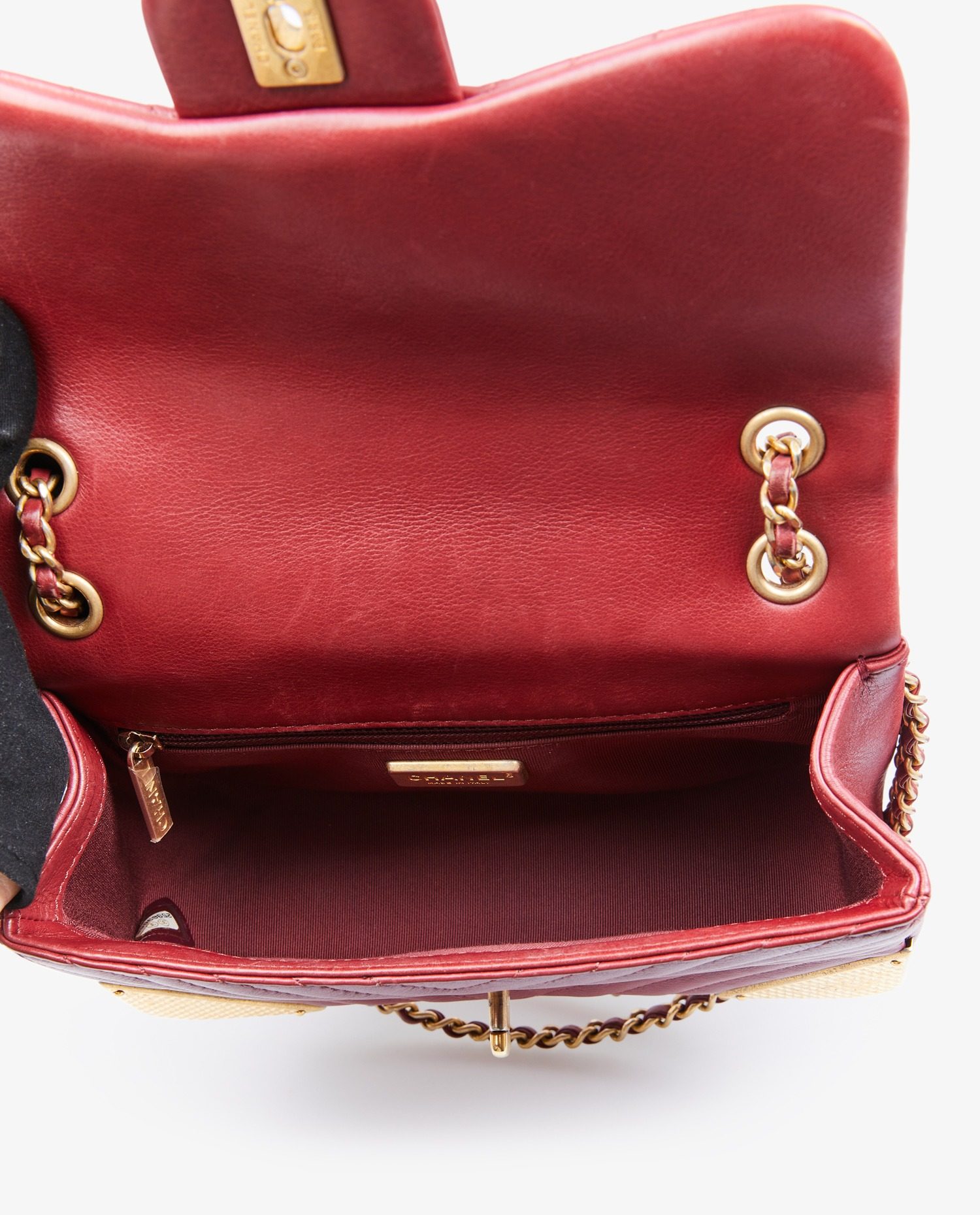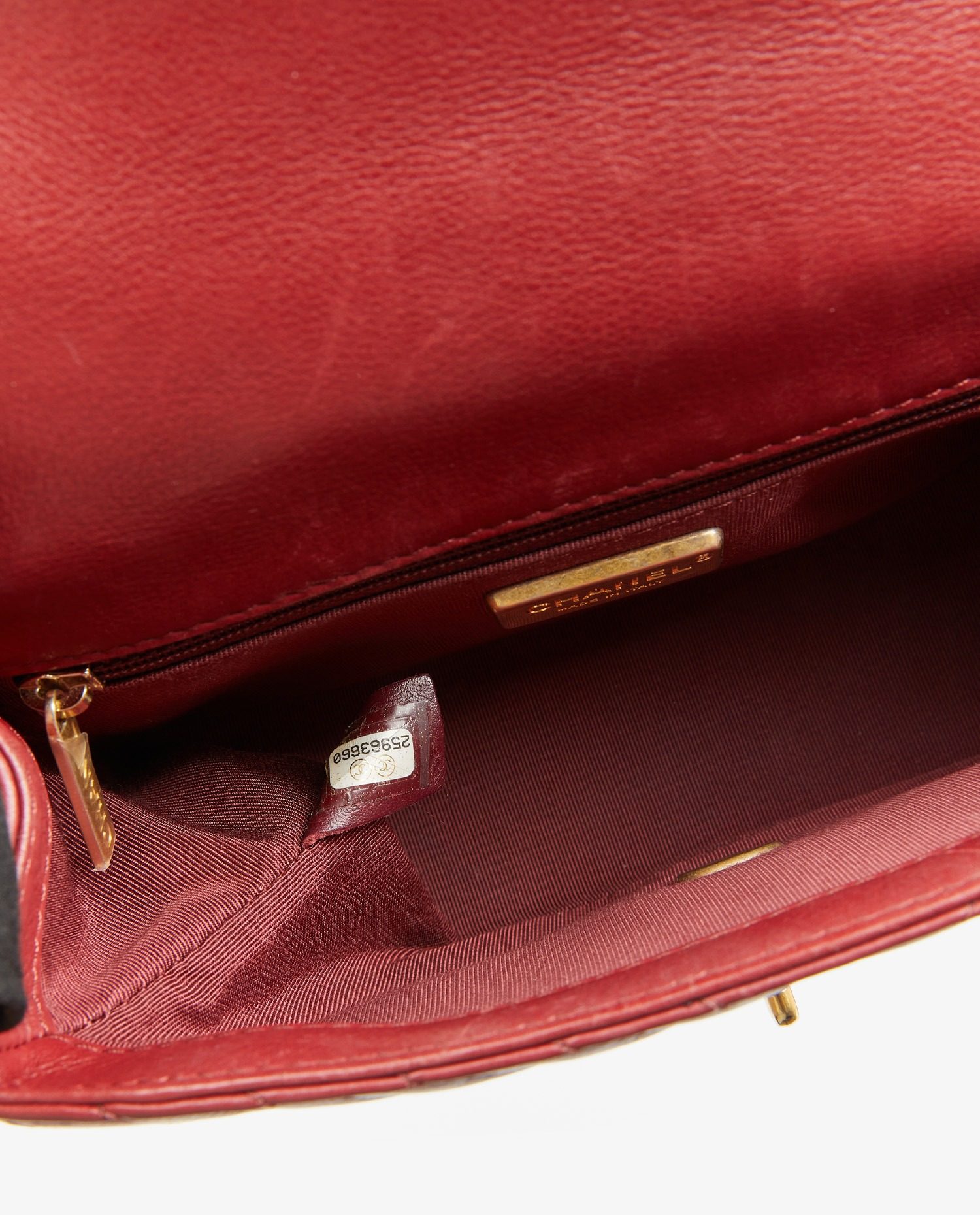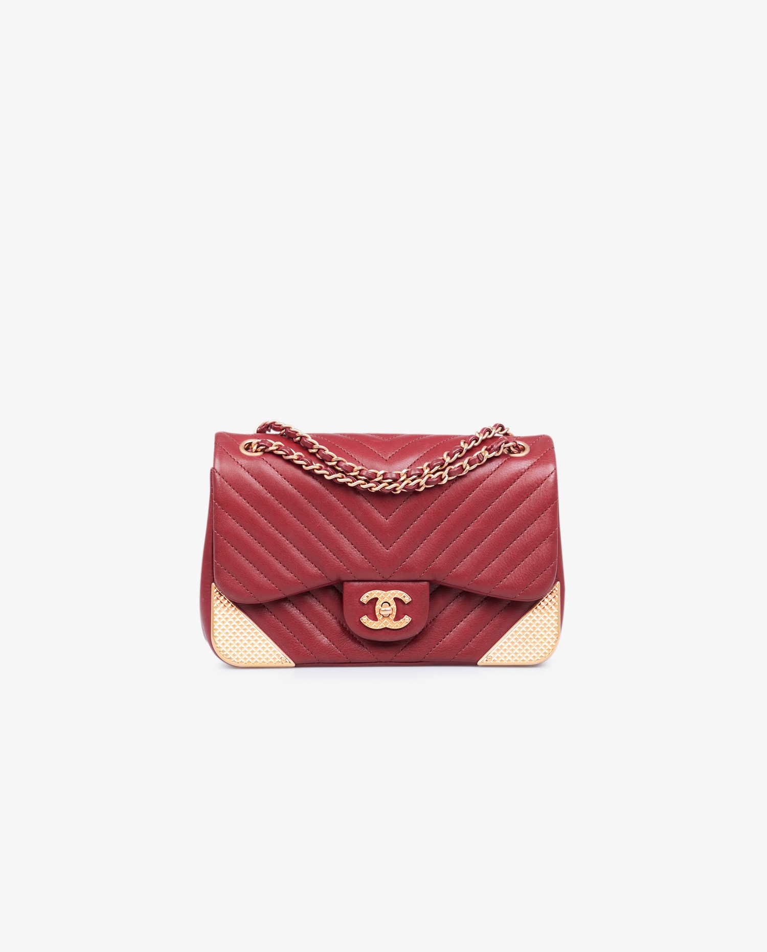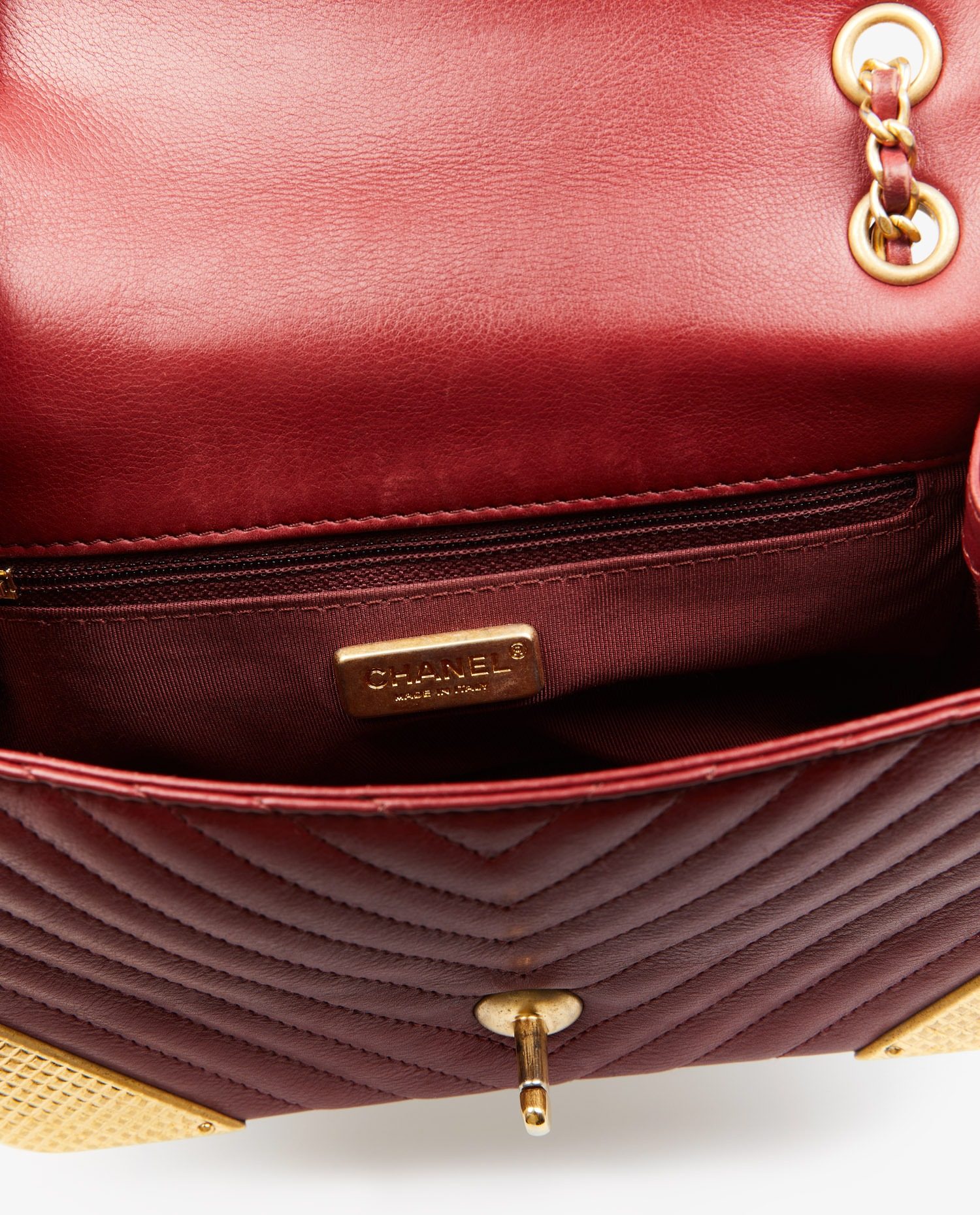 Sac Chanel Classique 20cm chevrons bordeaux. Fermoir doré matelassé et martelé. Fermoir CC. Porté épaule ou bandoulière (94cm). L’intérieur est en tissu. En très bon état.