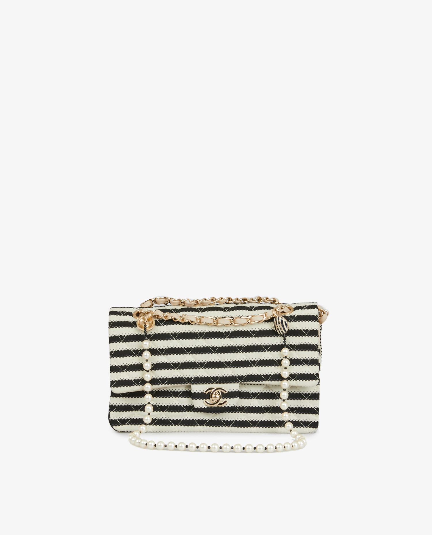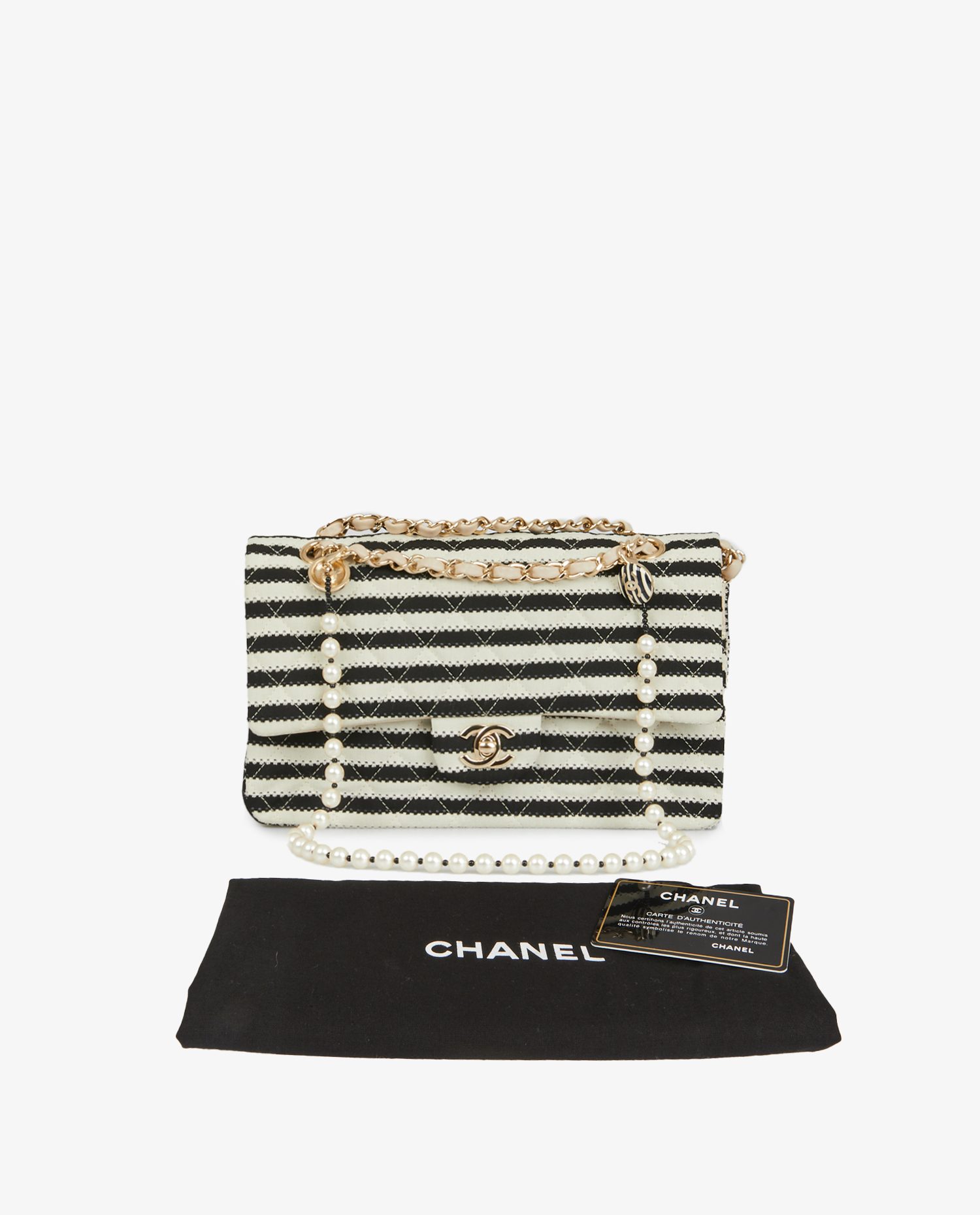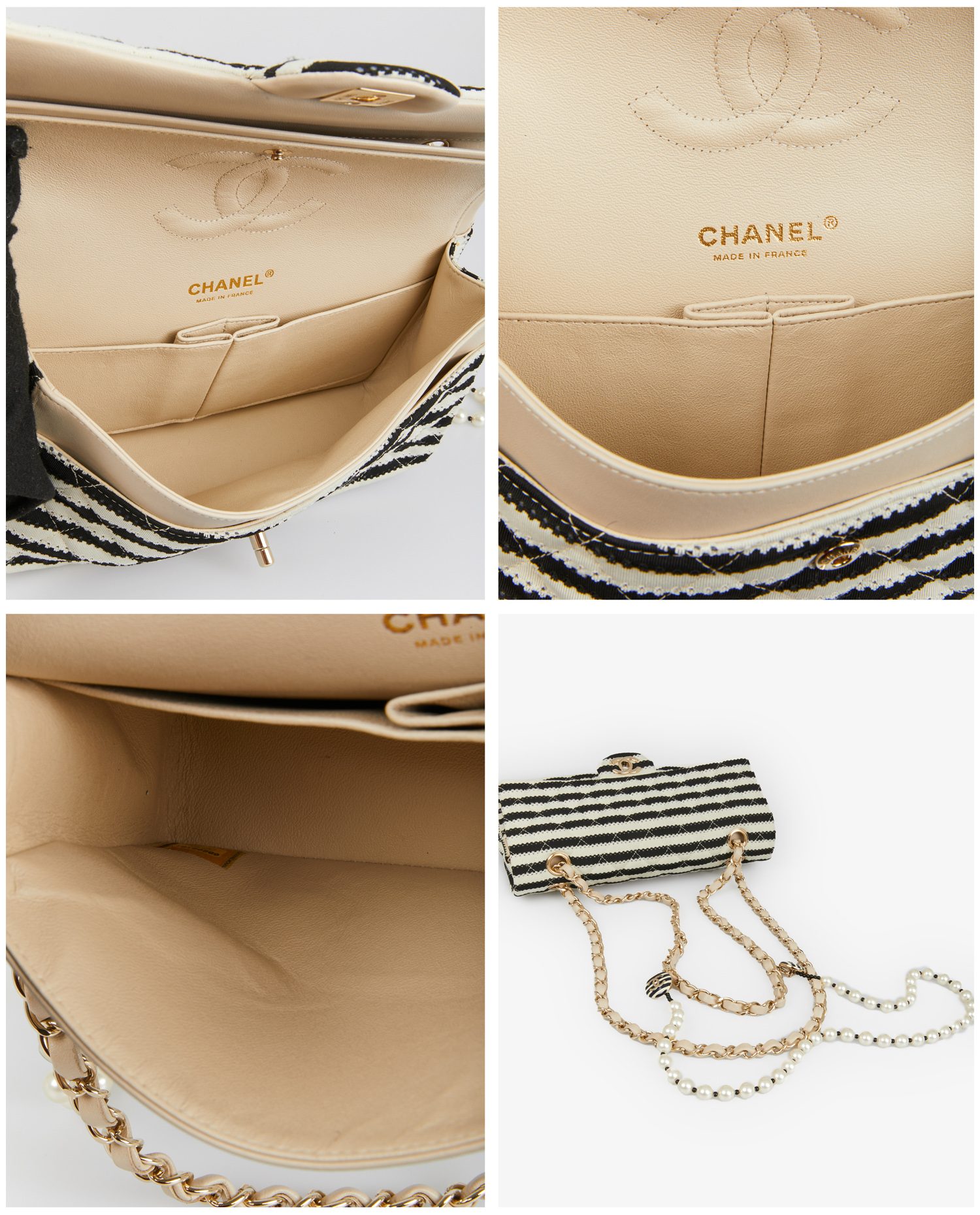 Sac Timeless Chanel Collector en tissu rayé noir et blanc cassé. Double rabat. Fermoir CC. L’intérieur est en cuir beige. Chaine (66cm) dorée et cuir (110cm) et une autre amovible avec des perles. En très bon état. Livré dans son dustbag d’origine.
