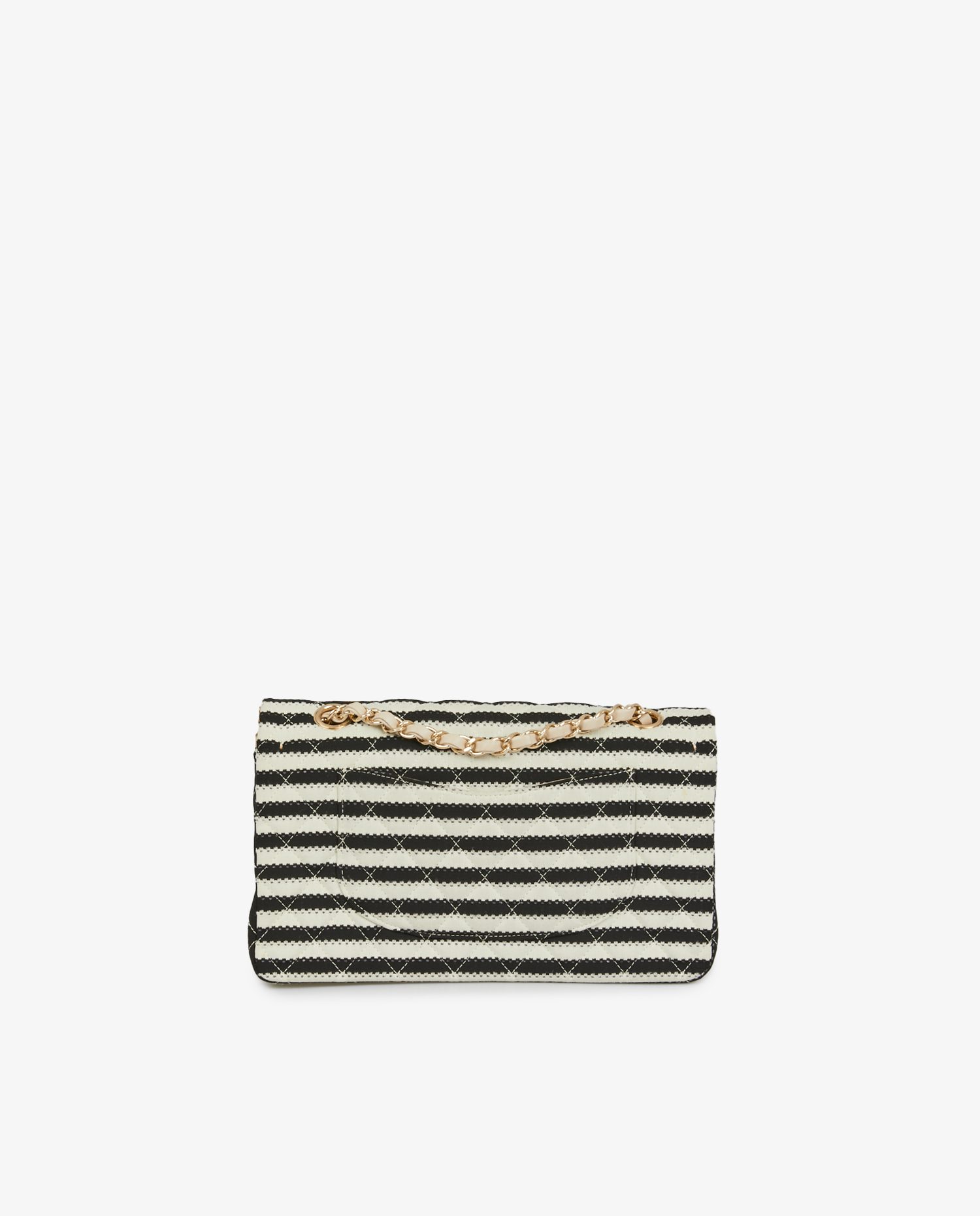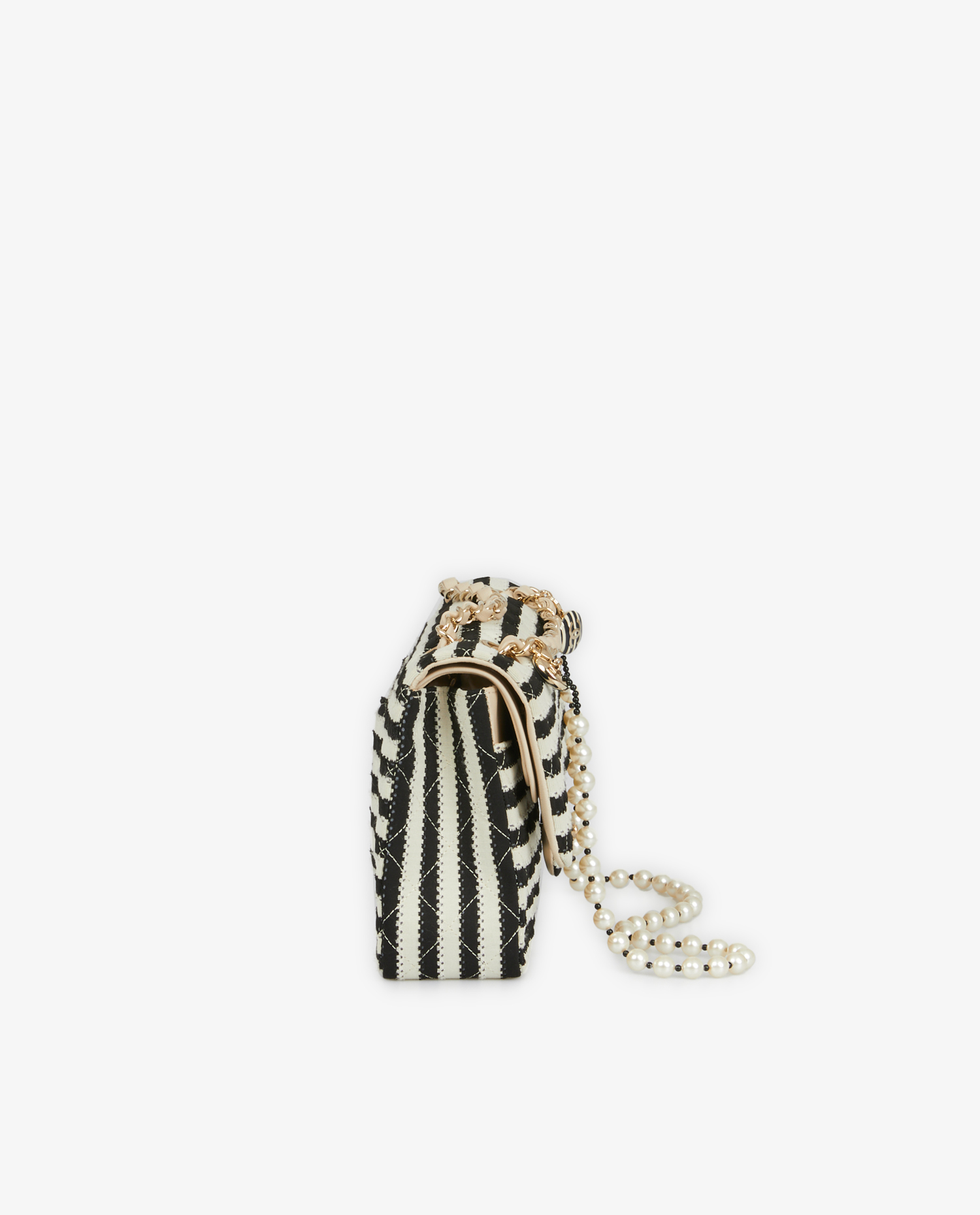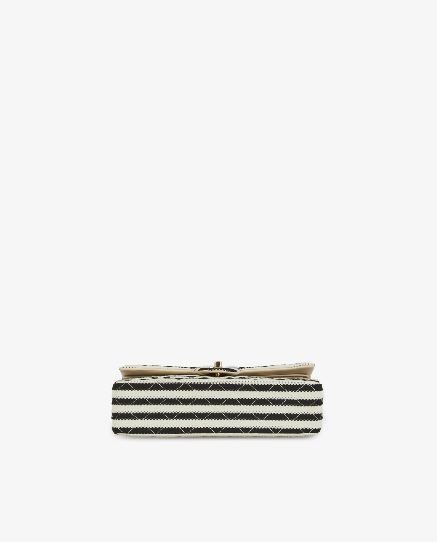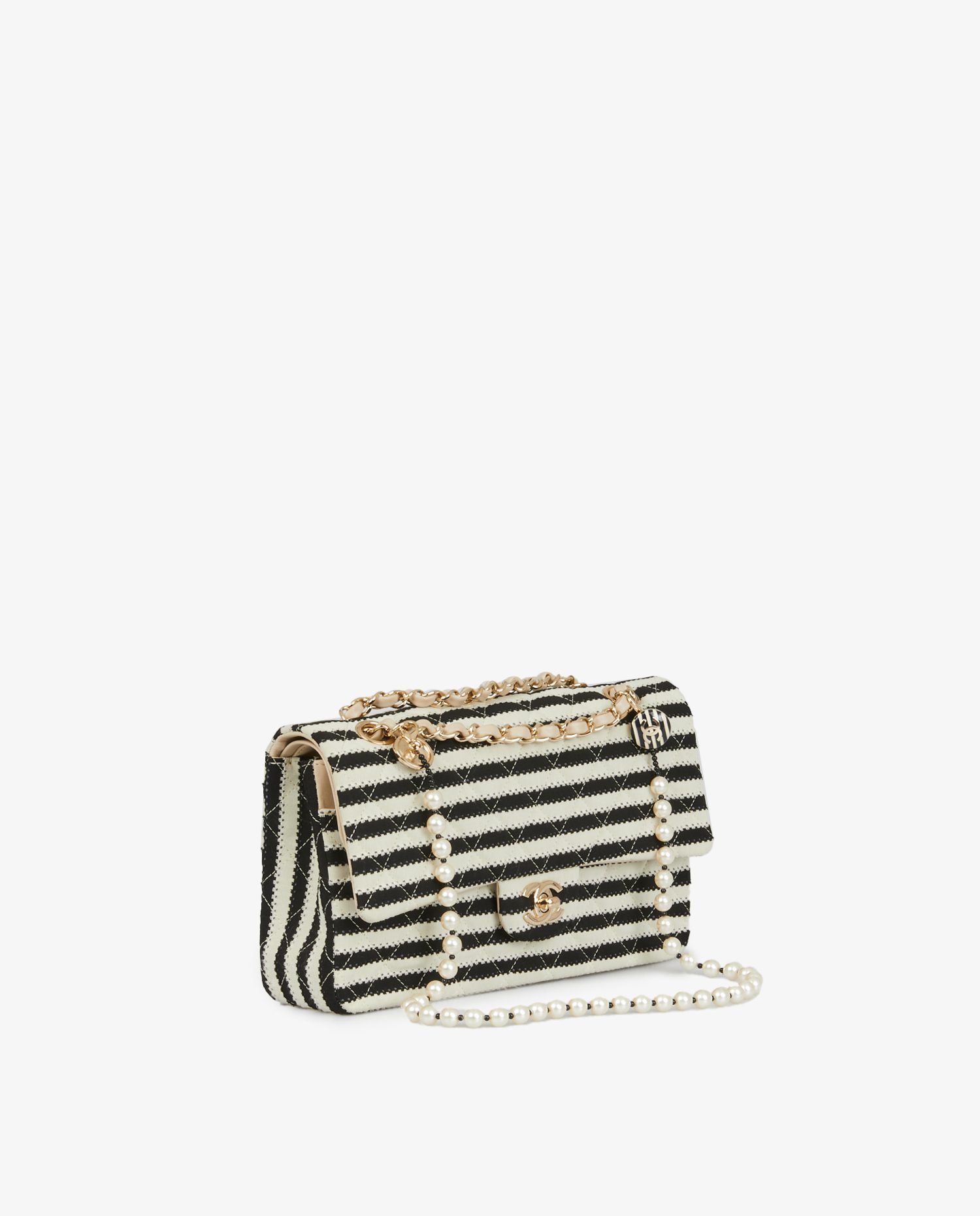 Sac Timeless Chanel Collector en tissu rayé noir et blanc cassé. Double rabat. Fermoir CC. L’intérieur est en cuir beige. Chaine (66cm) dorée et cuir (110cm) et une autre amovible avec des perles. En très bon état. Livré dans son dustbag d’origine.