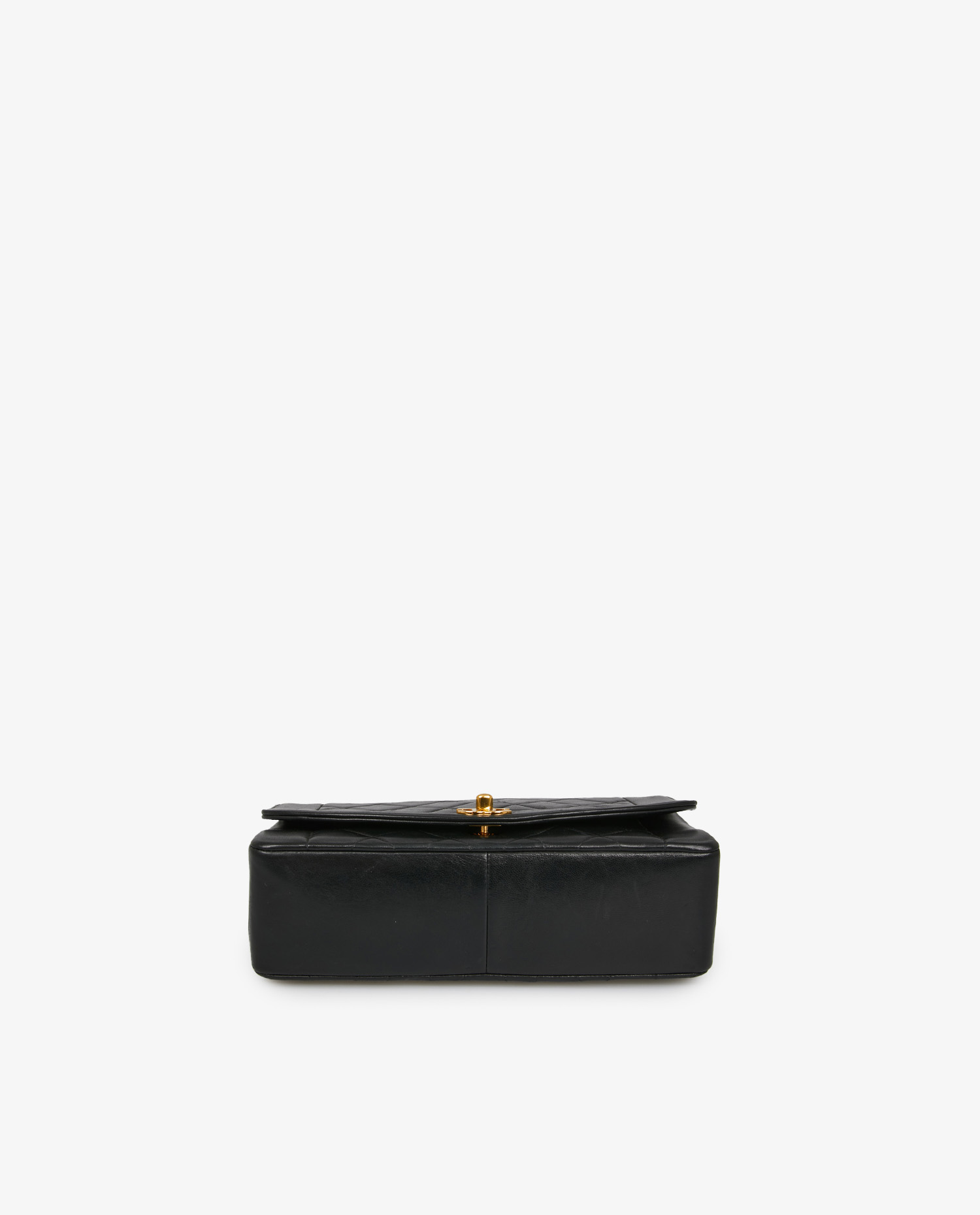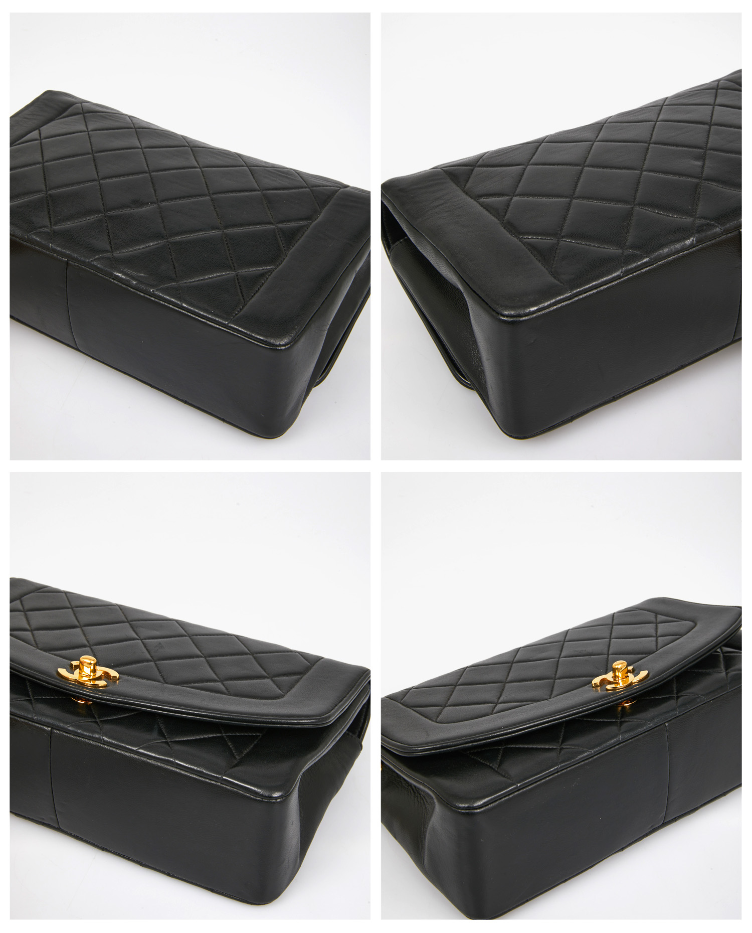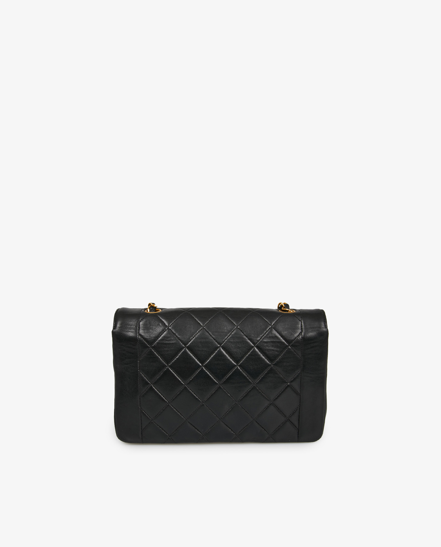 Le cuir d’agneau noir présente un matelassage en losange régulier et une finition satinée caractéristique des sacs Chanel vintage. Le rabat est souligné d’un liseré en cuir lisse, élément signature du modèle Diana. Le fermoir CC en métal doré conserve une belle brillance, sans oxydation visible. La bandoulière chaîne dorée entrelacée de cuir noir permet un porté épaule élégant. Le dos du sac reste sobre, sans poche extérieure, renforçant la pureté de ses lignes.