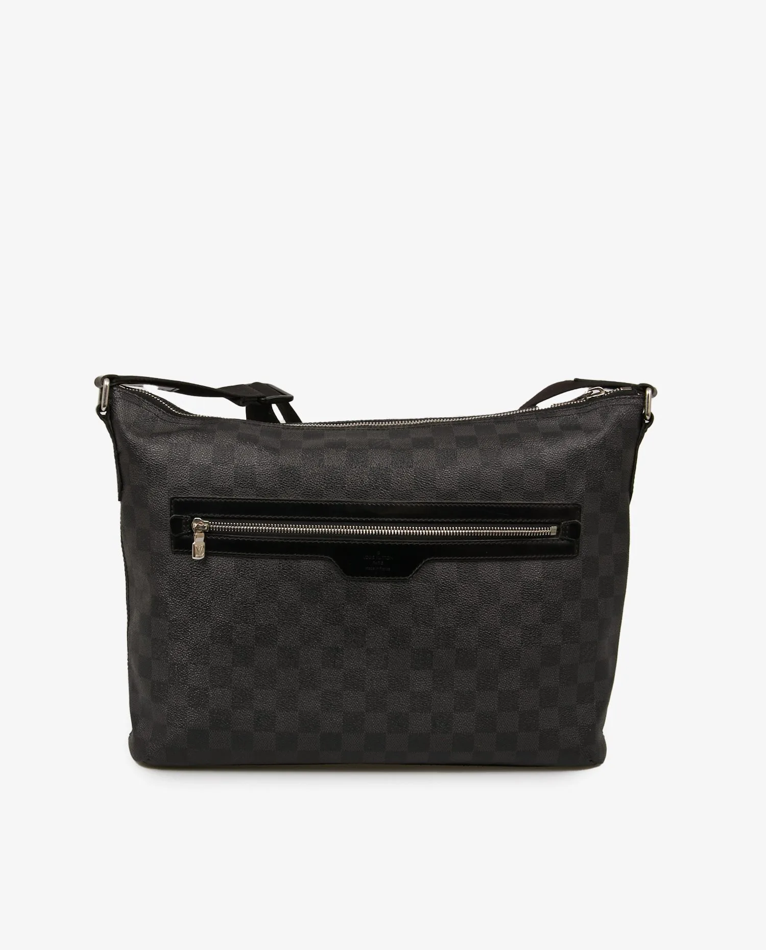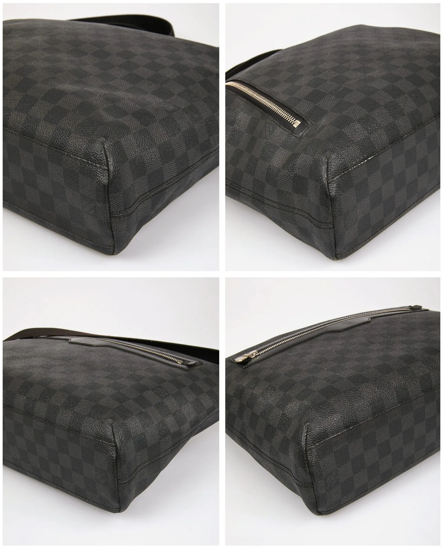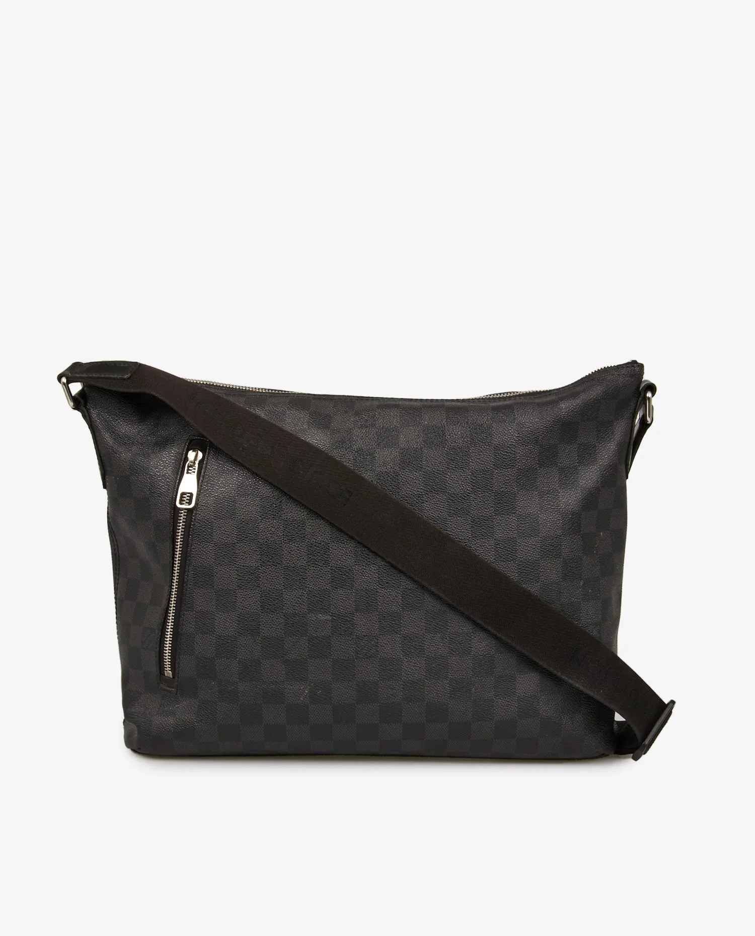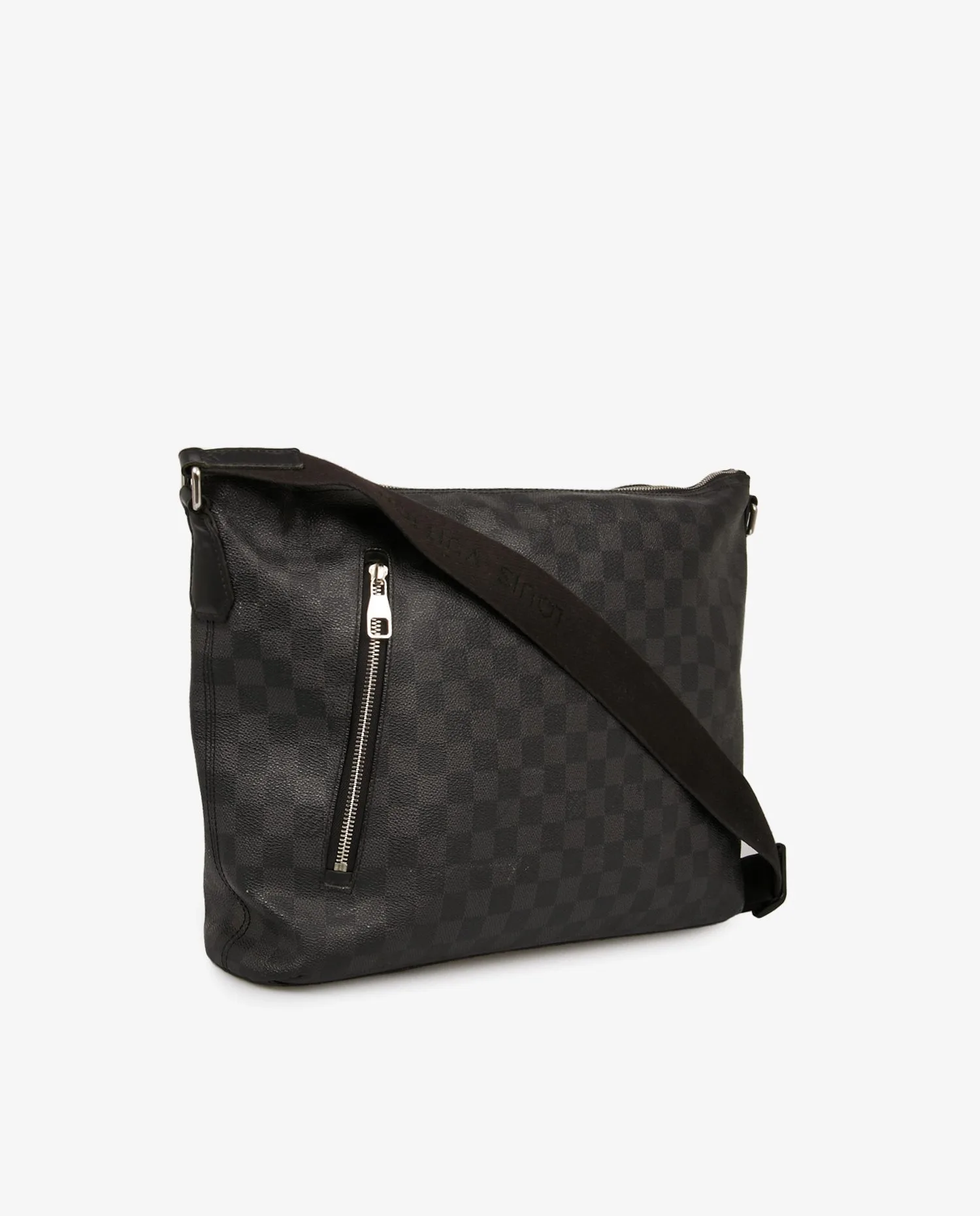 La toile Damier Graphite est constituée de damiers gris foncé et noirs imprimés sur une toile enduite à la texture grainée, résistante à l’eau et aux rayures. Le sac est orné de garnitures en cuir noir lisse sur les côtés et autour des fermetures. La poche extérieure frontale zippée est soulignée par une garniture en cuir embossé du logo Louis Vuitton Paris. Les éléments métalliques en laiton argenté poli (fermetures zippées, anneaux d’attache de bandoulière) présentent quelques micro-rayures liées à l’usage. La bandoulière en toile noire est réglable, avec le nom Louis Vuitton tissé en ton sur ton.