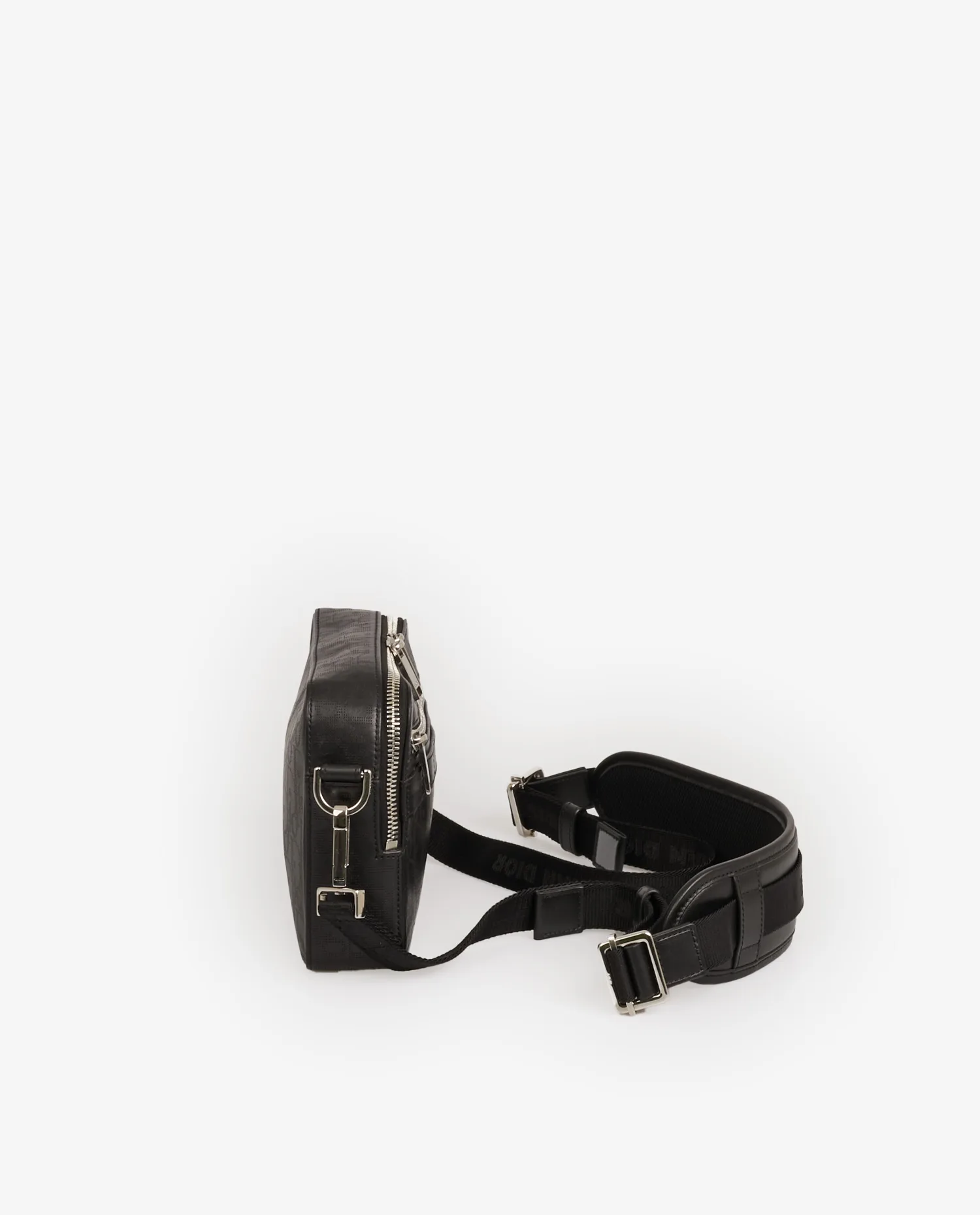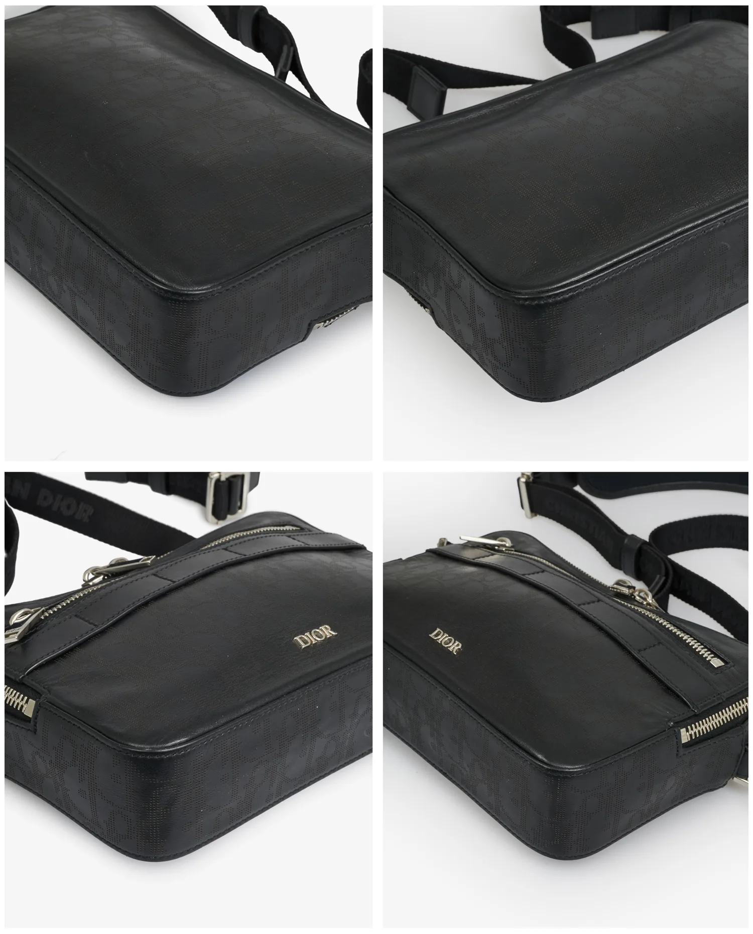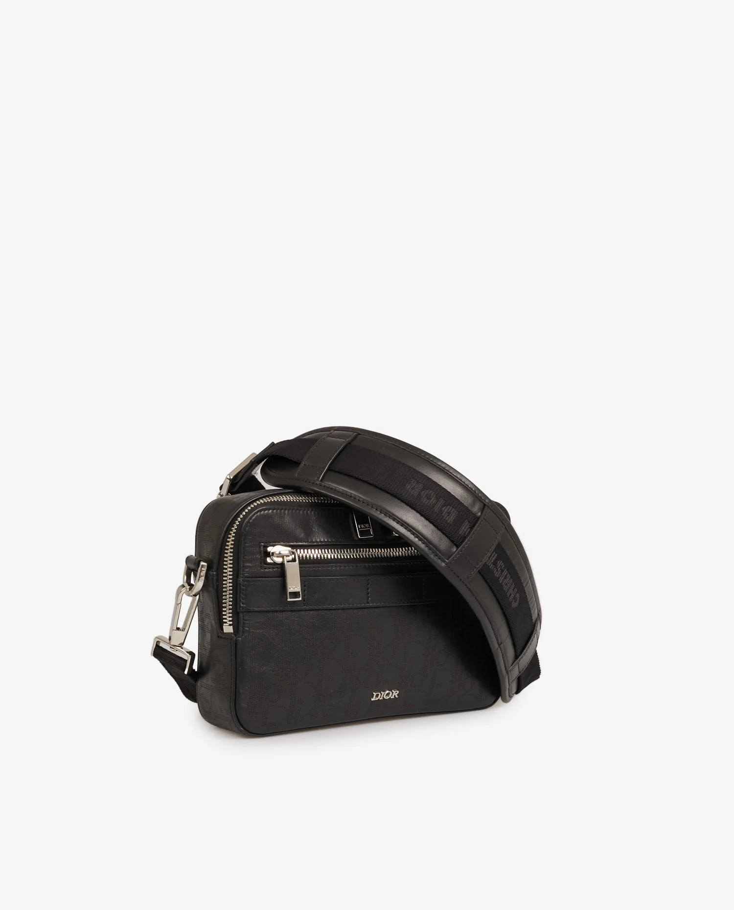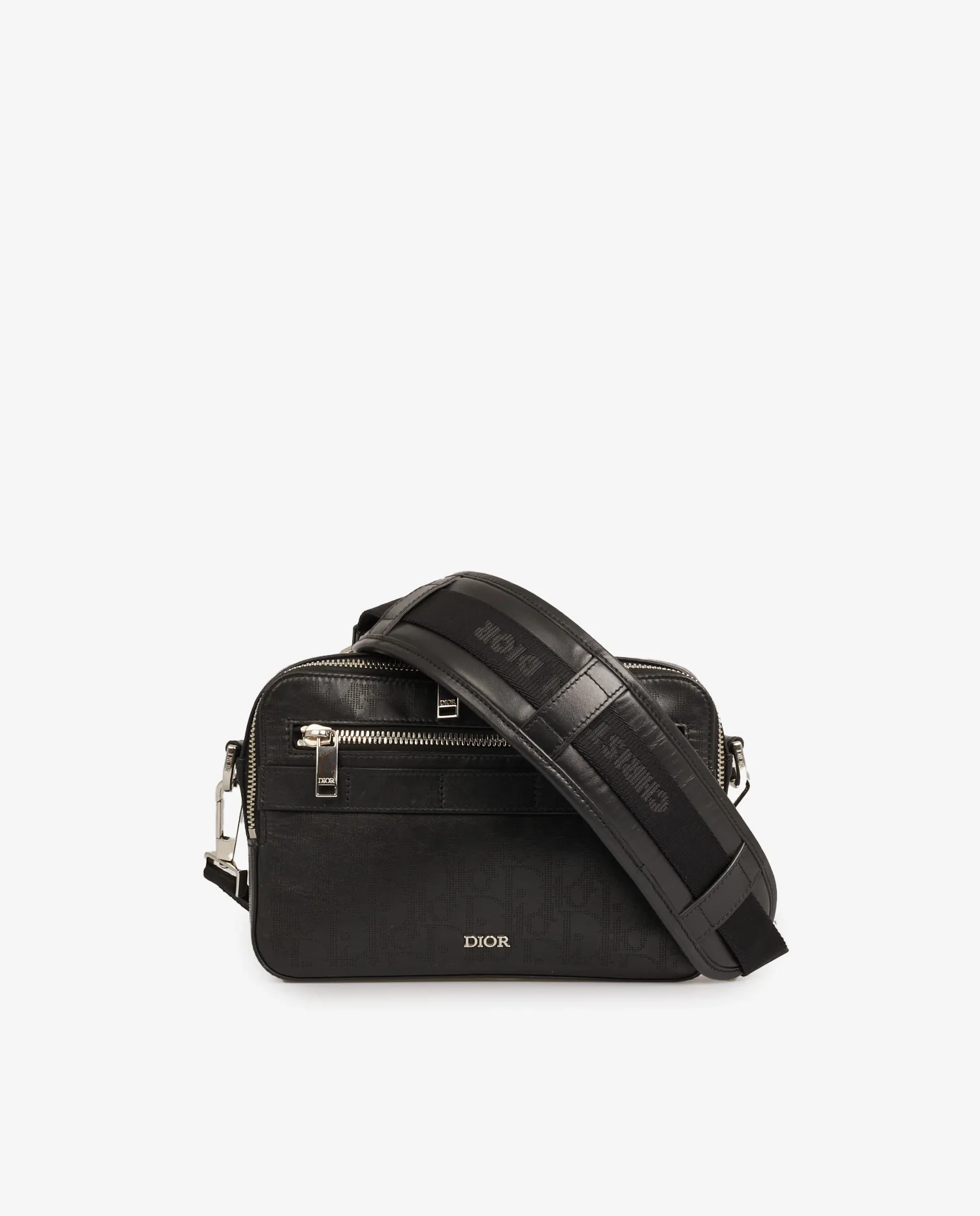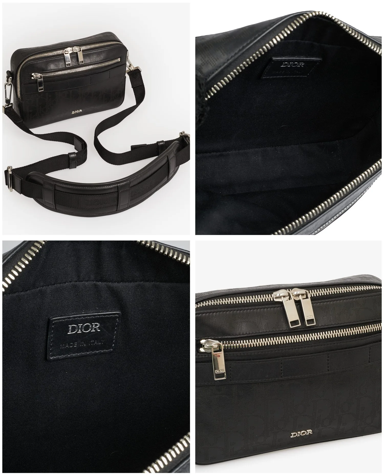 Sacoche Dior en cuir perforé noir. Bijouterie argent. Fermeture zippée. Porté croisé avec une bandoulière réglable et amovible. En très bon état.