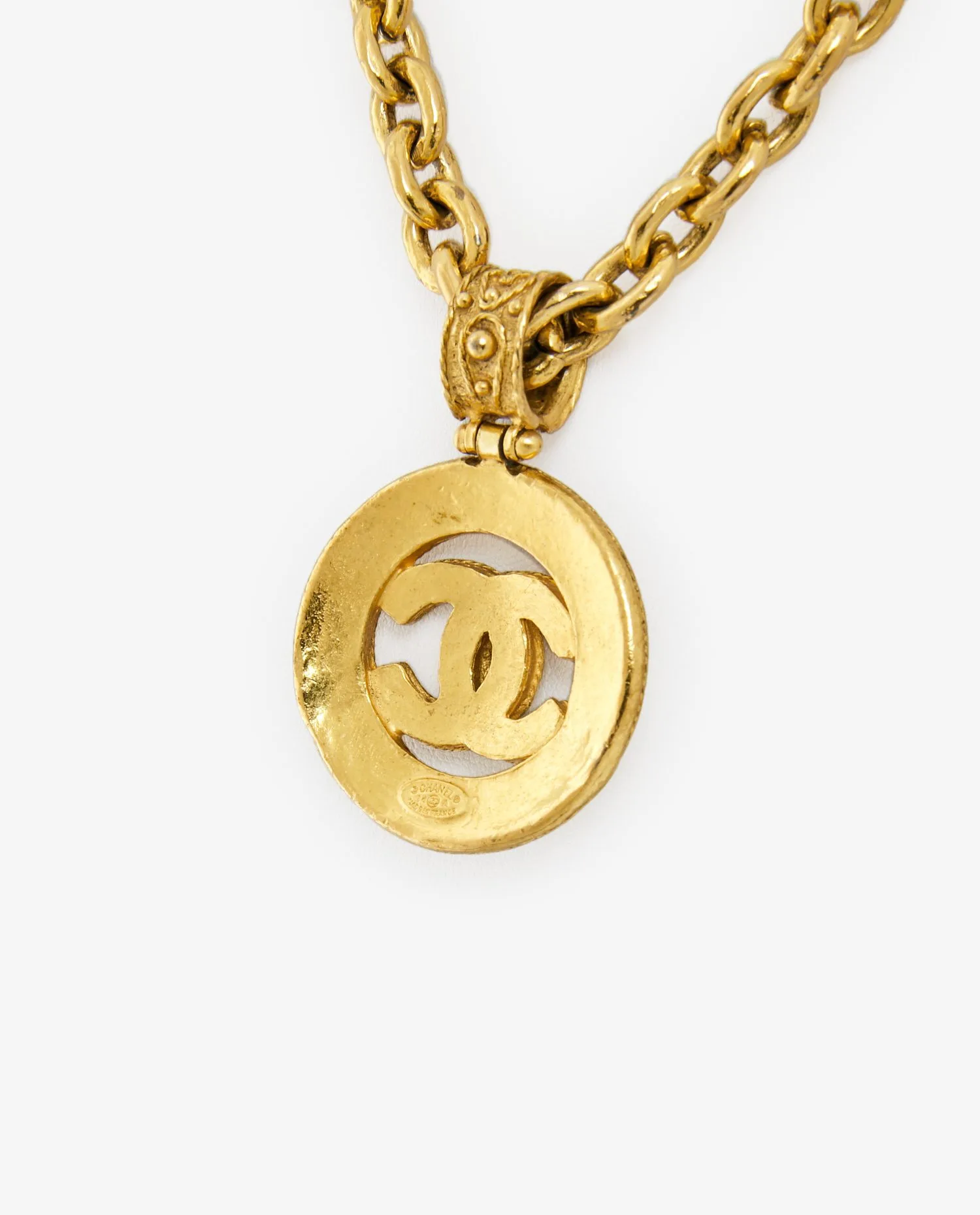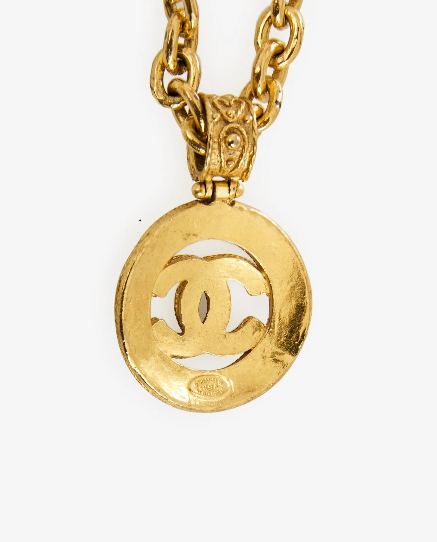 Long sautoir Chanel en chaine dorée vintage. Le pendentif est en forme de rond avec un CC à l’intérieur. La longueur de la chaine est de 93cm. Collection Automne 1994, le poinçon est à l’arrière. En très bon état. Livré dans une boite et un dustbag Old Fashioned Club.