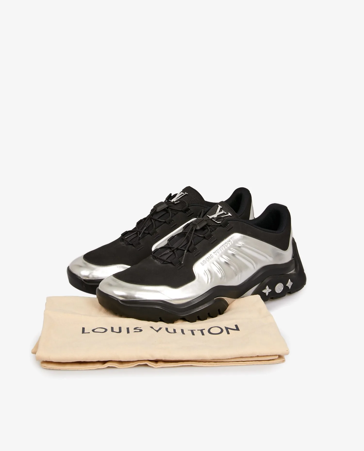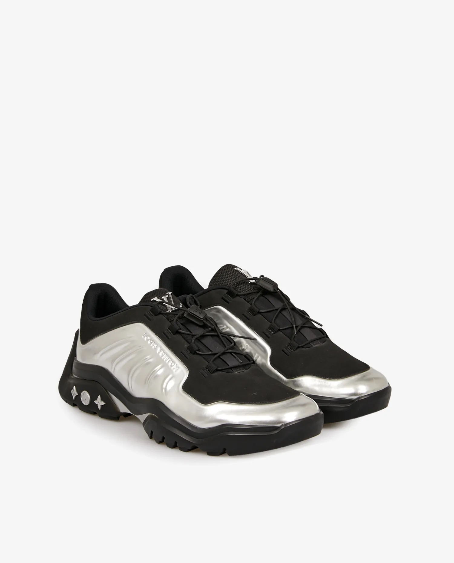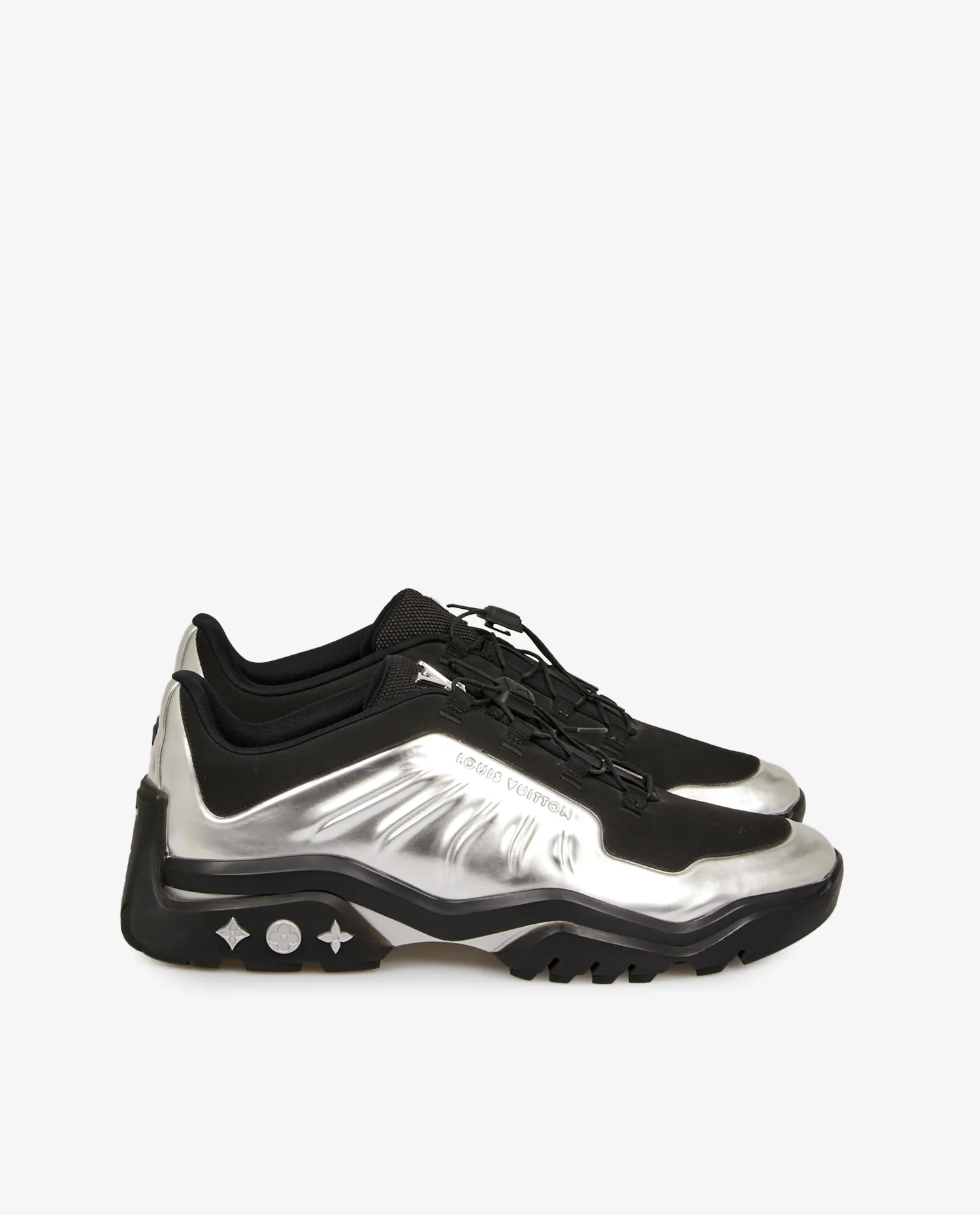 Inspirée de la célèbre Air Foamposite, cette sneaker au design futuriste a été imaginée par Virgil Abloh pour Louis Vuitton. Confectionnée en toile argentée métallisée, elle se distingue par sa languette en mesh technique et ses lacets évoquant l’univers de la randonnée. Sa semelle extérieure en gomme amortissante est ornée de fleurs de Monogram argentées, les initiales “LV” en métal argenté sont apposées sur la languette.