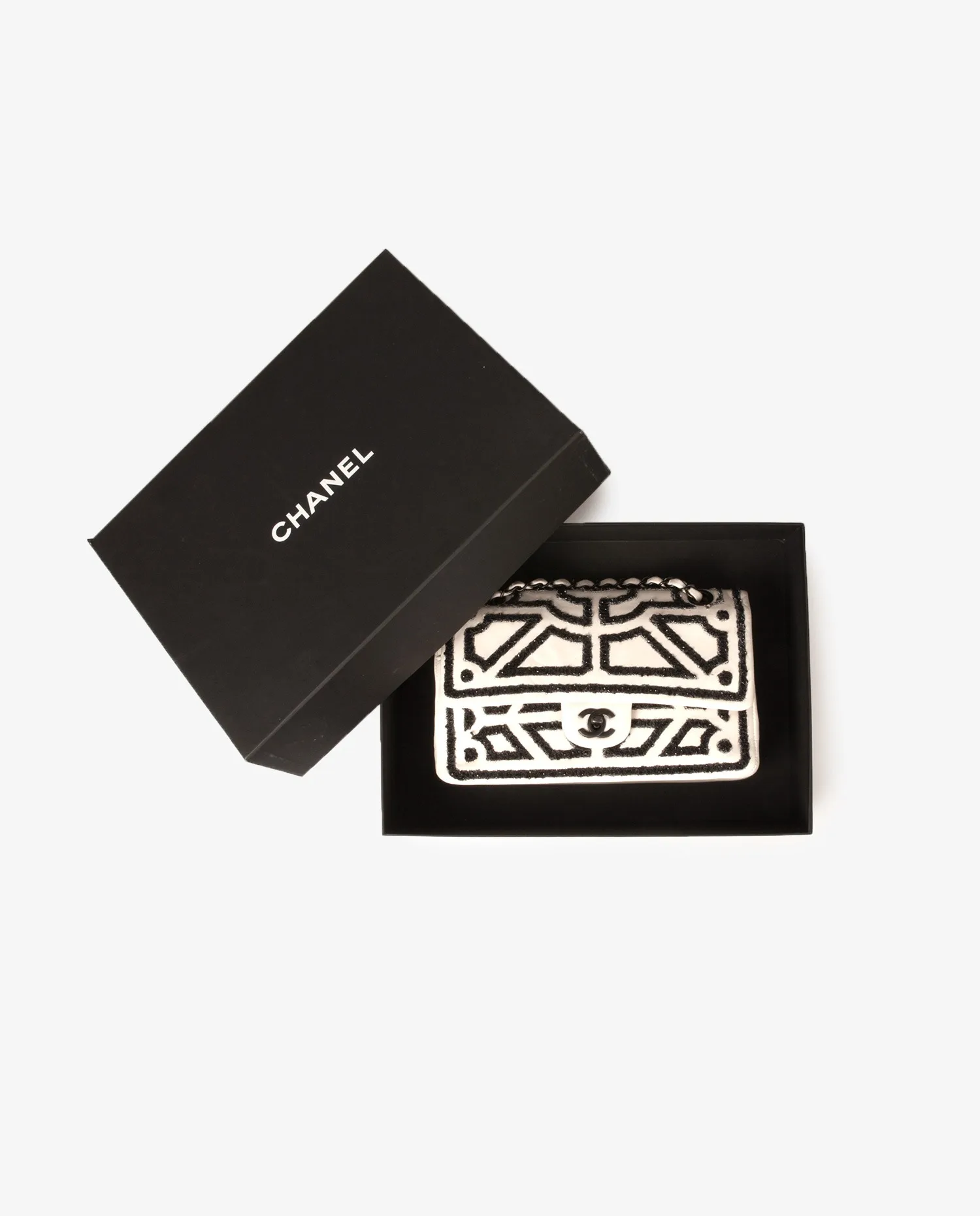 Sac Classique de la Maison Chanel en cuir d’agneau blanc et fils/strass noirs. Bijouterie noire. Fermoir CC. Double rabat. Porté épaule ou crossbody. L’intérieur est en satin noir.