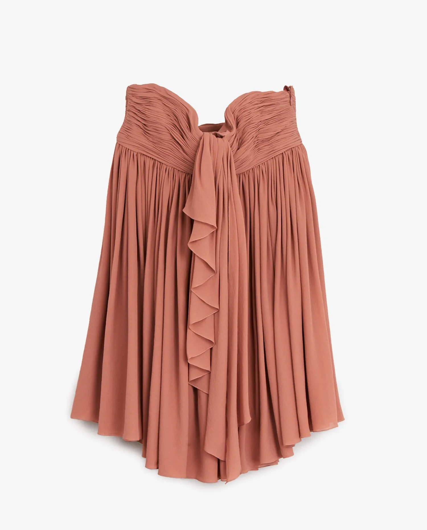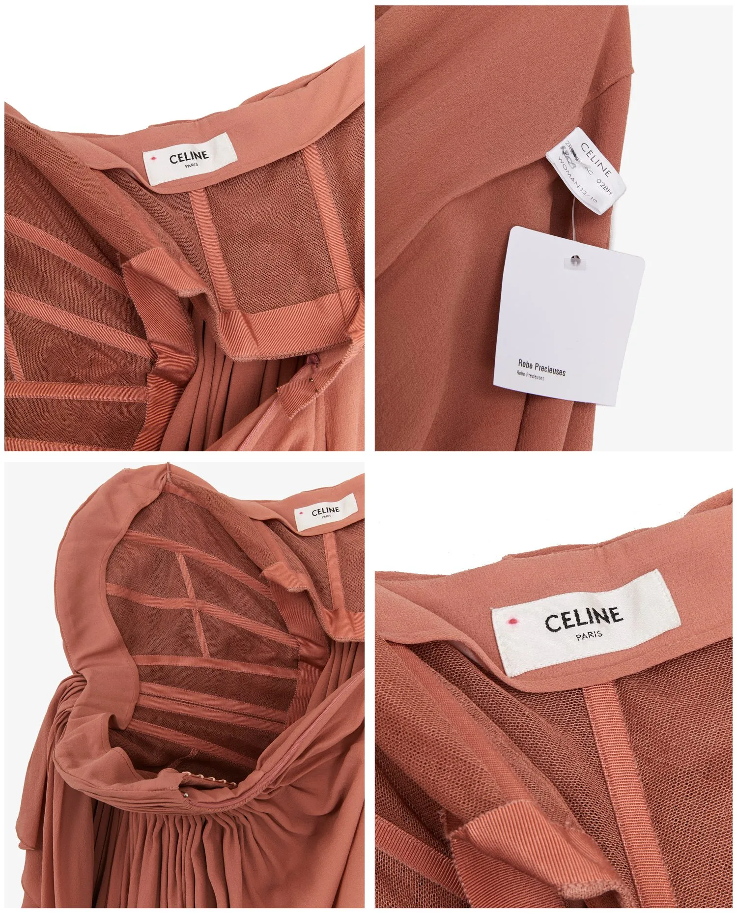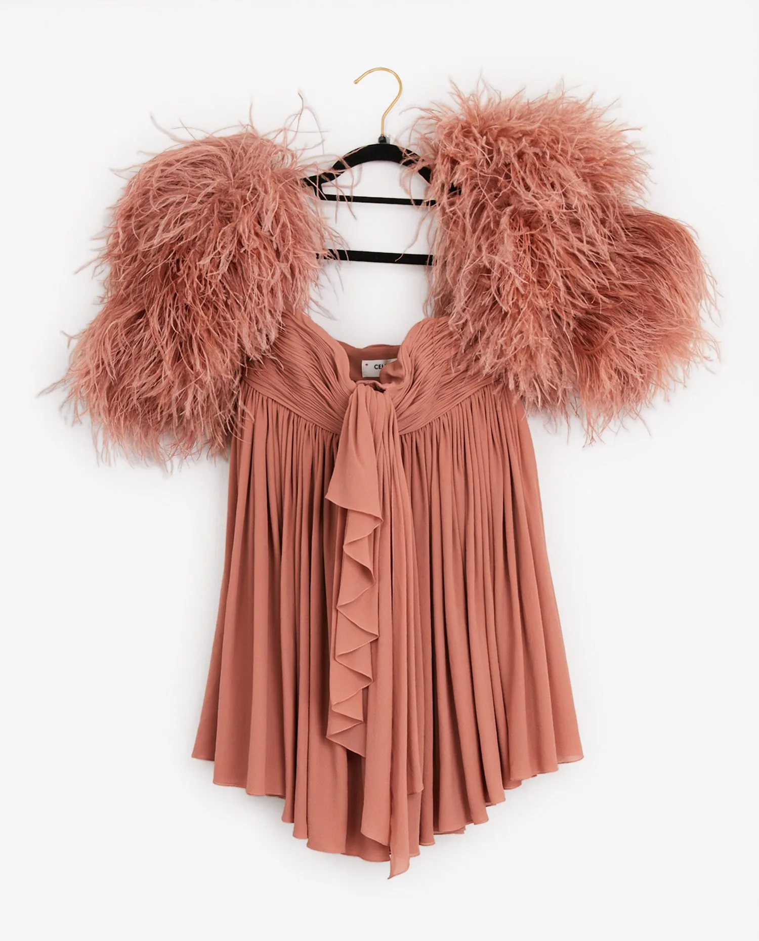 Robe du soir à volants Celine et manchons en plume de couleur nude. A l’intérieur de la robe, vous trouverez un bustier pour maintenir la poitrine. Fermeture zippée sur le côté. Les manchons se mettent au bras. Taille 36. La robe peut également se porter sur un jean en top. En très bon état.