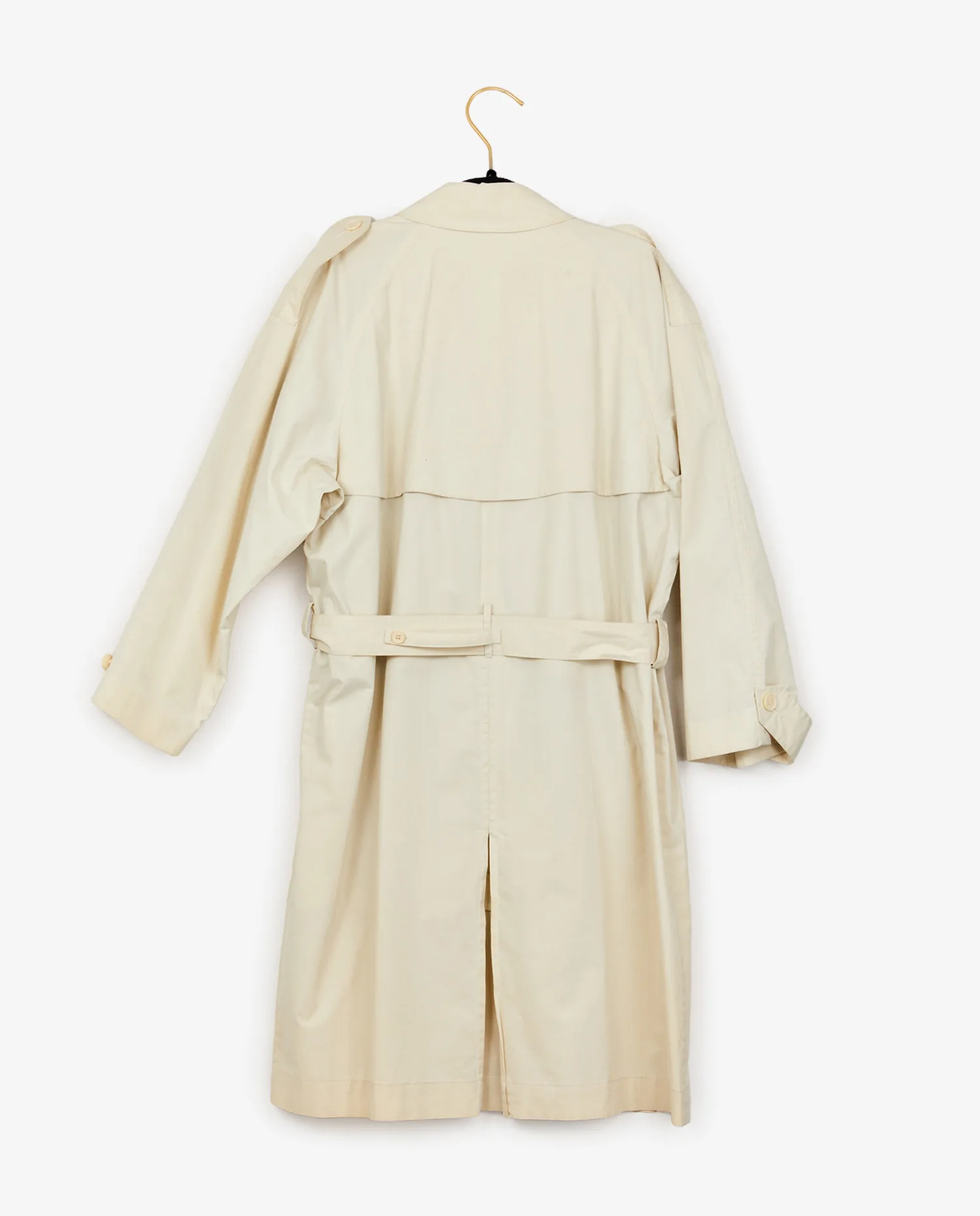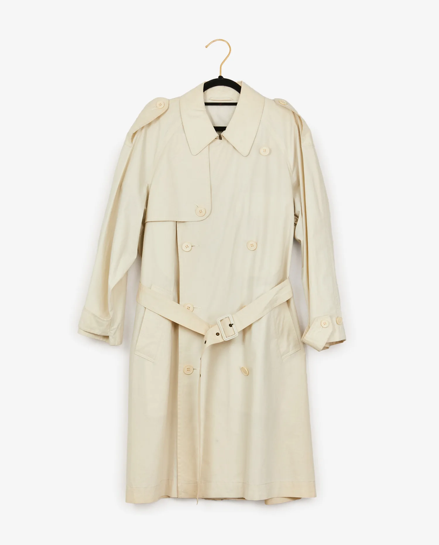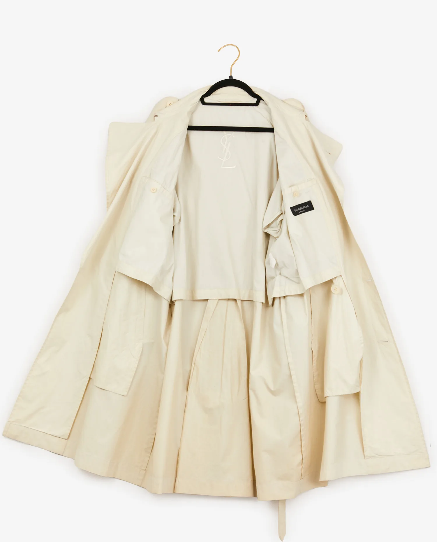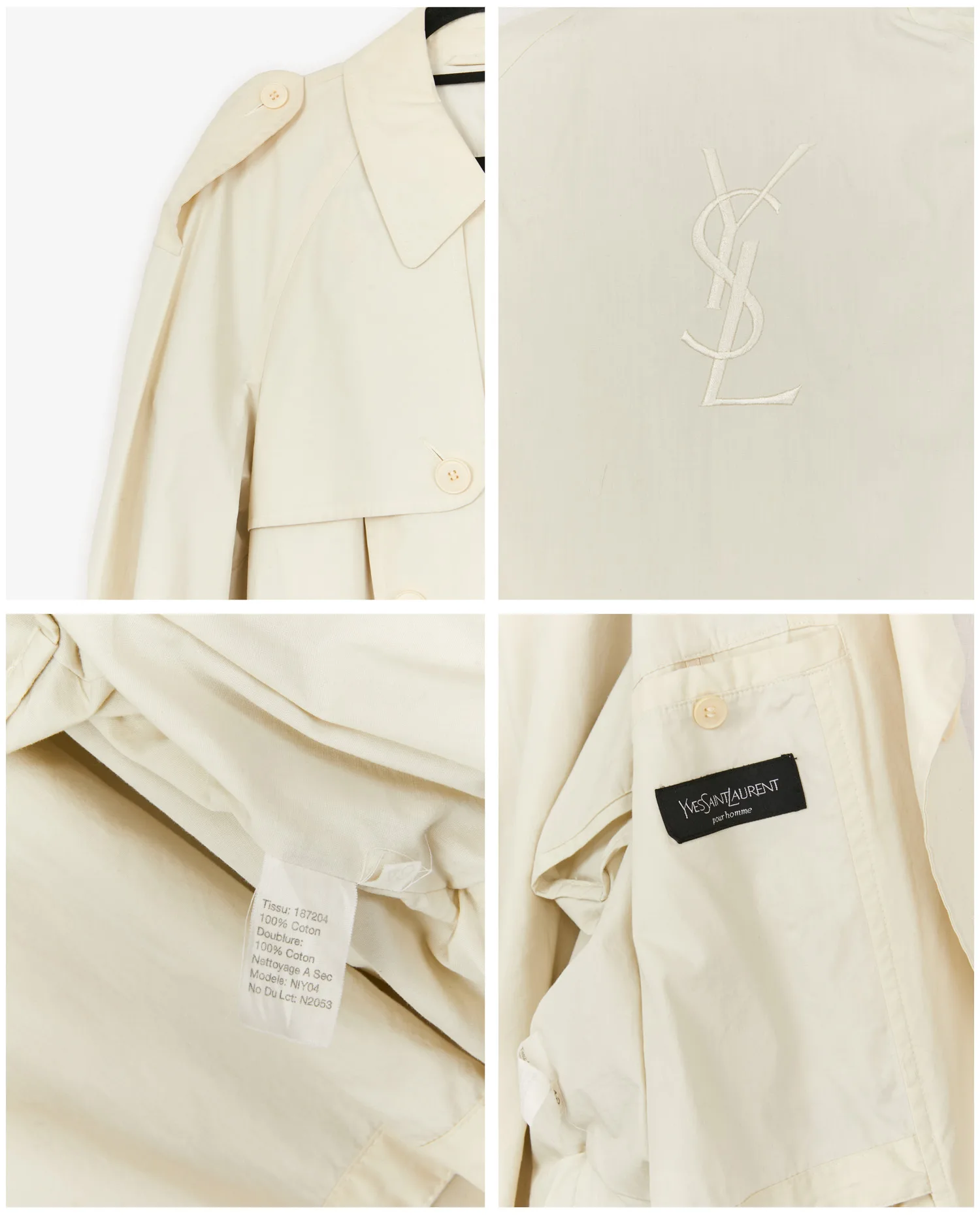 Trench vintage Yves Saint Laurent en toile imperméable beige. Deux poches à l’avant. Fermeture croisée ainsi qu’avec une ceinture afin de resserrer la taille. Taille 48. A l’intérieur, le sigle “YSL” est brodée. En très bon état.