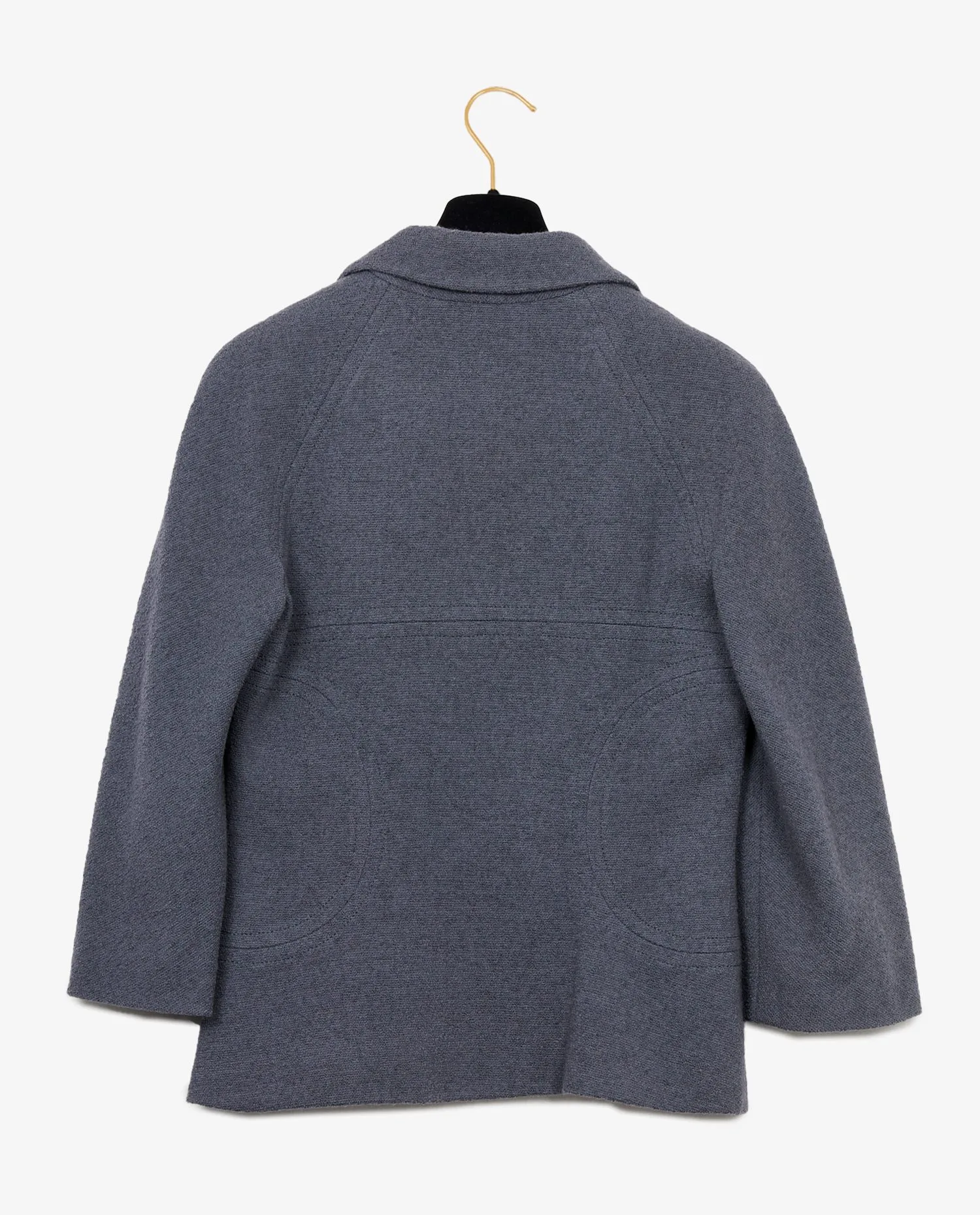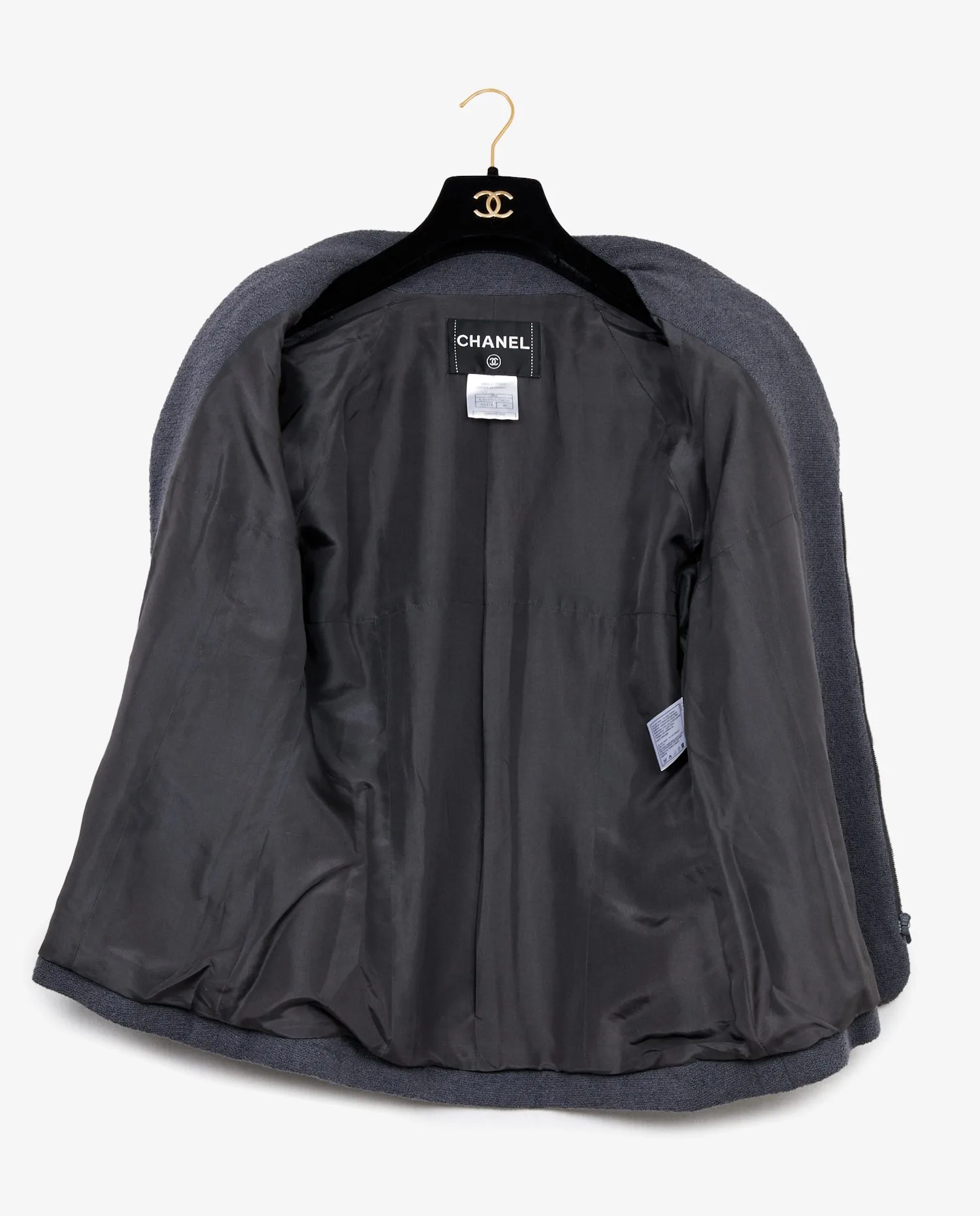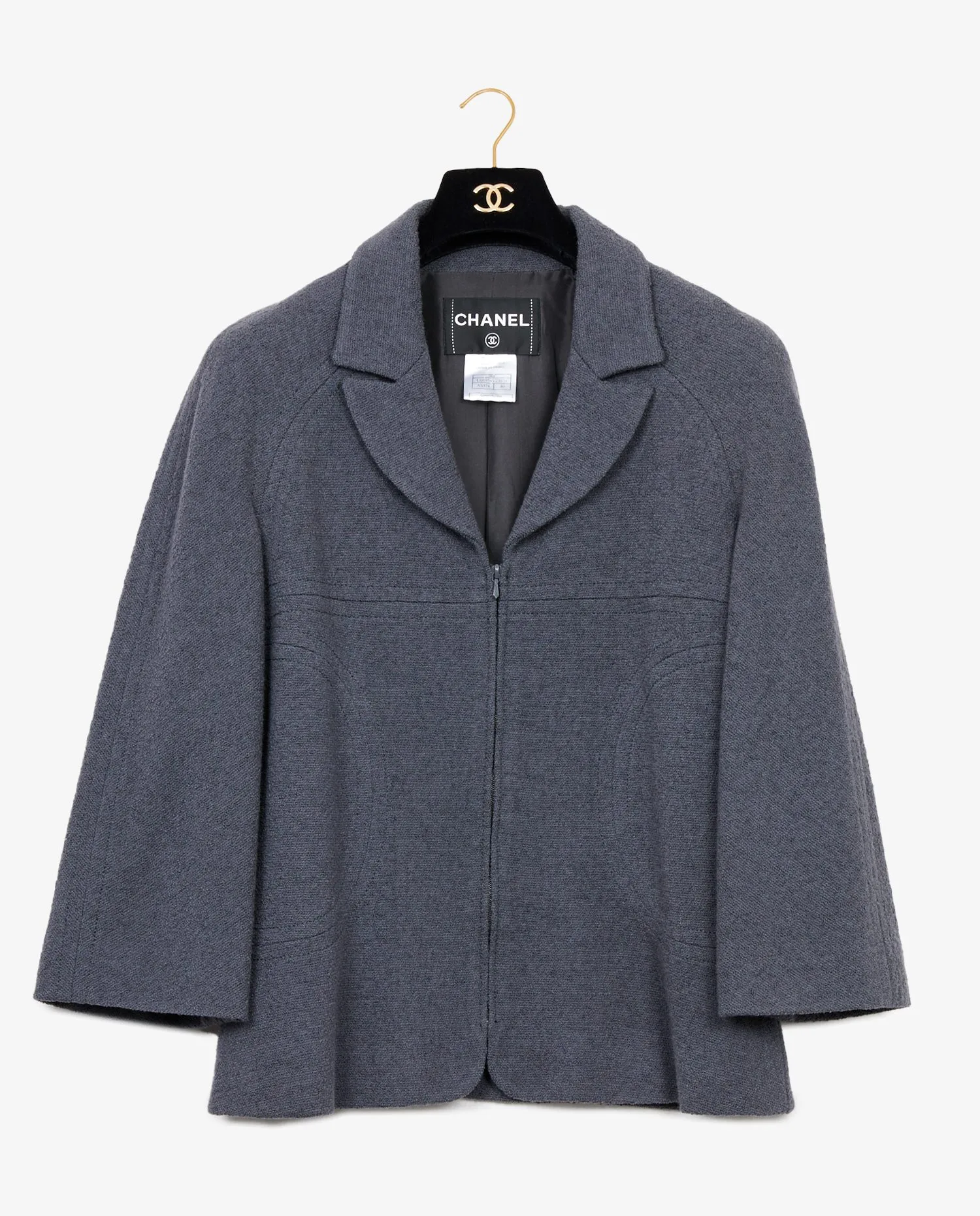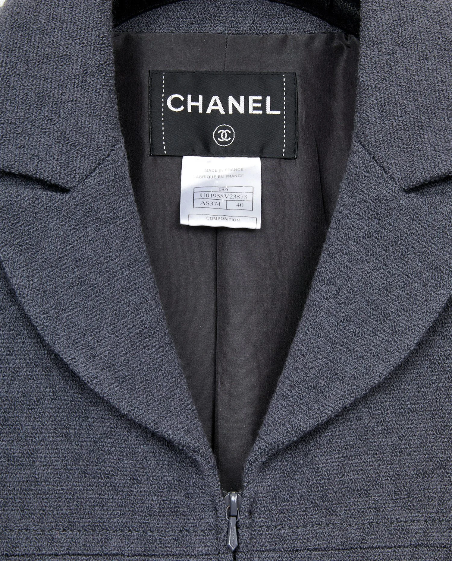 Veste grise chanel en tweed. Taille 40. Fermeture zippée. Doublure en soie. Manches 3/4. En très bon état.