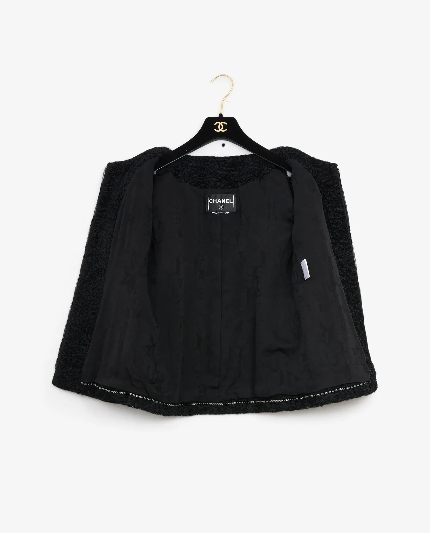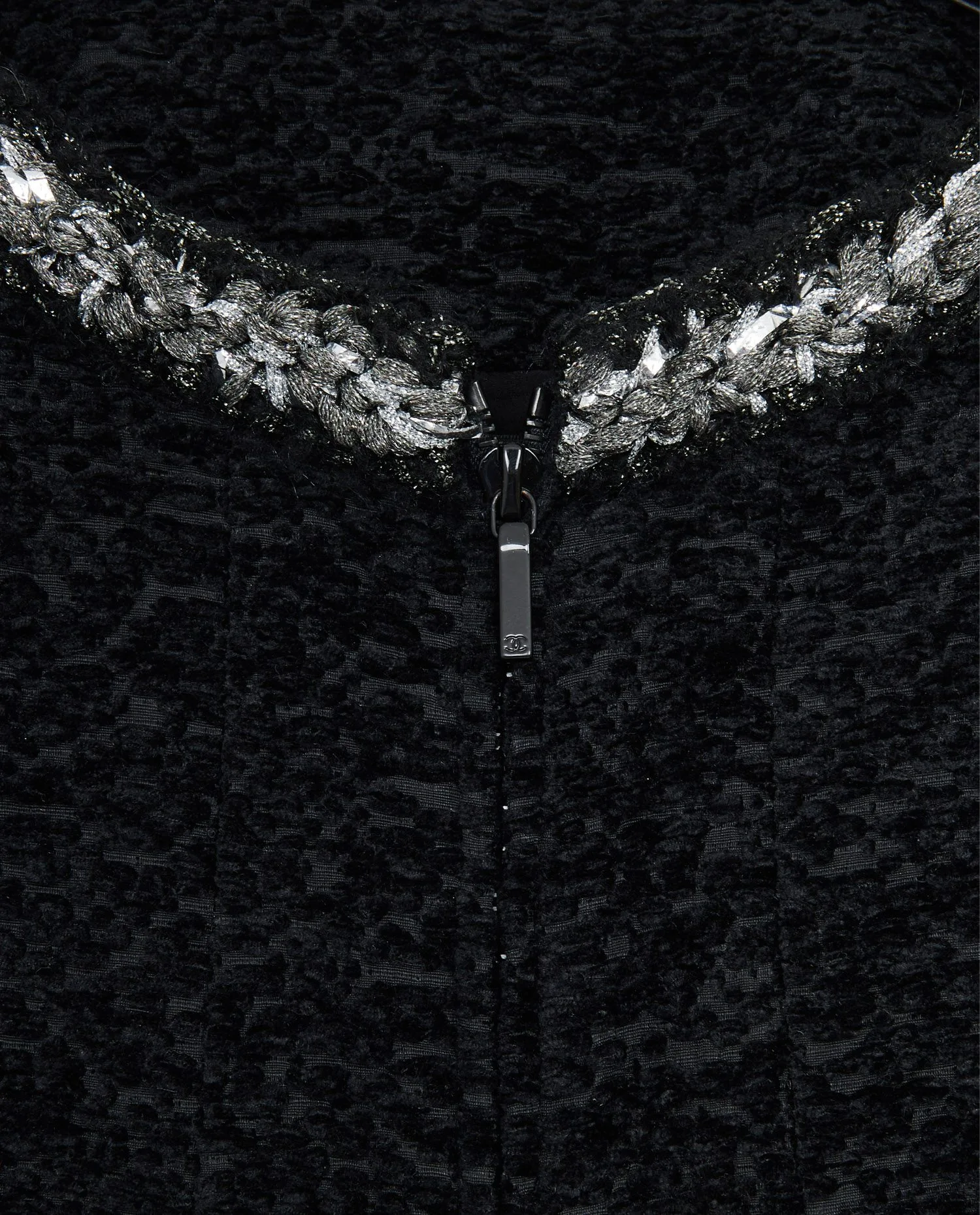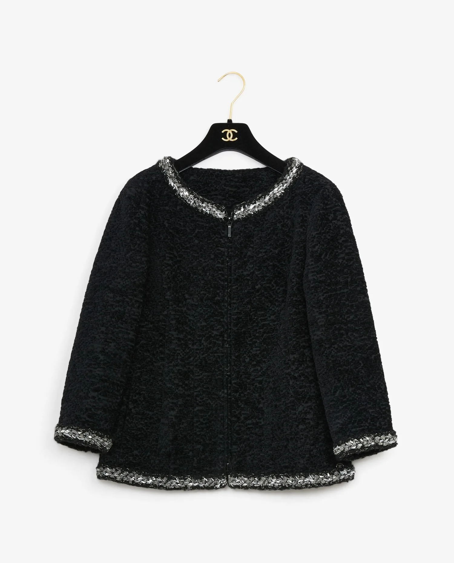Veste Chanel de la Collection “Le supermarché version Chanel” Automne/Hiver 2014/15. Fermeture zippée. Broderies fils argentés sur le col, le bas et les poignées. Doublure soie noire. En très bon état. Il manque l’étiquette de taille et de composition.