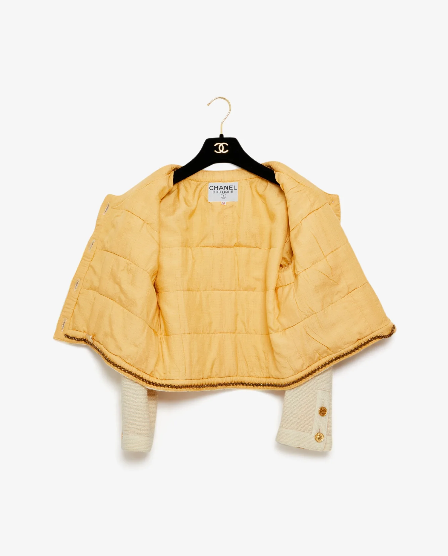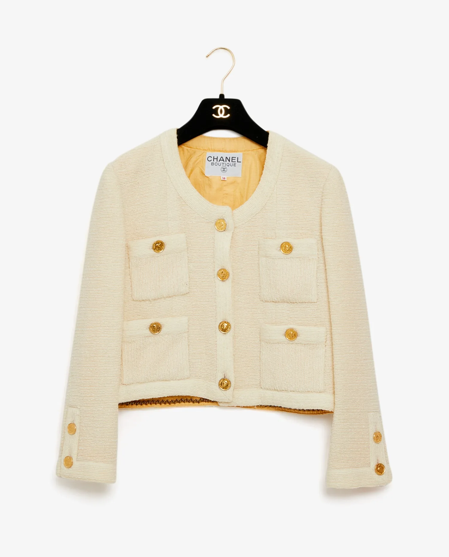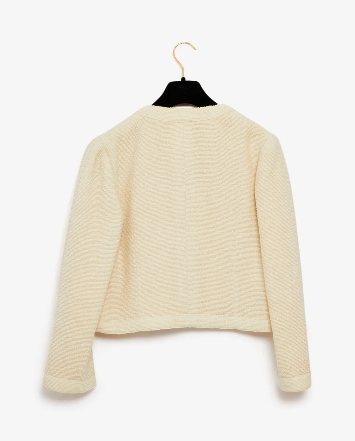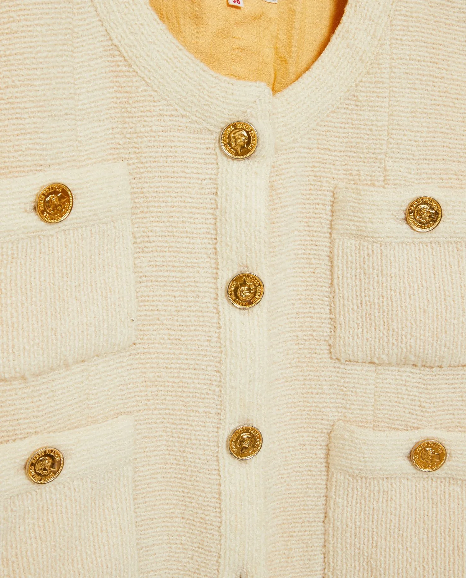 Veste courte Chanel en tweed blanc cassé. Elle date des années 80. La doublure est en soie cousue main jaune clair. 4 poches plaquées à l’avant. Boutons en forme de pièces de monnaie siglés “Coco Chanel Paris France”. En parfait état.