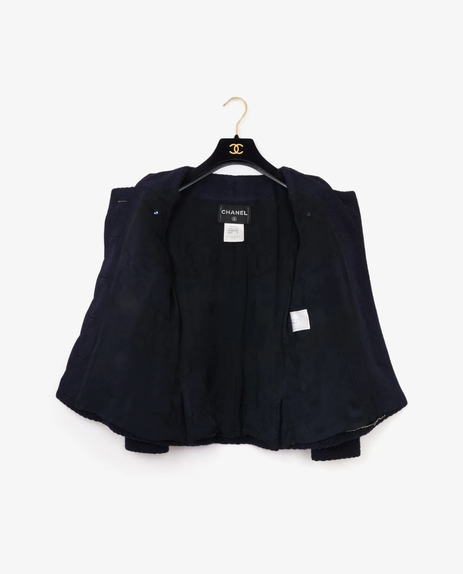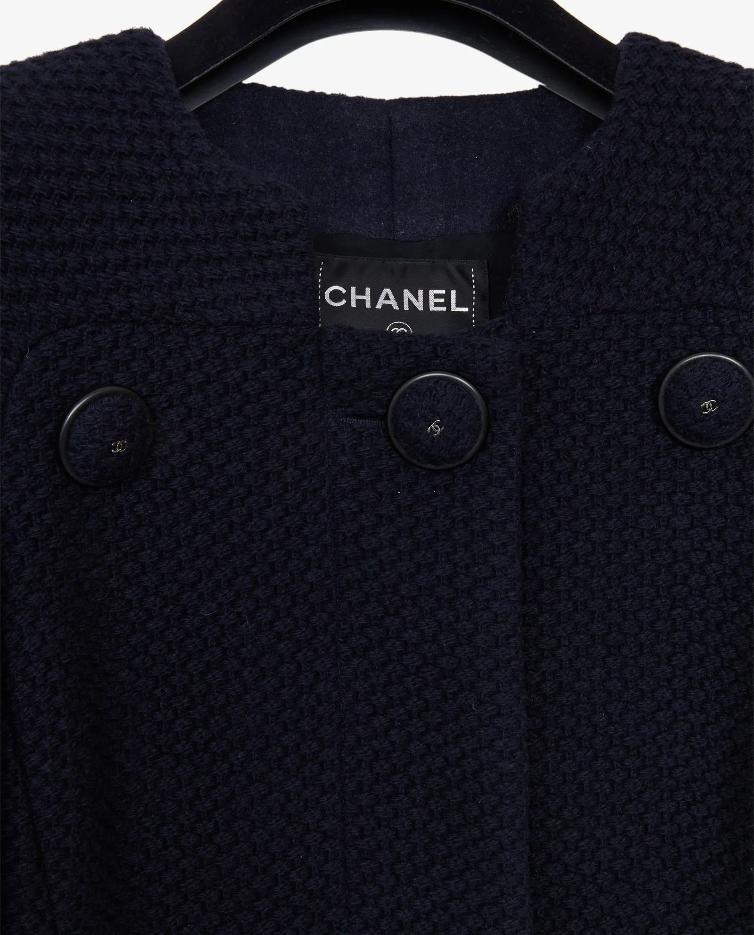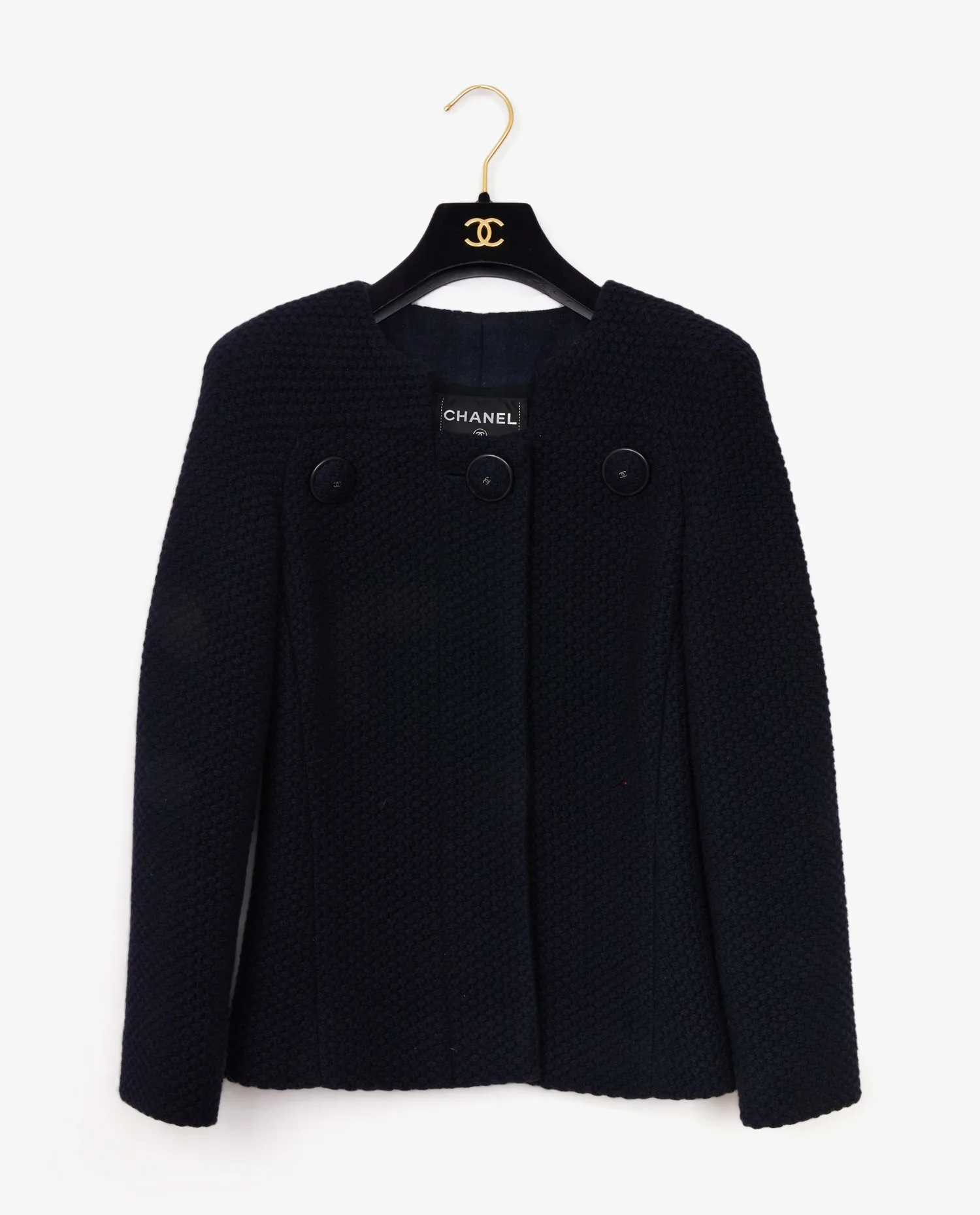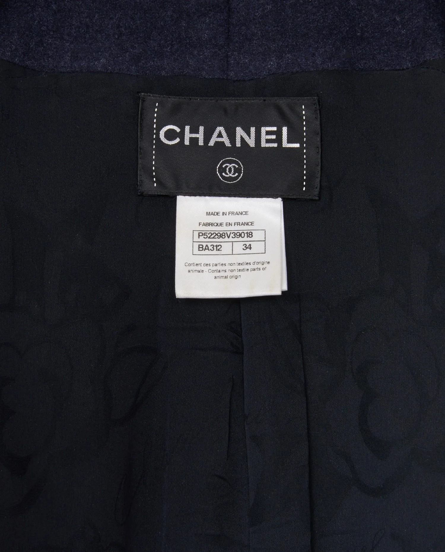 Veste Chanel en laine bleu marine. Taille 34. Fermeture par des boutons cachés et un gros bouton siglé CC. Doublure Chanel. En très bon état.