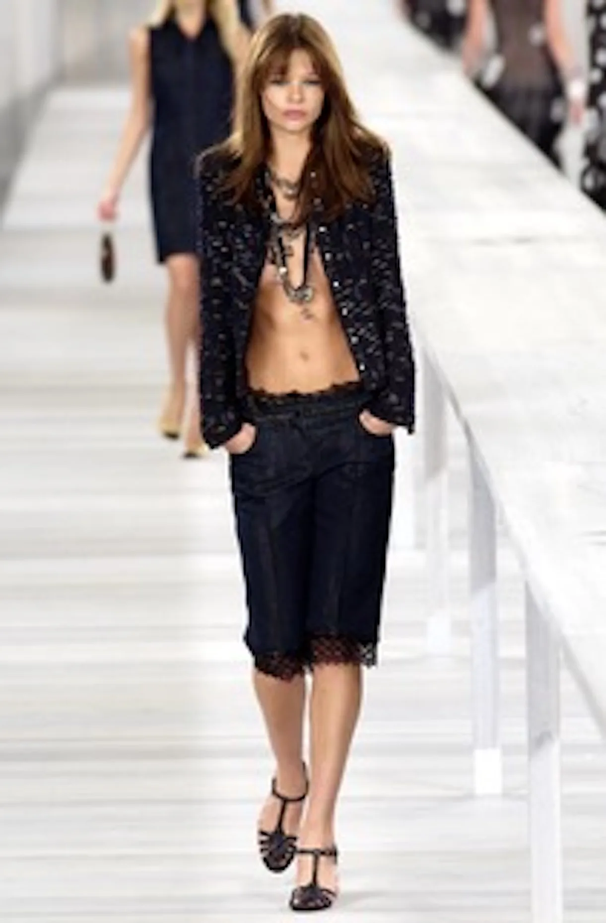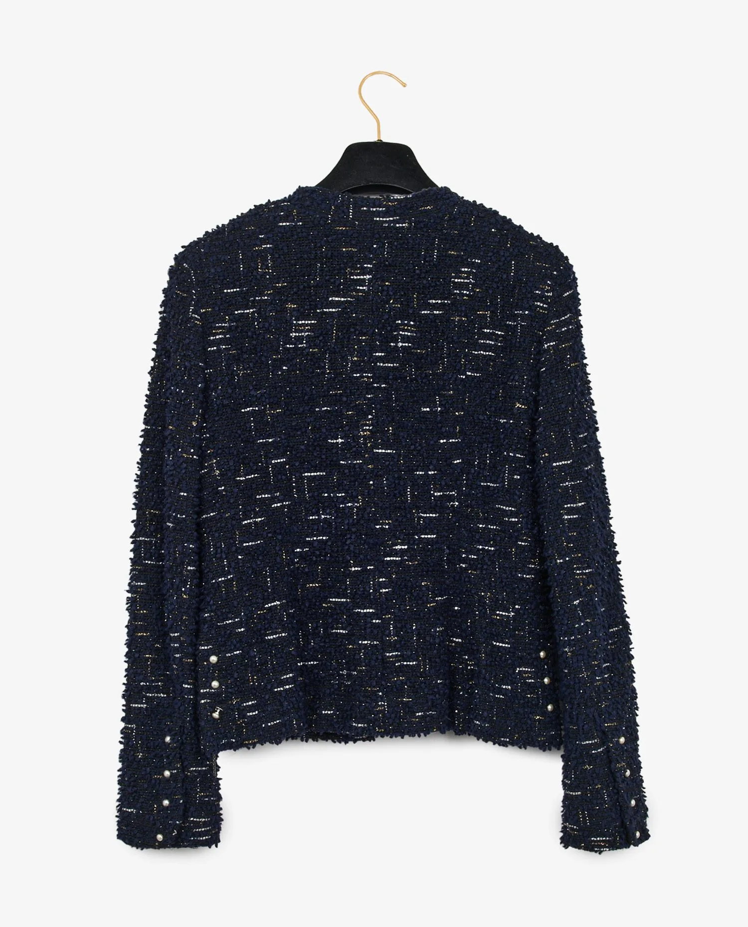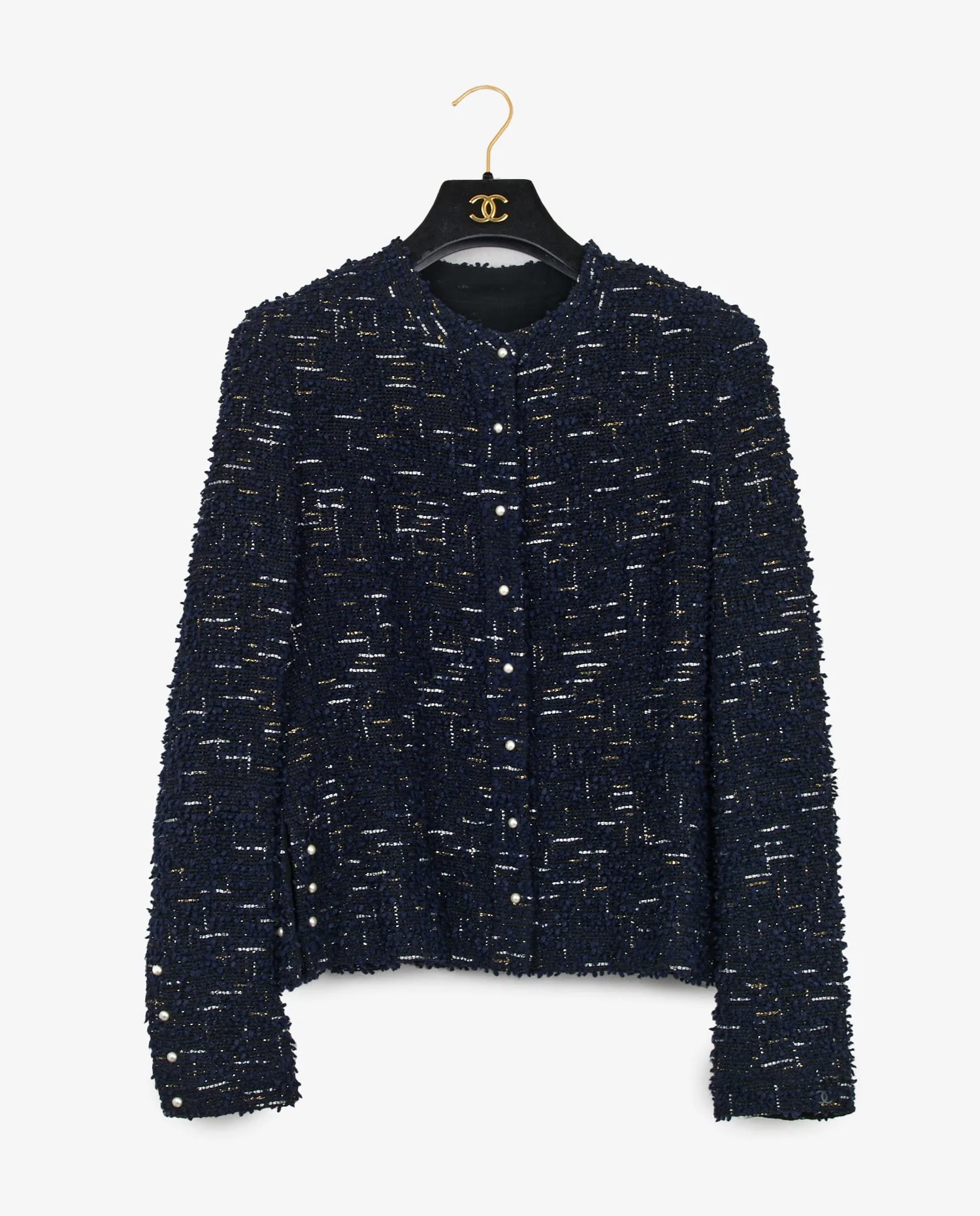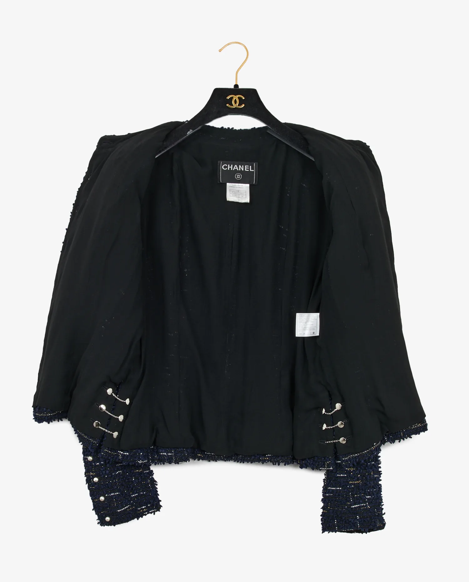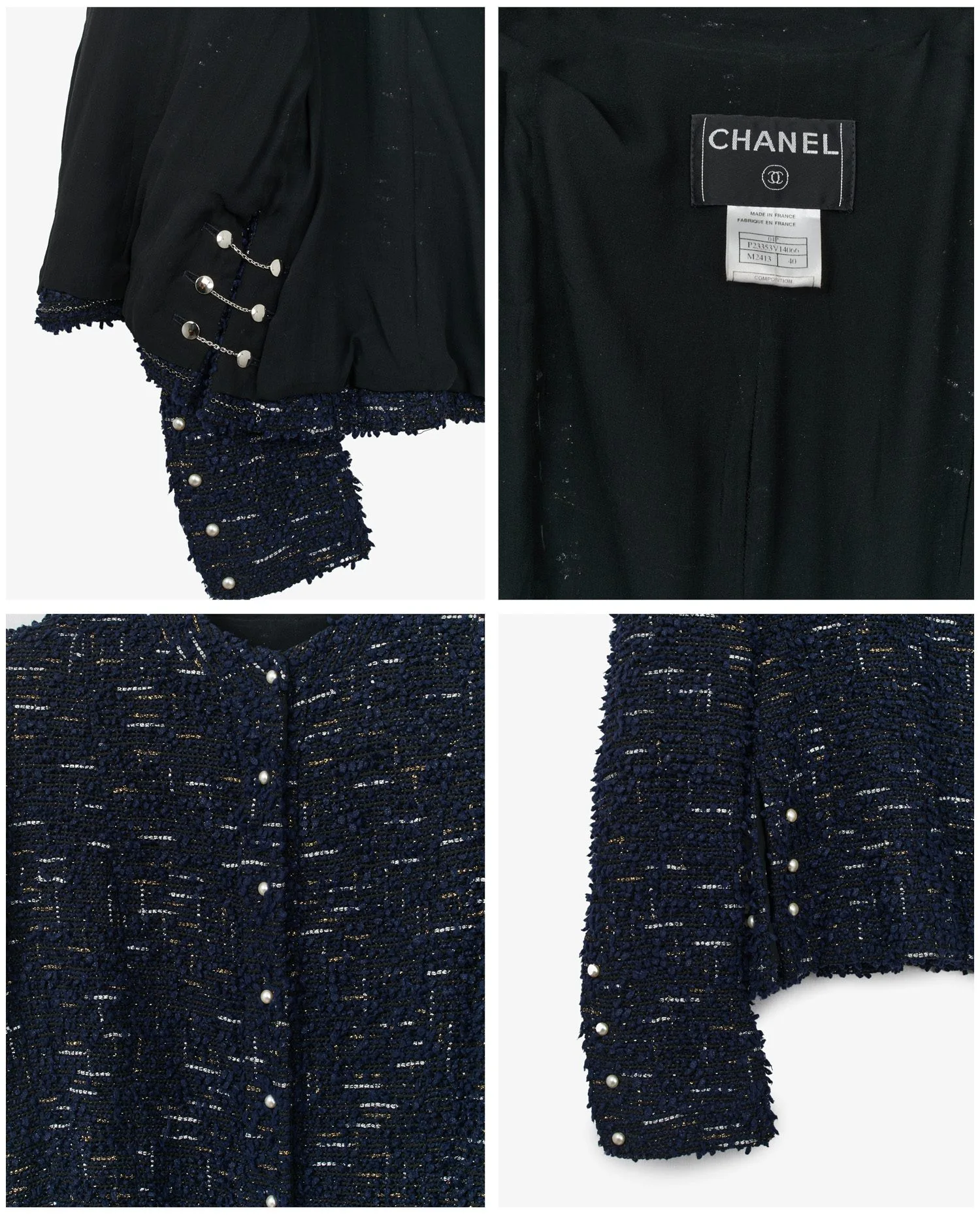 Veste courte Chanel en tweed bleu marine avec des fils argent et doré. Boutons perles. Doublure soie. En très bon état.