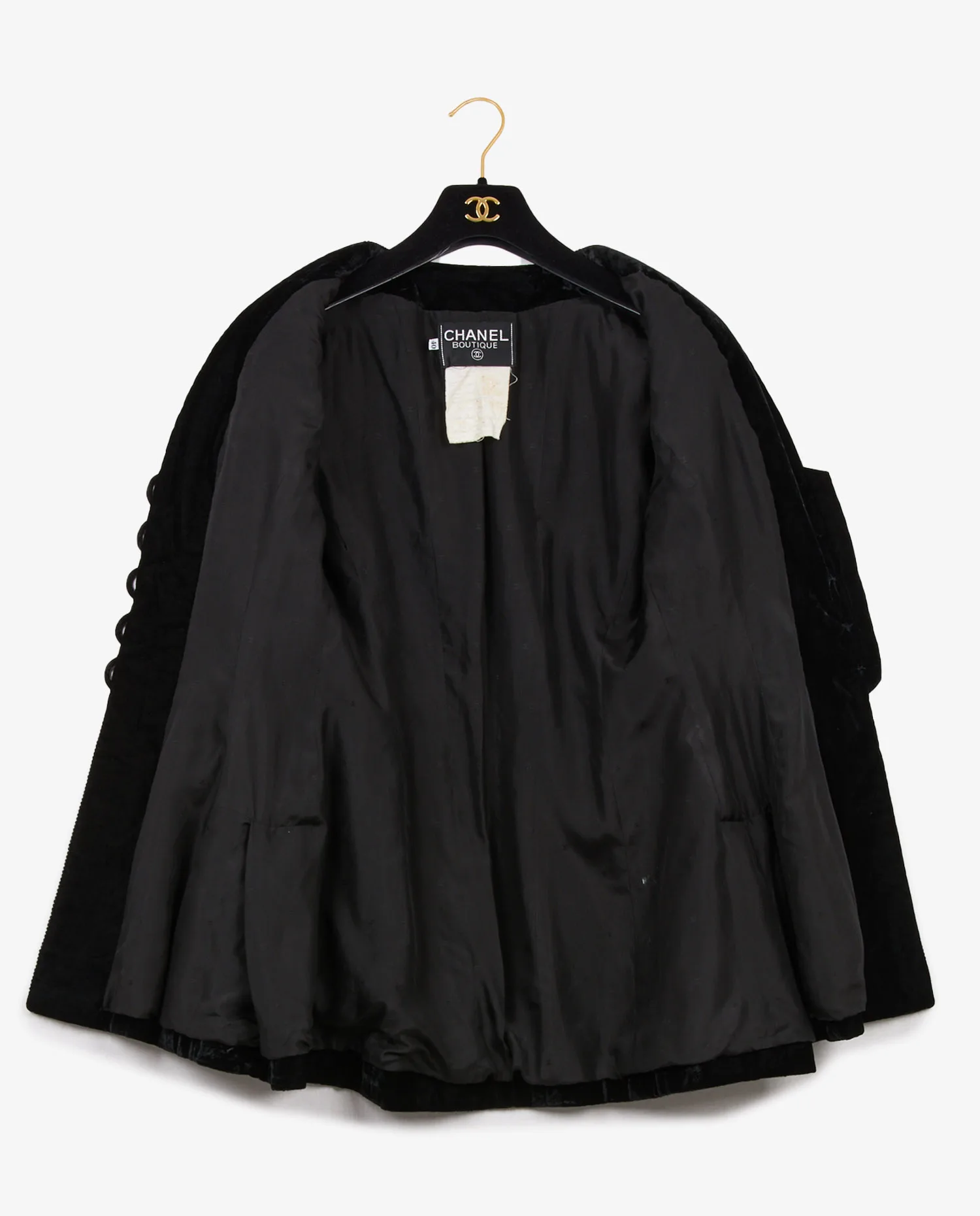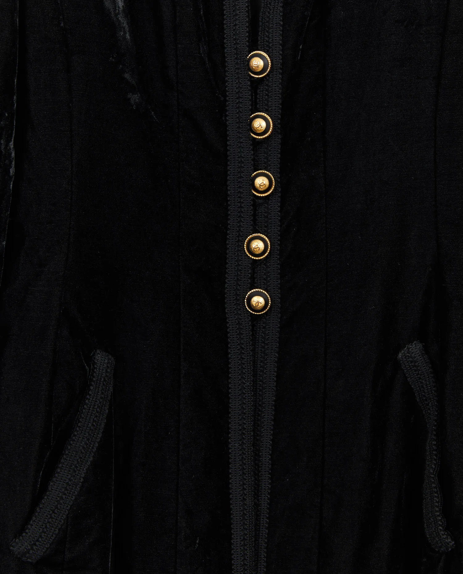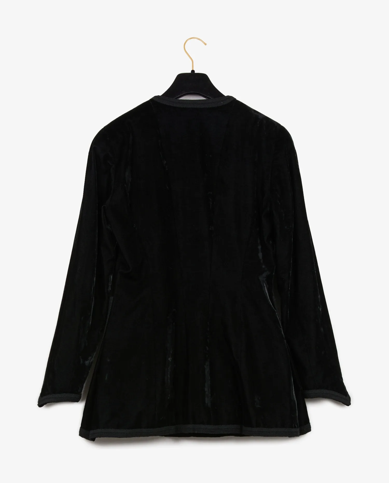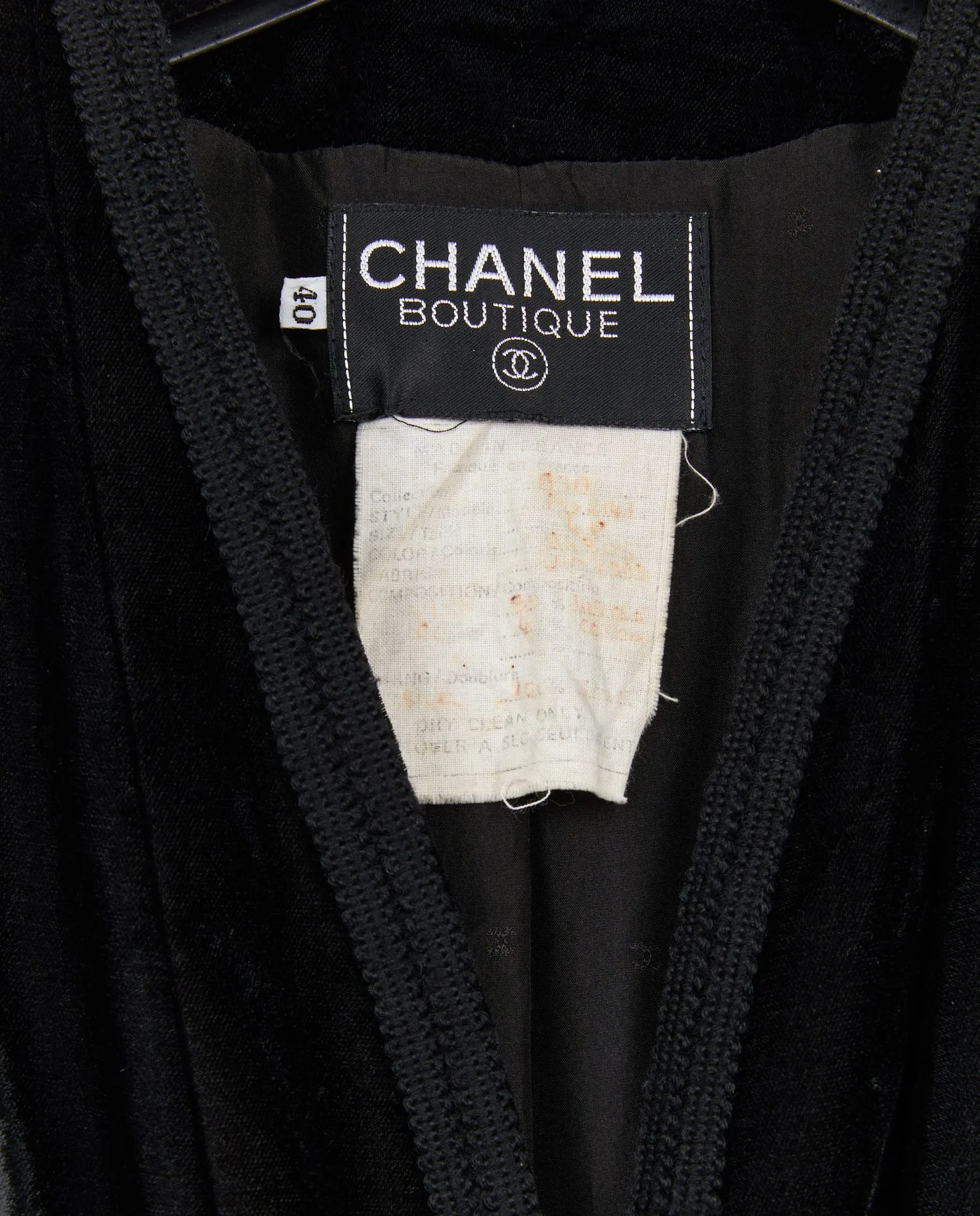 Veste Chanel vintage en velours noir. Doublure en soie noire. Boutons sigles CC dorés. En très bon état.