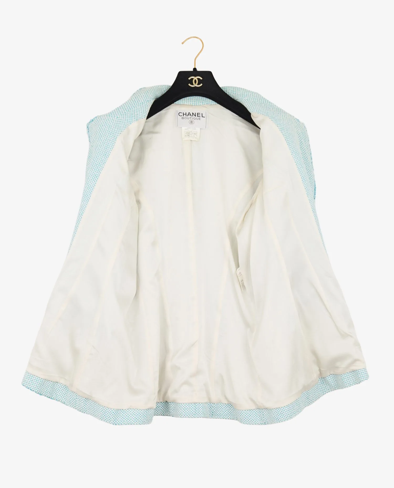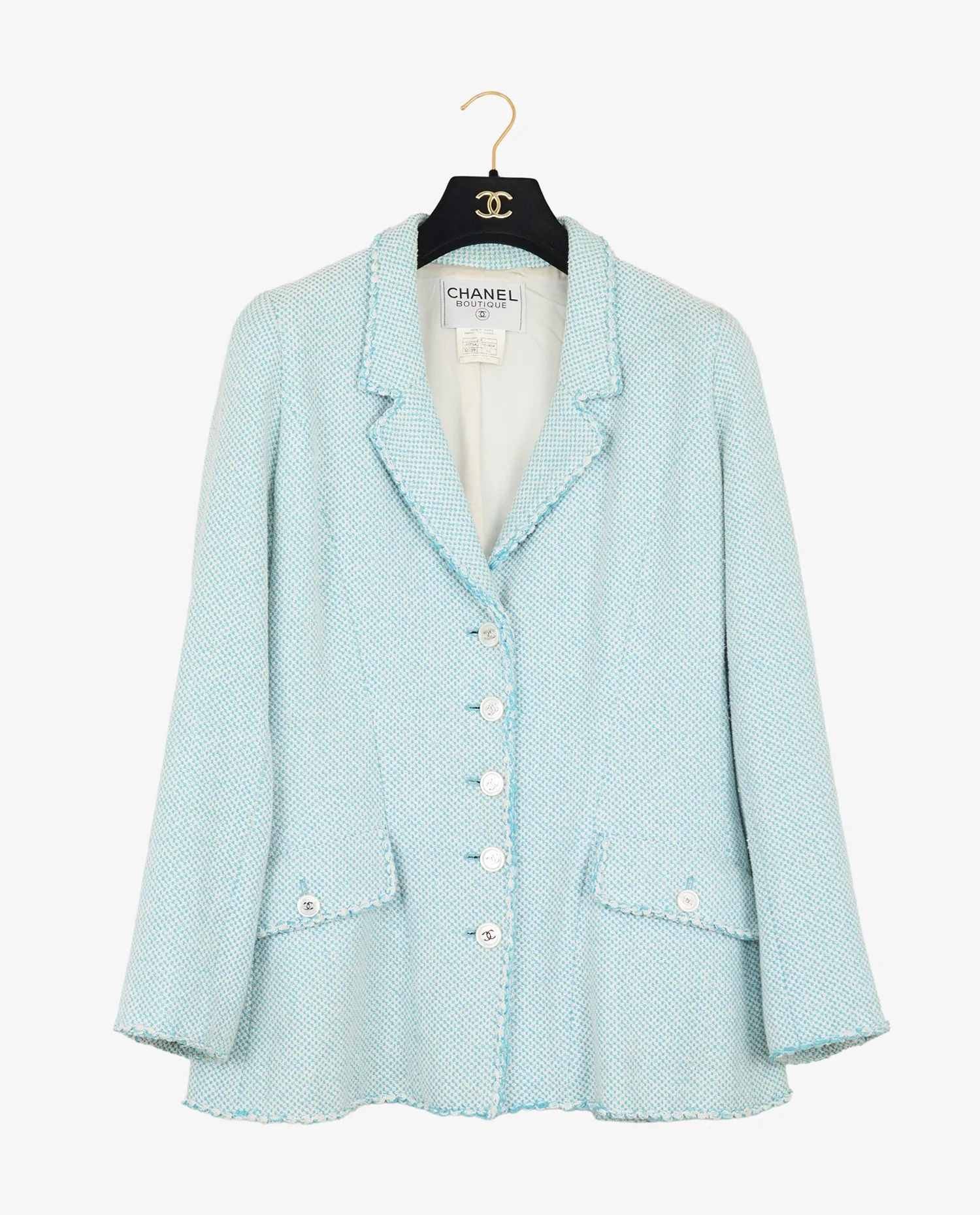 Cette veste Chanel Printemps-Été 1997 est une pièce emblématique de l’esthétique lumineuse et sophistiquée des années 1990. Son tweed bicolore pastel, sa coupe féminine et ses détails signature en font un modèle recherché par les amateurs de Chanel vintage. Elle apporte fraîcheur et élégance intemporelle à toute garde-robe contemporaine.