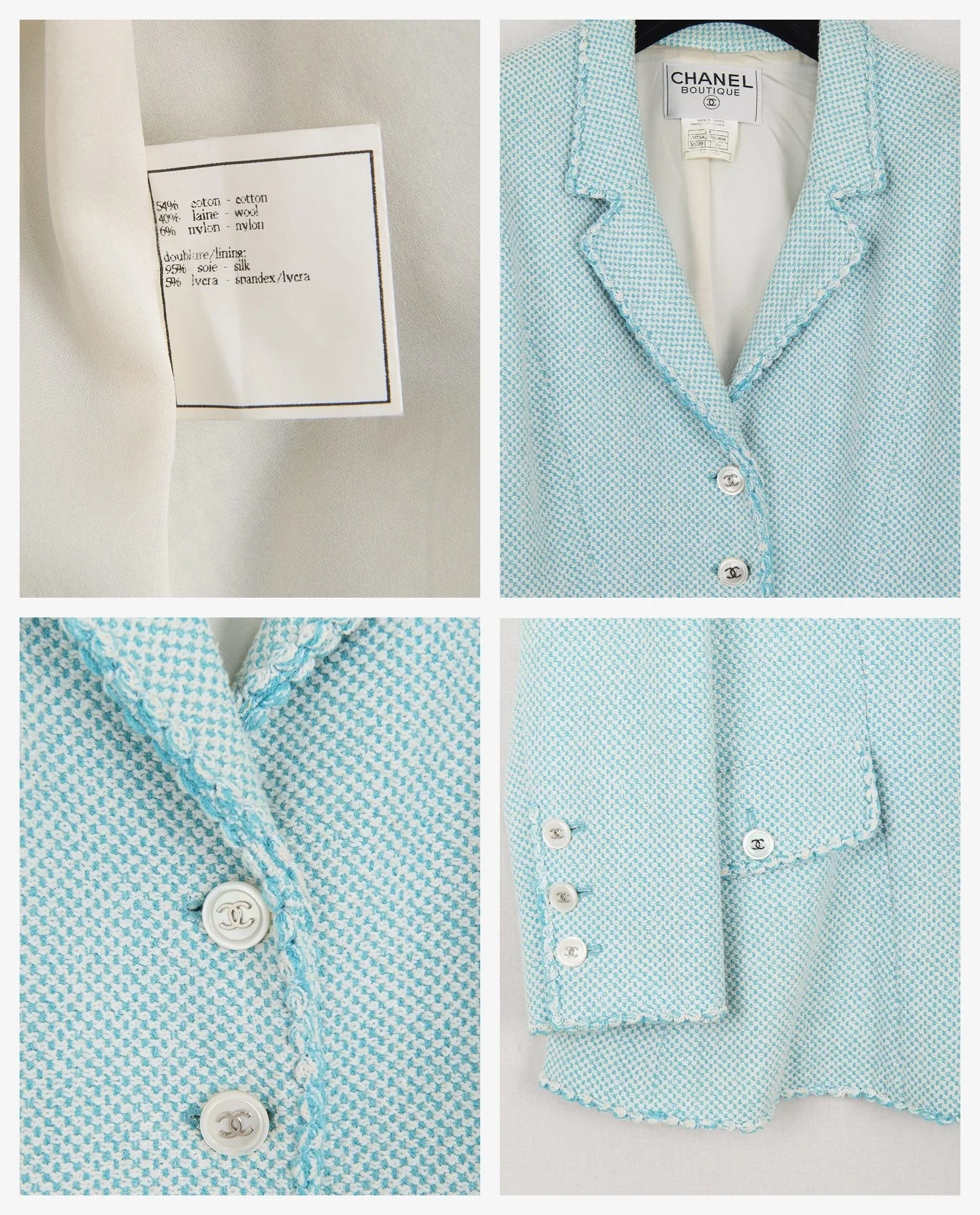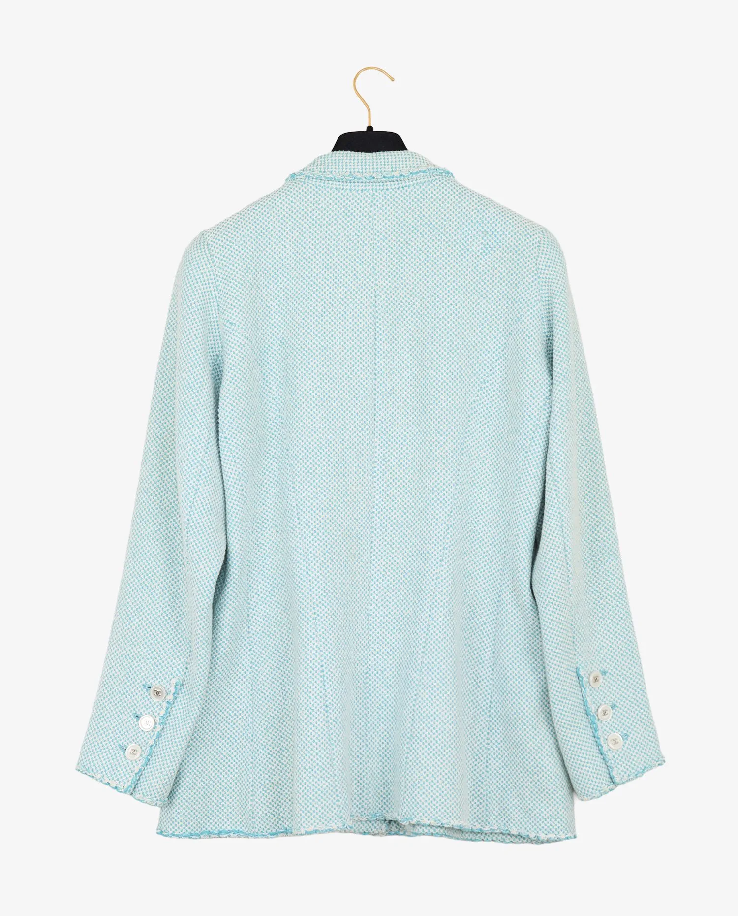 Cette saison met à l’honneur des palettes fraîches, des tons pastel et des textures aérées, traduisant un esprit chic et lumineux. Le tweed, matière iconique introduite par Gabrielle Chanel dans les années 1920 pour libérer le corps féminin, est ici réinterprété dans une version bicolore subtile, idéale pour les collections printemps-été. La veste illustre parfaitement cette volonté d’allier tradition couture et modernité délicate.