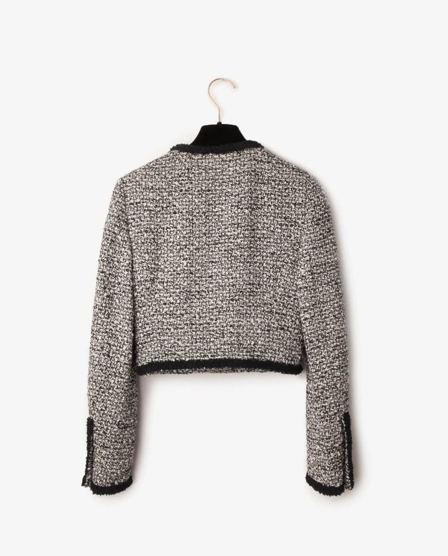Inspirée de la Collection Microtailleurs, Croisière 1995. Elle se compte parmi les plus sexy. Le tailleur Chanel est rétréci, sa veste retravaillée dans une version étroite et courte avec des épaules fines.