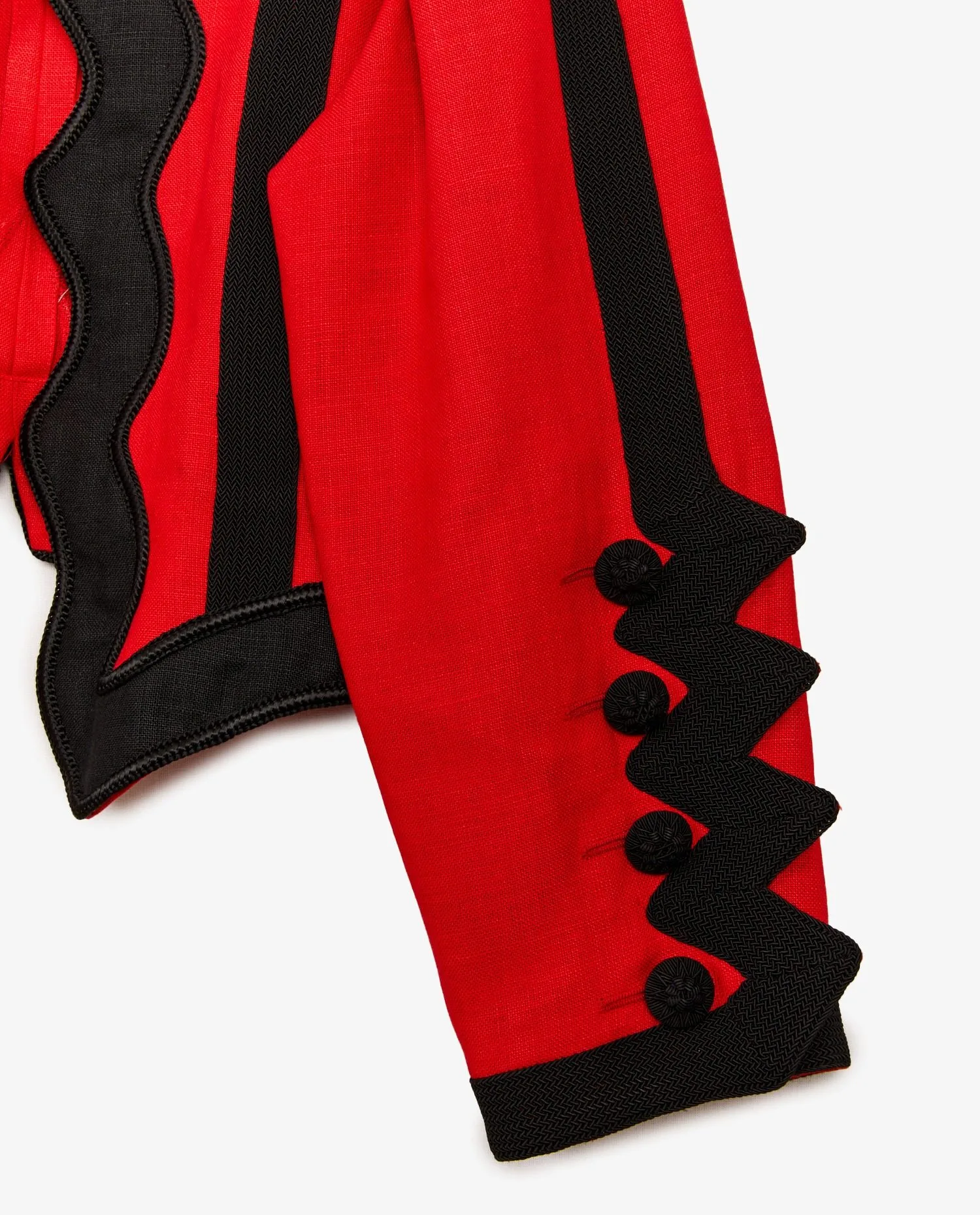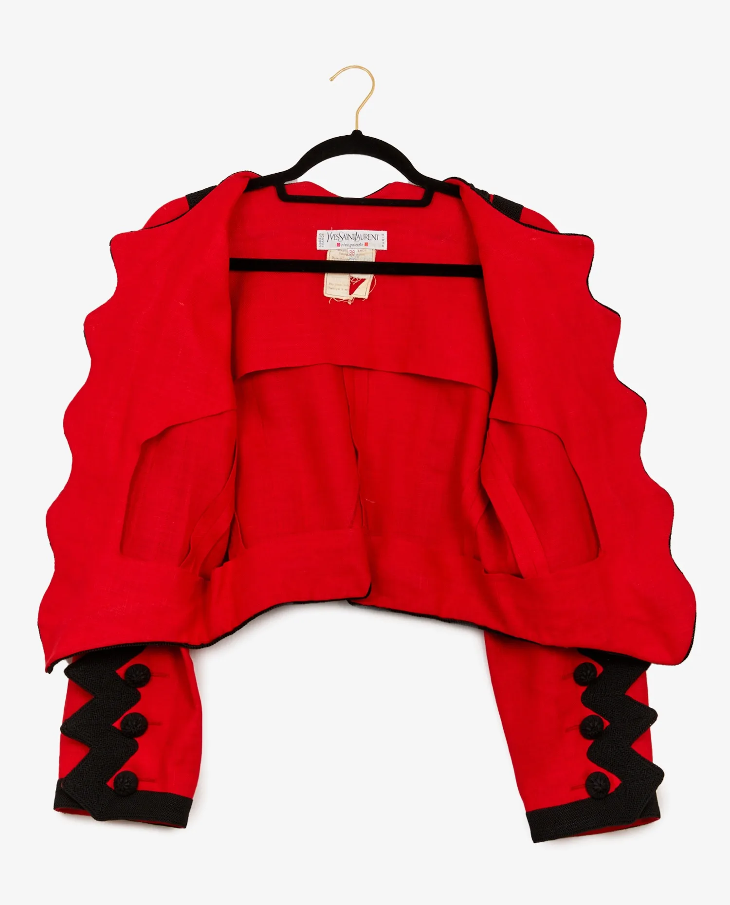 Veste courte Yves Saint Laurent Rive gauche en lin rouge et noir. Cintrée à la taille. Elle se porte ouverte. En très bon état.