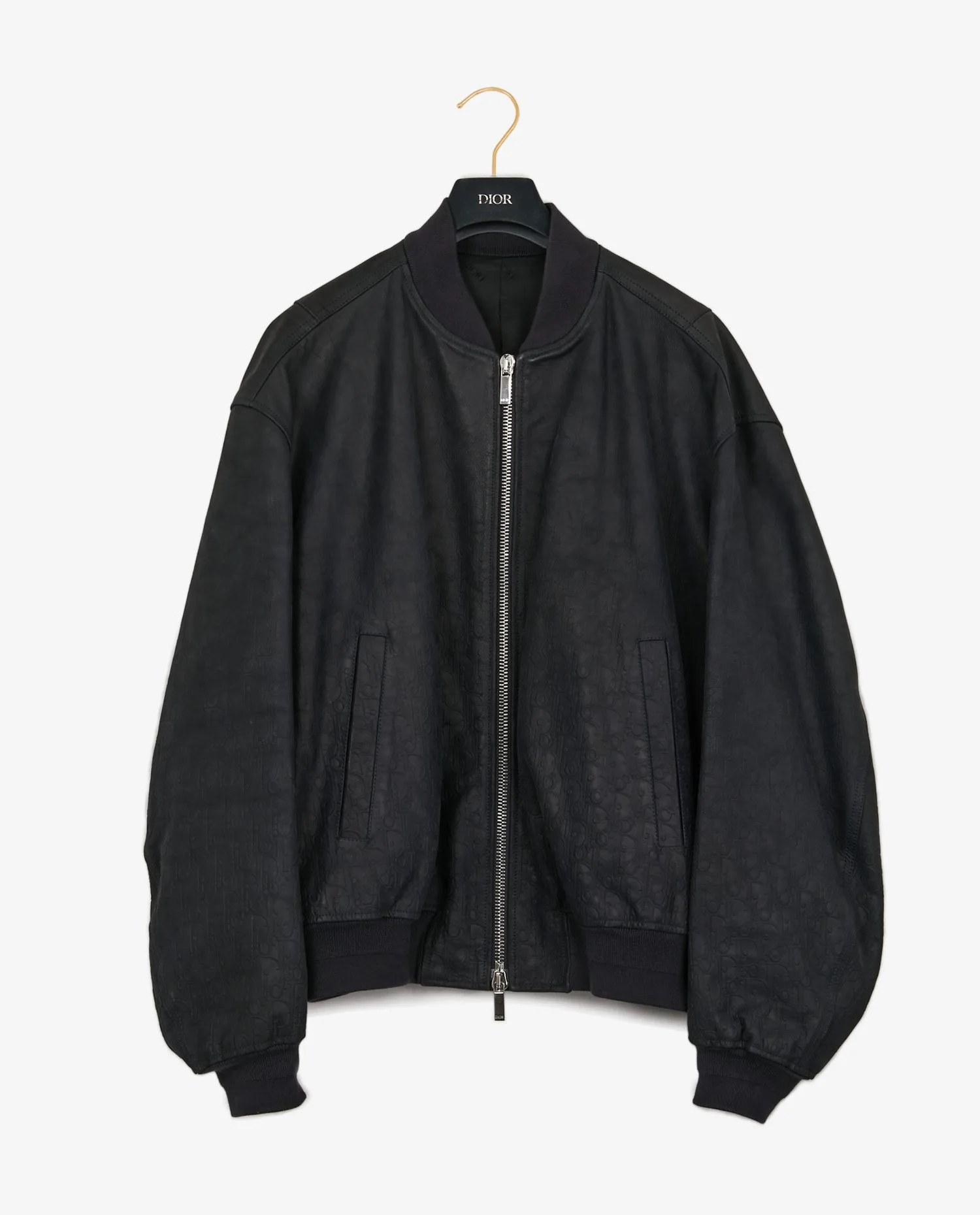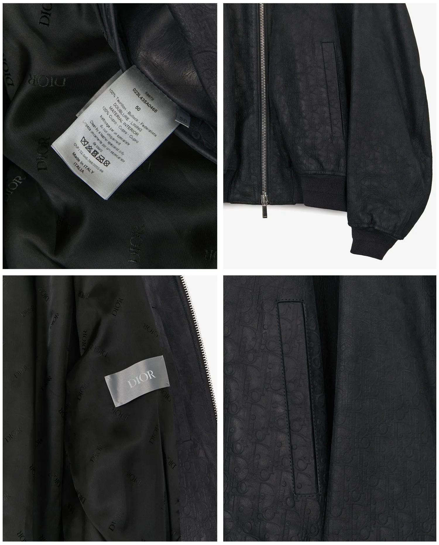 Veste Dior style bomber en cuir taurillon bleu marine embossé du motif Dior. Elle se distingue par ses finitions soignées: deux poches extérieures, deux poches intérieures, fermeture zippée en métal argenté avec le logo Dior gravé sur les tirettes. La doublure en cupro noire, discrètement marquée du logo, apporte une touche soignée et reconnaissable à l’intérieur de la veste. Taille 50. En très bon état.