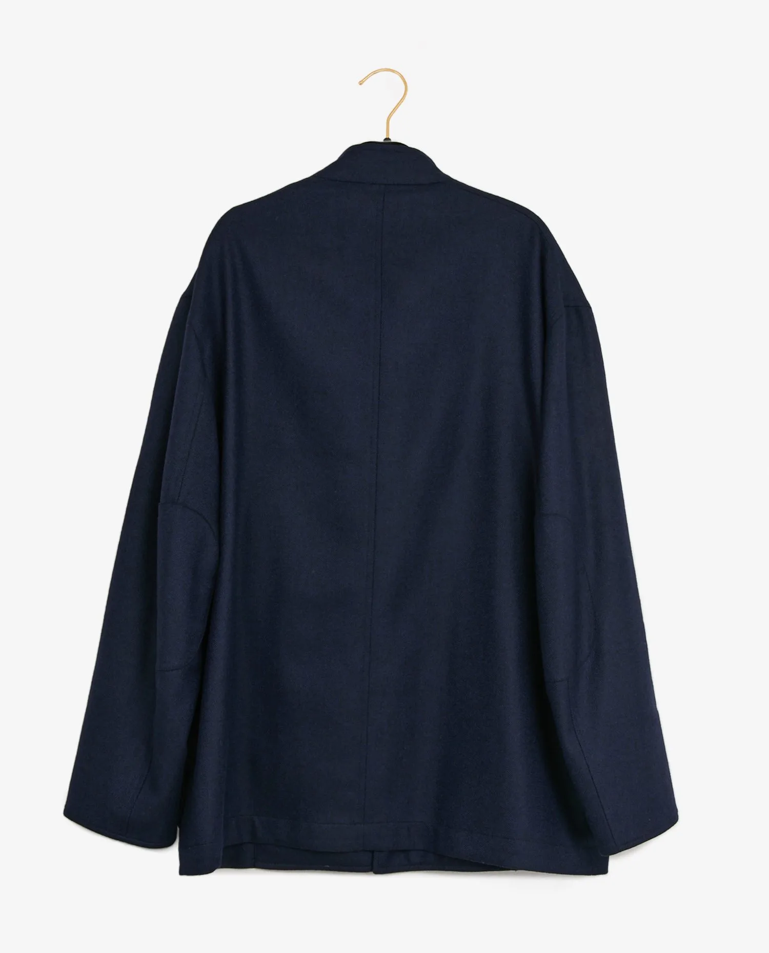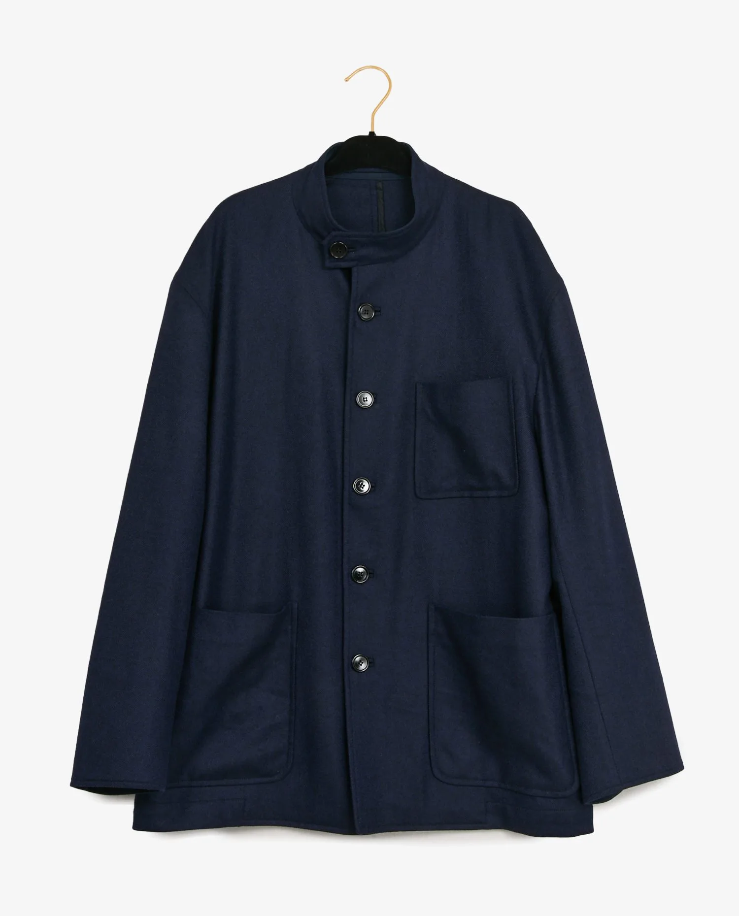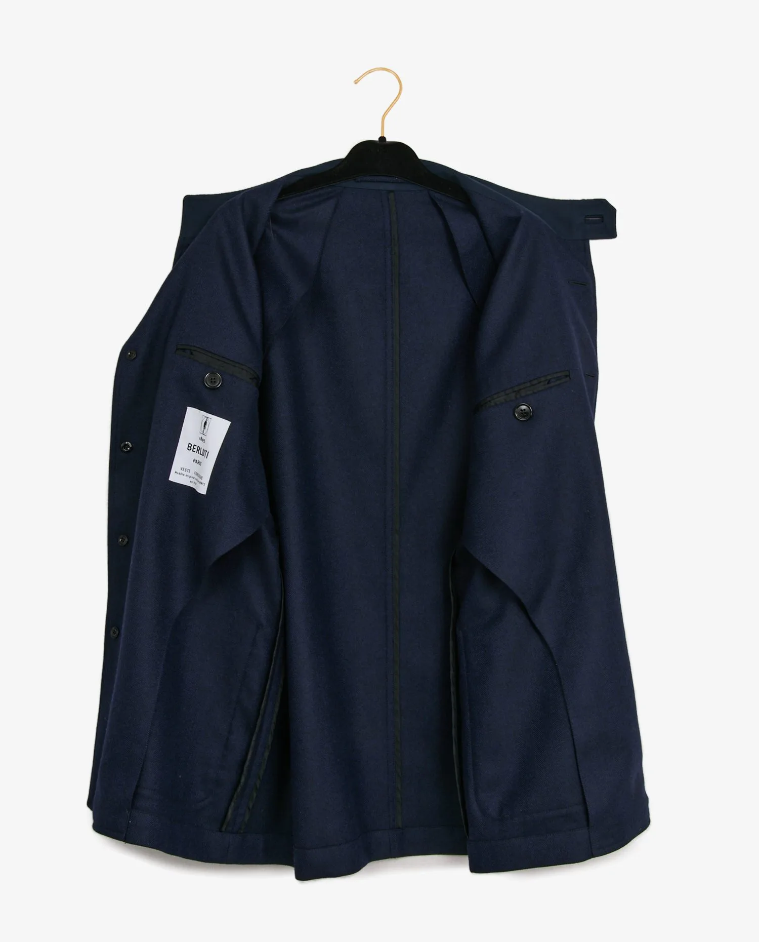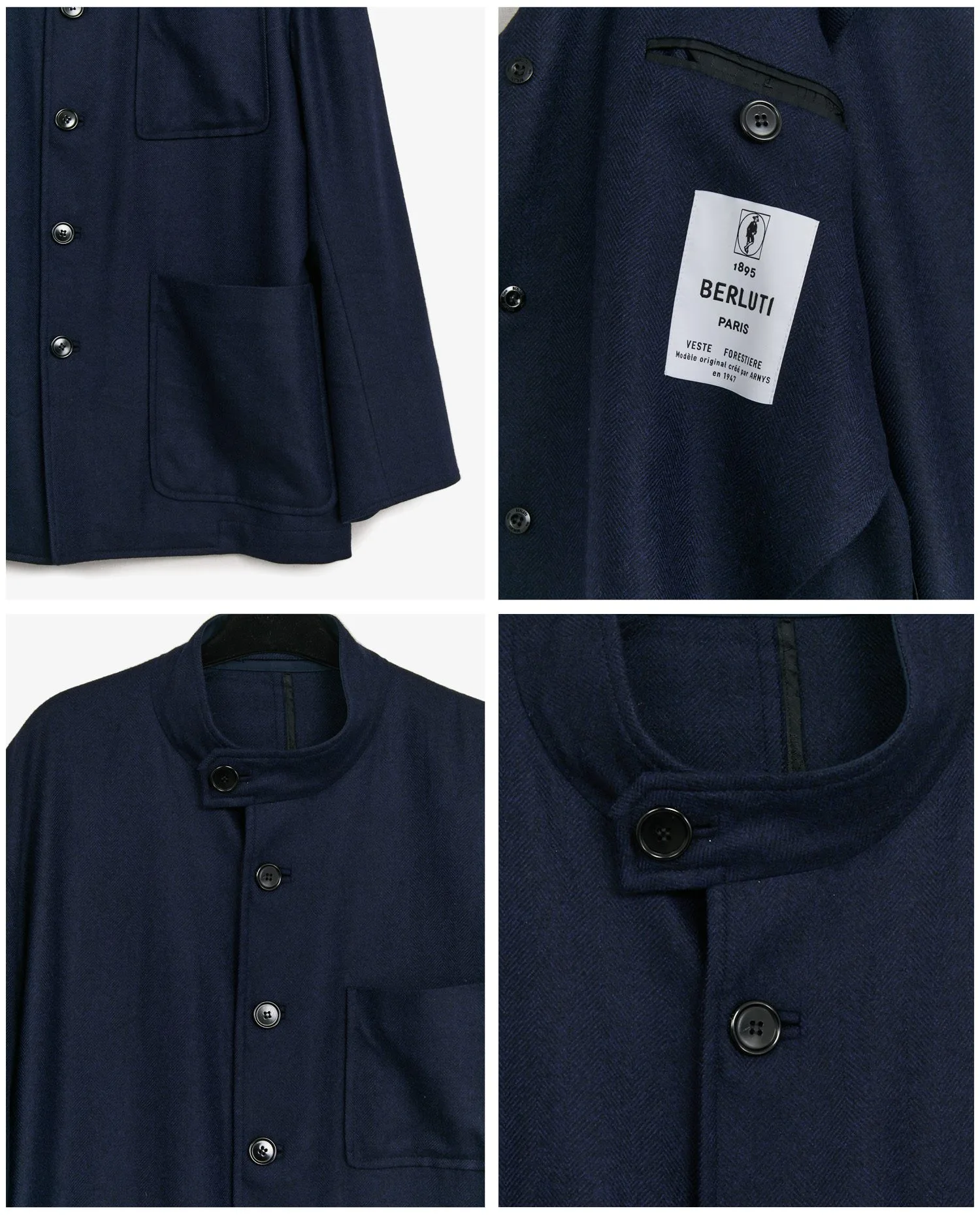 Veste forestière Berluti en cachemire bleu marine. Col Mao. Boutonnée avec 3 poches plaquées. Taille 54. En très bon état.