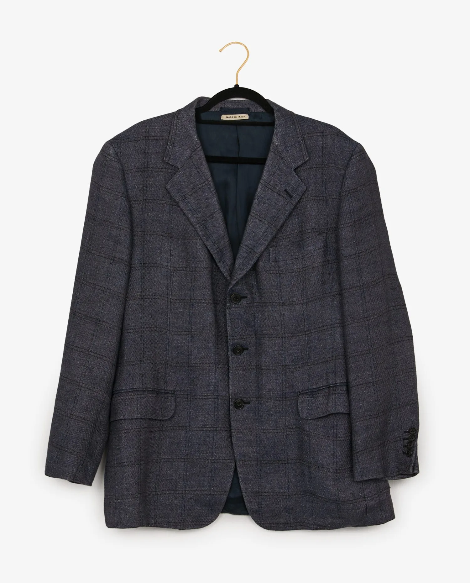 La veste présente un motif prince-de-galles discret en gris-bleuté. Les trois boutons frontaux ton sur ton renforcent la ligne épurée de la pièce. Les poches à rabat sont finement travaillées et la poche poitrine discrète permet d’y glisser un mouchoir ou une pochette. Les épaules sont légèrement structurées sans excès, offrant un tombé naturel et élégant.