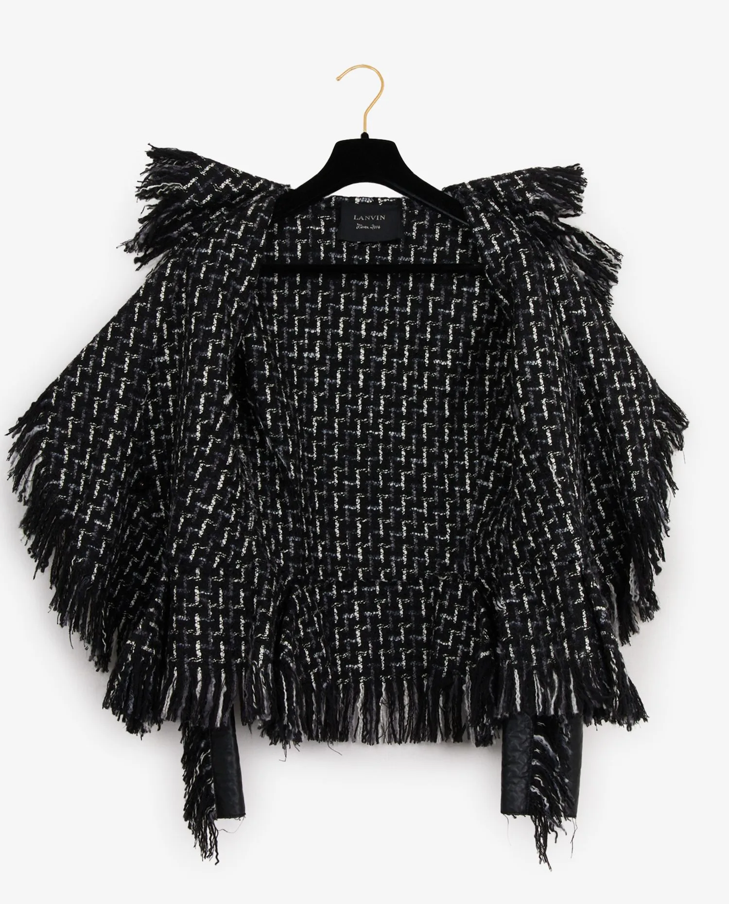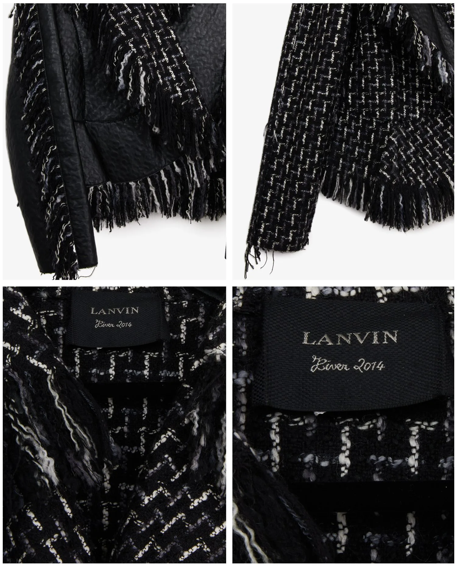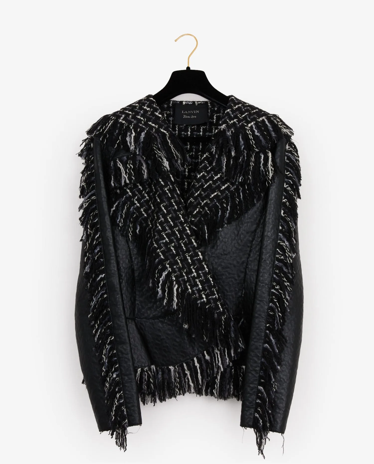 Veste croisée Lanvin en cuir froissé noir et tweed. Taille 38. En très bon état.