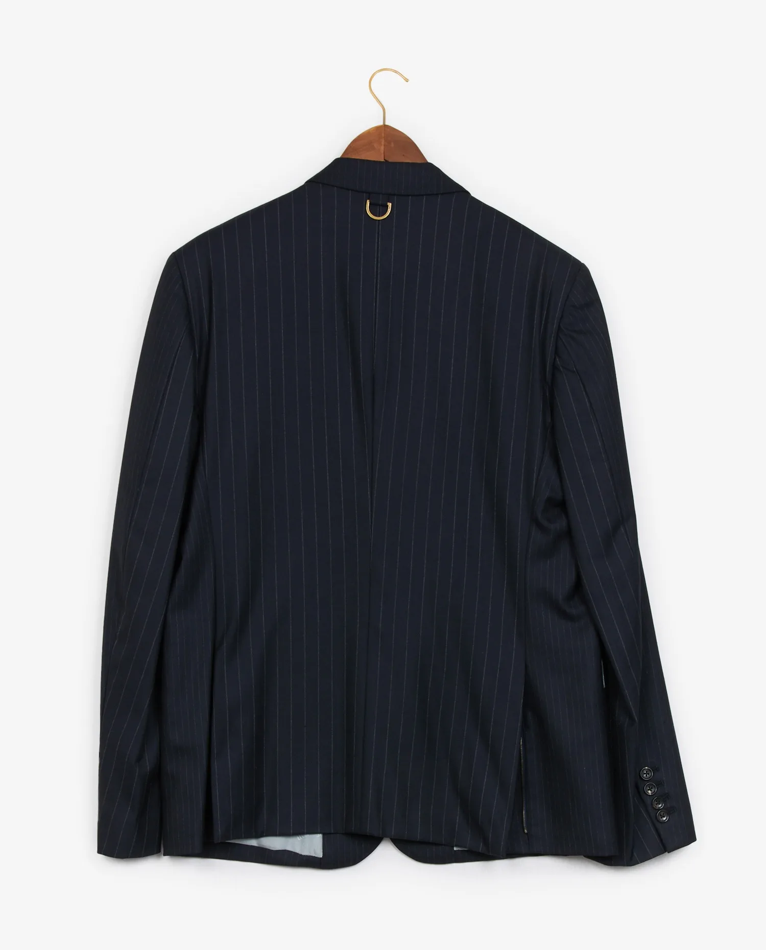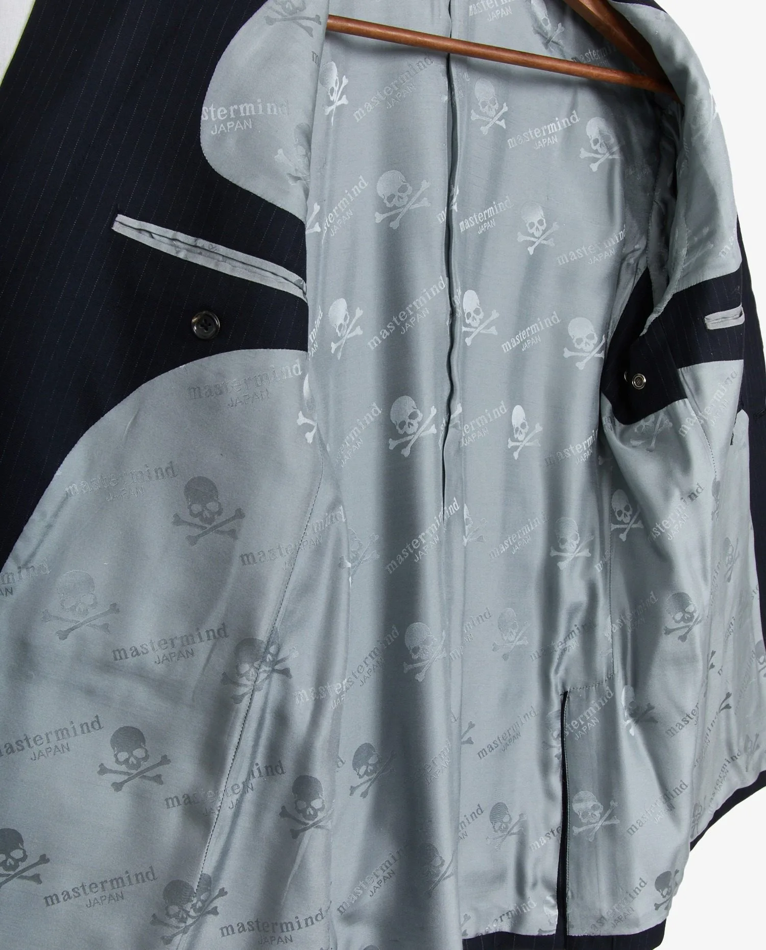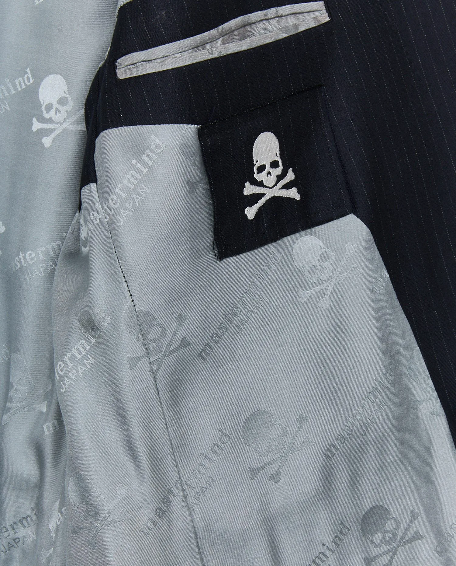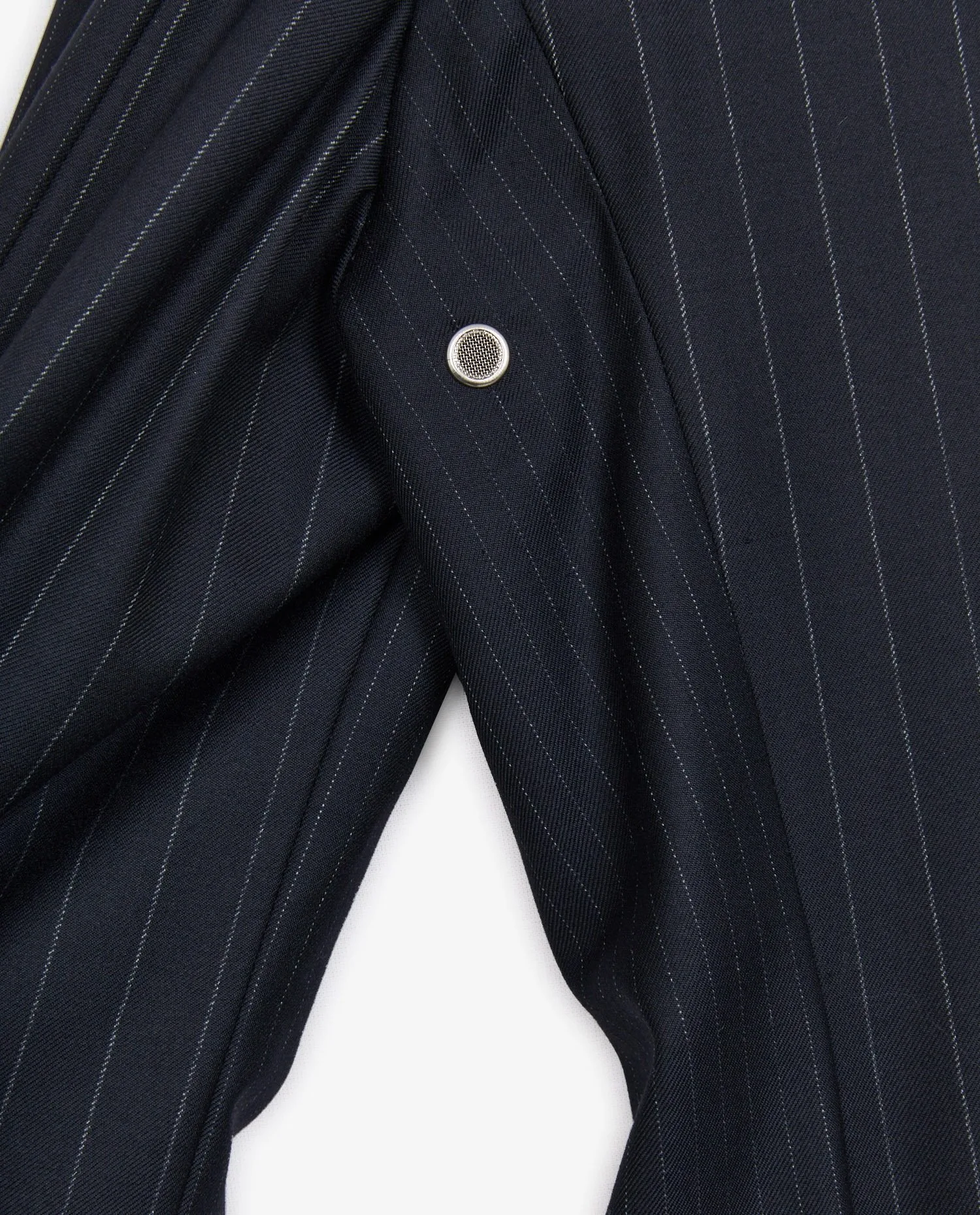 La veste est réalisée dans une laine fine bleu marine à rayures verticales blanches, offrant une allure sobre et élégante. Le revers cranté, les deux boutons de fermeture et les quatre boutons aux poignets renforcent le caractère formel du modèle. À l’arrière, une fente centrale assure une liberté de mouvement, tandis qu’un discret anneau en métal doré au niveau de la nuque ajoute une touche singulière propre à Mastermind. Les poches à rabat sont nettes, bien structurées, et s’intègrent parfaitement dans l’ensemble.