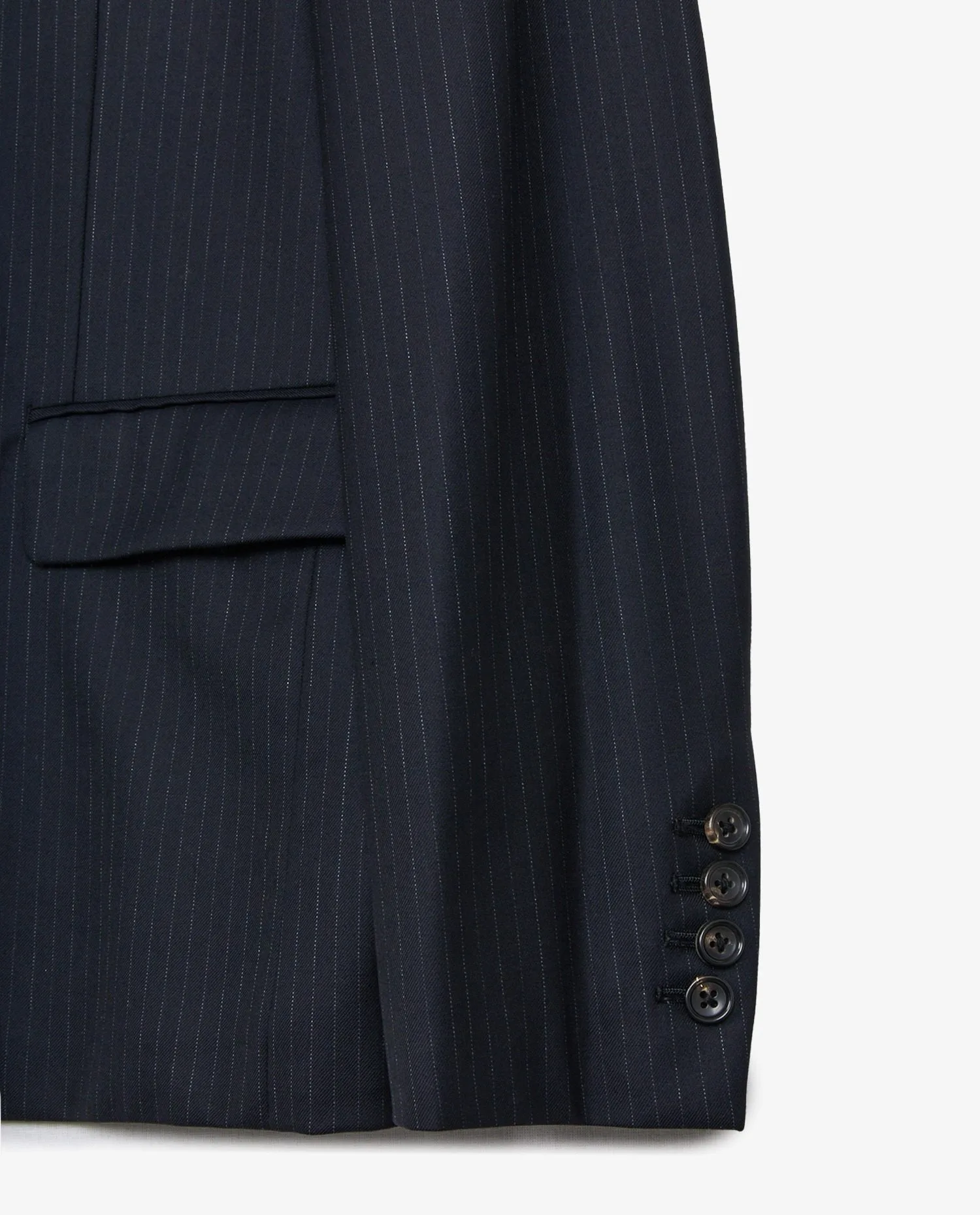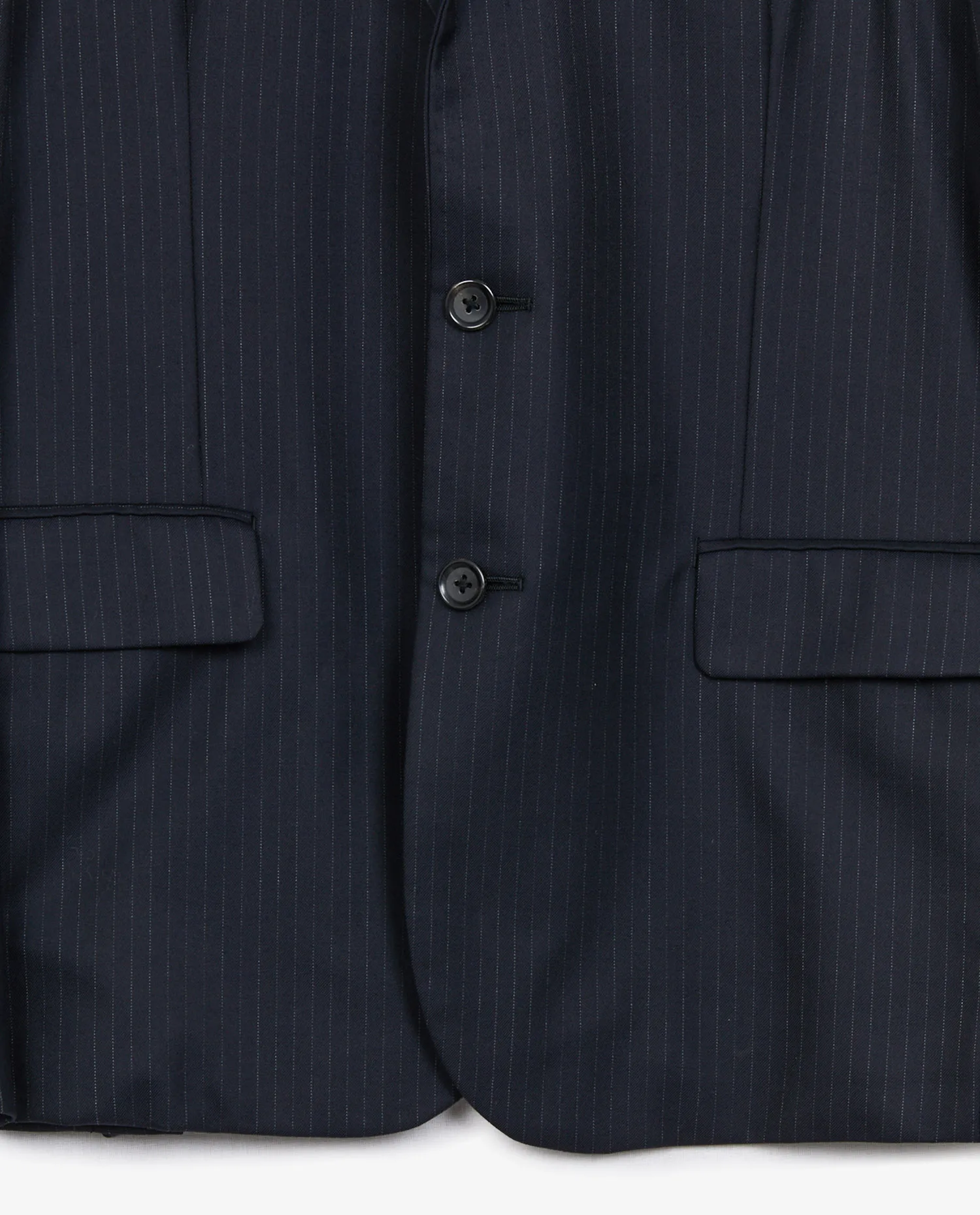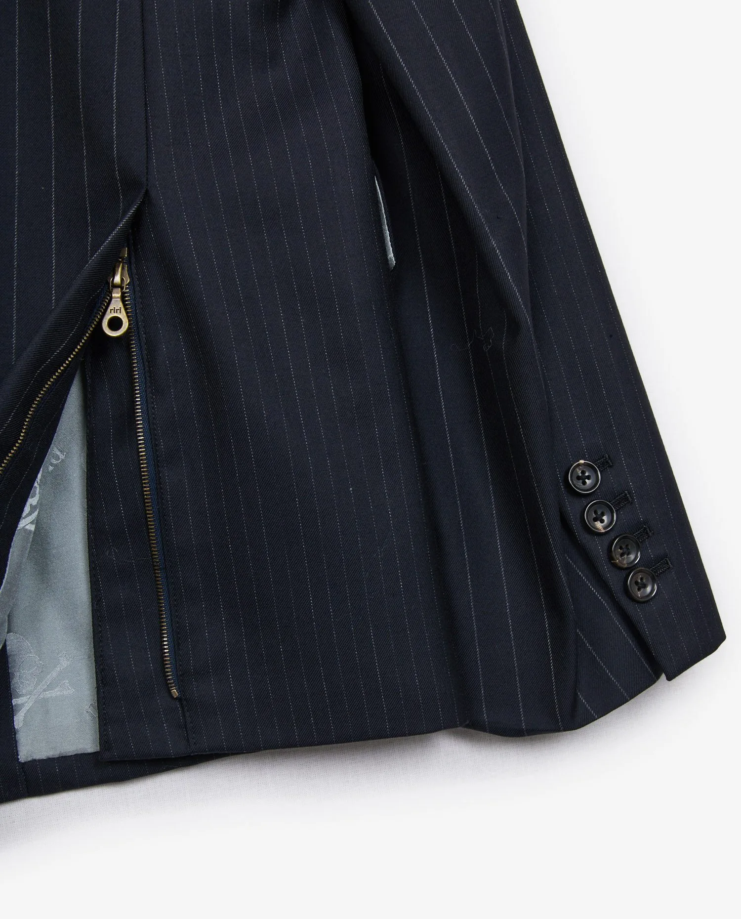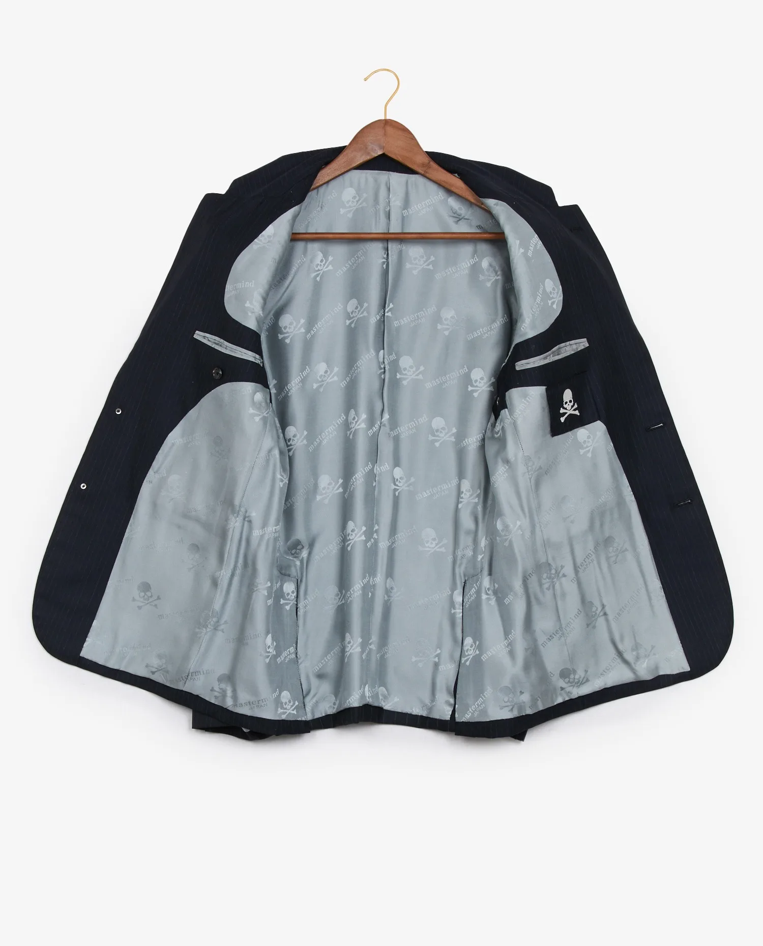 La veste est réalisée dans une laine fine bleu marine à rayures verticales blanches, offrant une allure sobre et élégante. Le revers cranté, les deux boutons de fermeture et les quatre boutons aux poignets renforcent le caractère formel du modèle. À l’arrière, une fente centrale assure une liberté de mouvement, tandis qu’un discret anneau en métal doré au niveau de la nuque ajoute une touche singulière propre à Mastermind. Les poches à rabat sont nettes, bien structurées, et s’intègrent parfaitement dans l’ensemble.