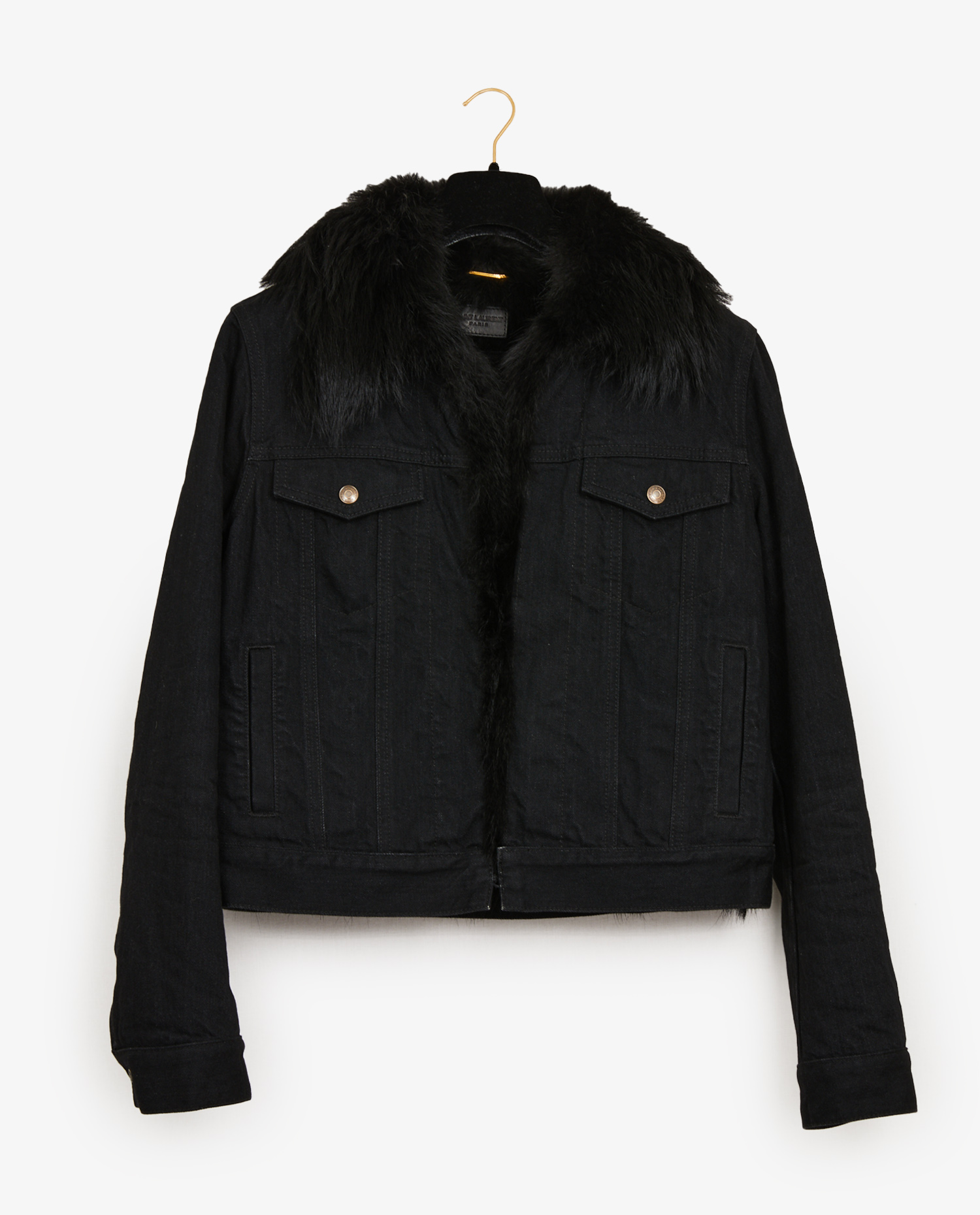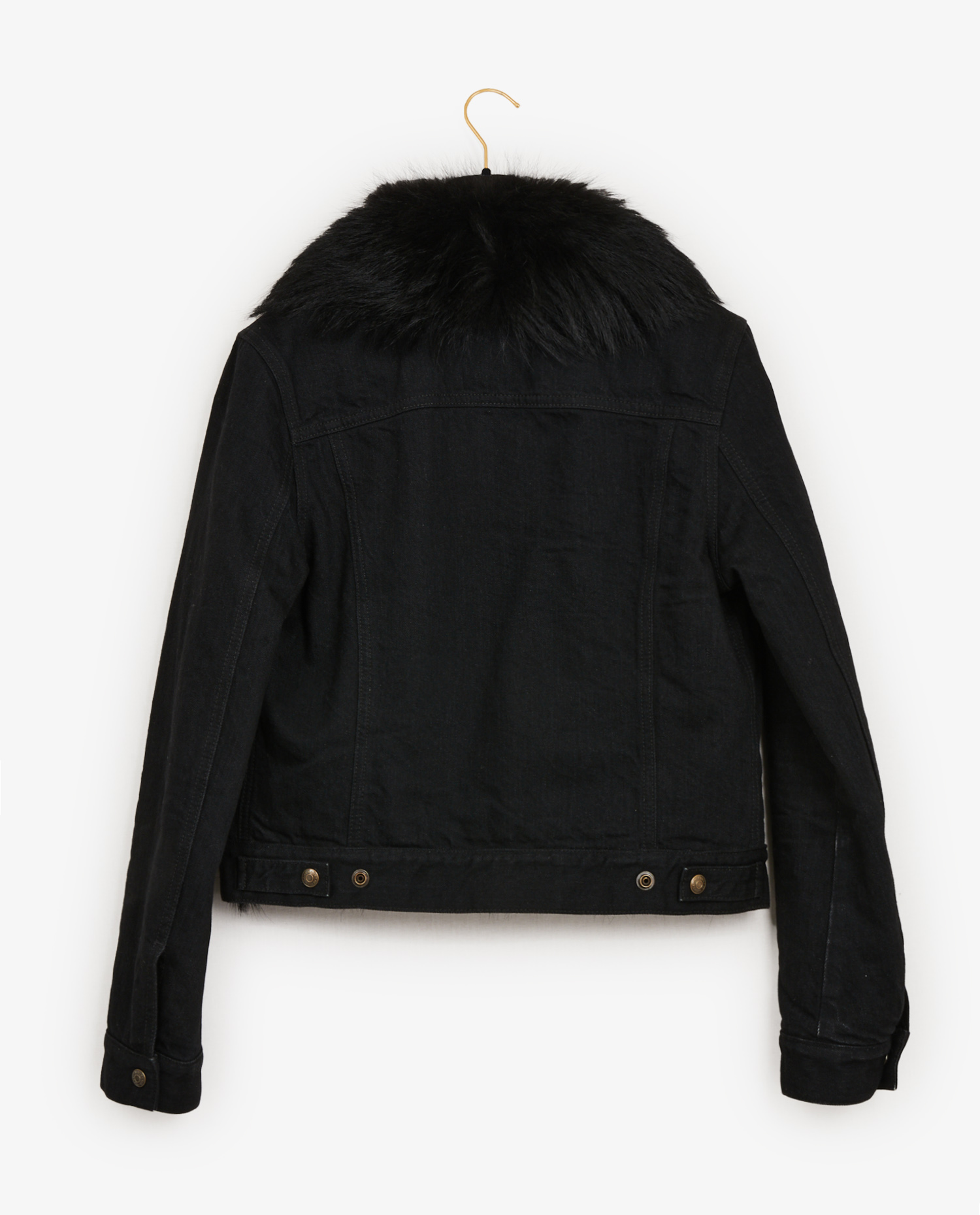 Veste Saint Laurent en denim et fourrure de renard noire. Taille M. Doublure manches en coton. En très bon état.