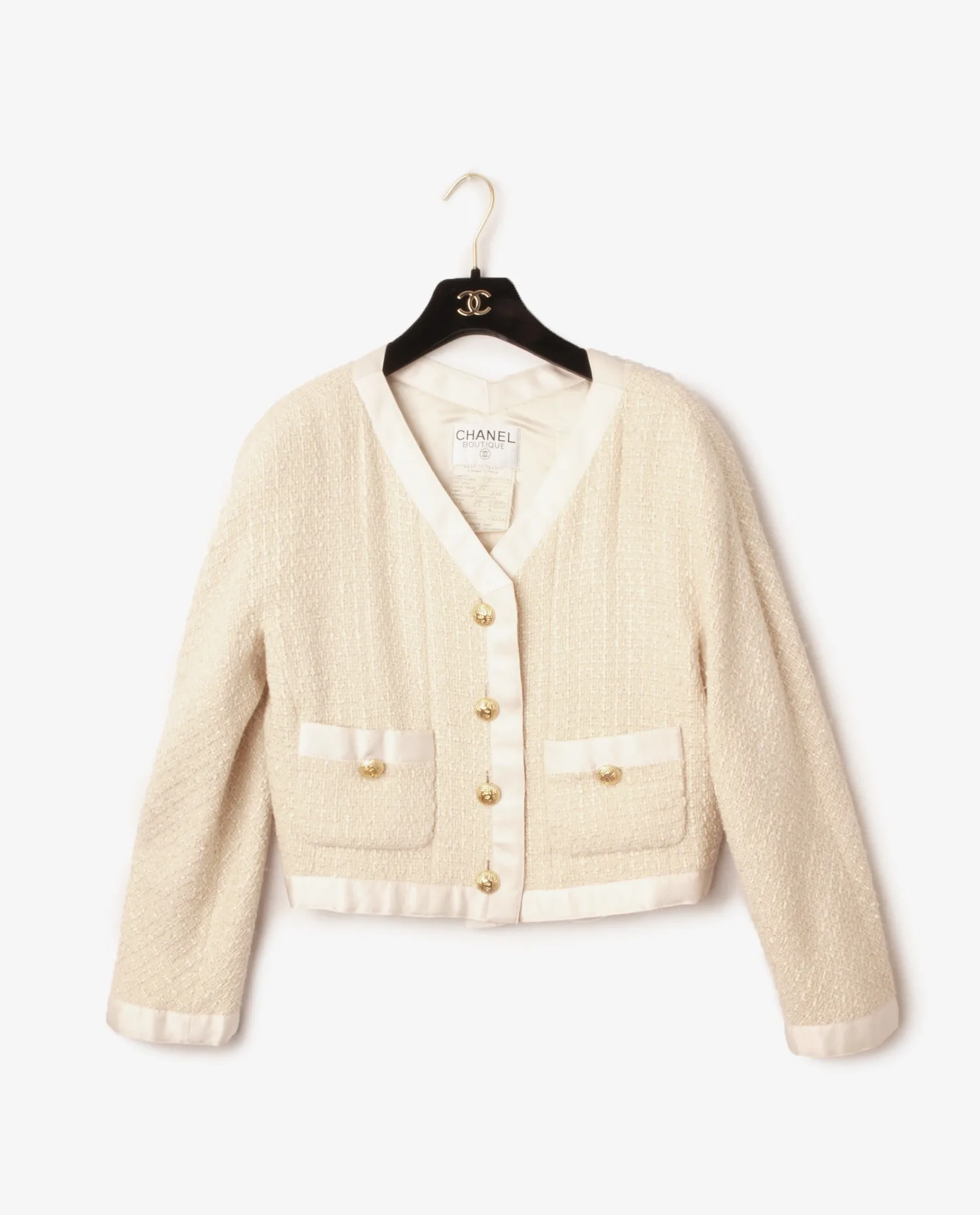Veste courte Chanel vintage en tweed et bordures en satin beige. Sublime boutons en métal dorés siglés “CC” à l’avant et sur les deux poches plaquées. Doublure en soie cousue à la main.