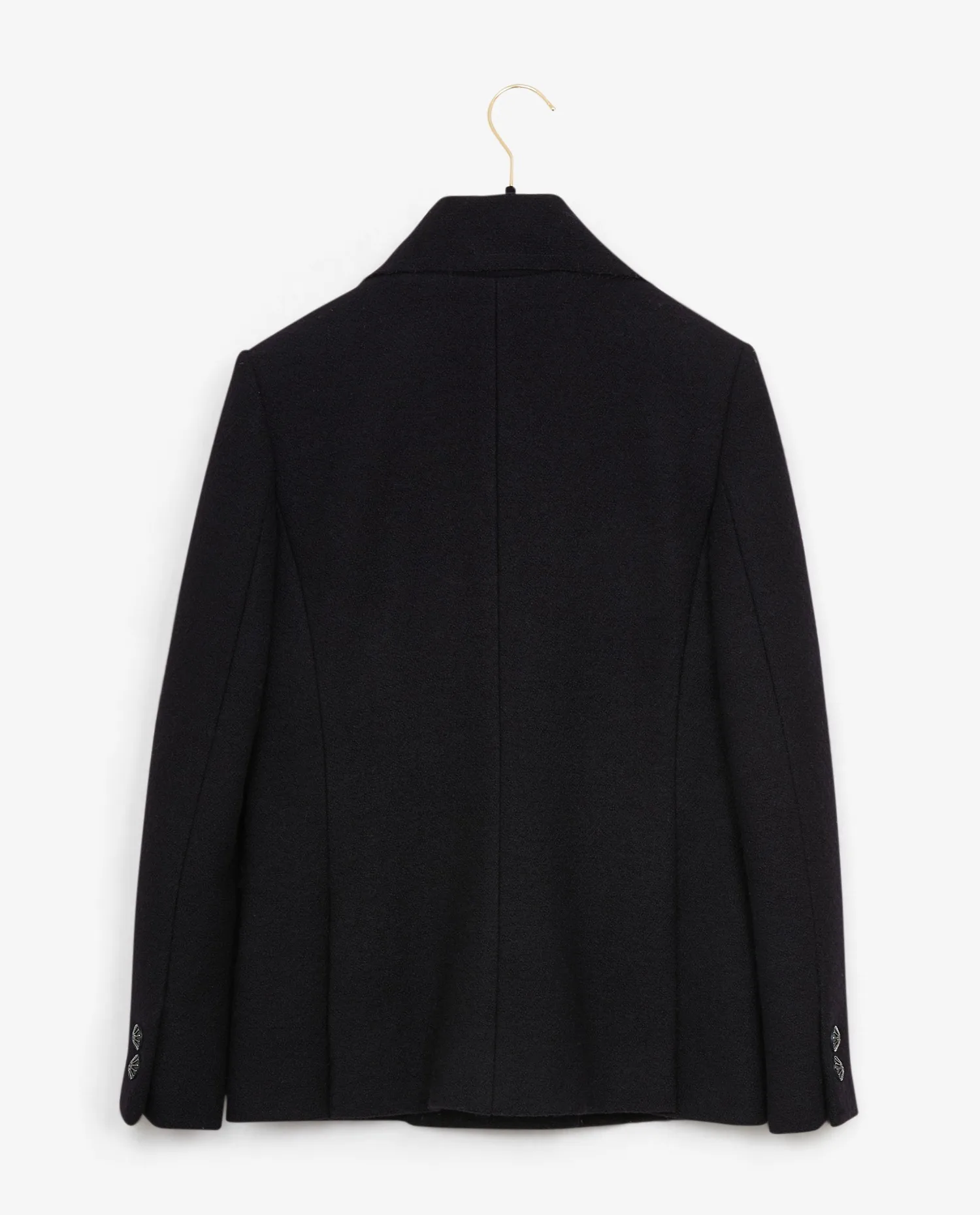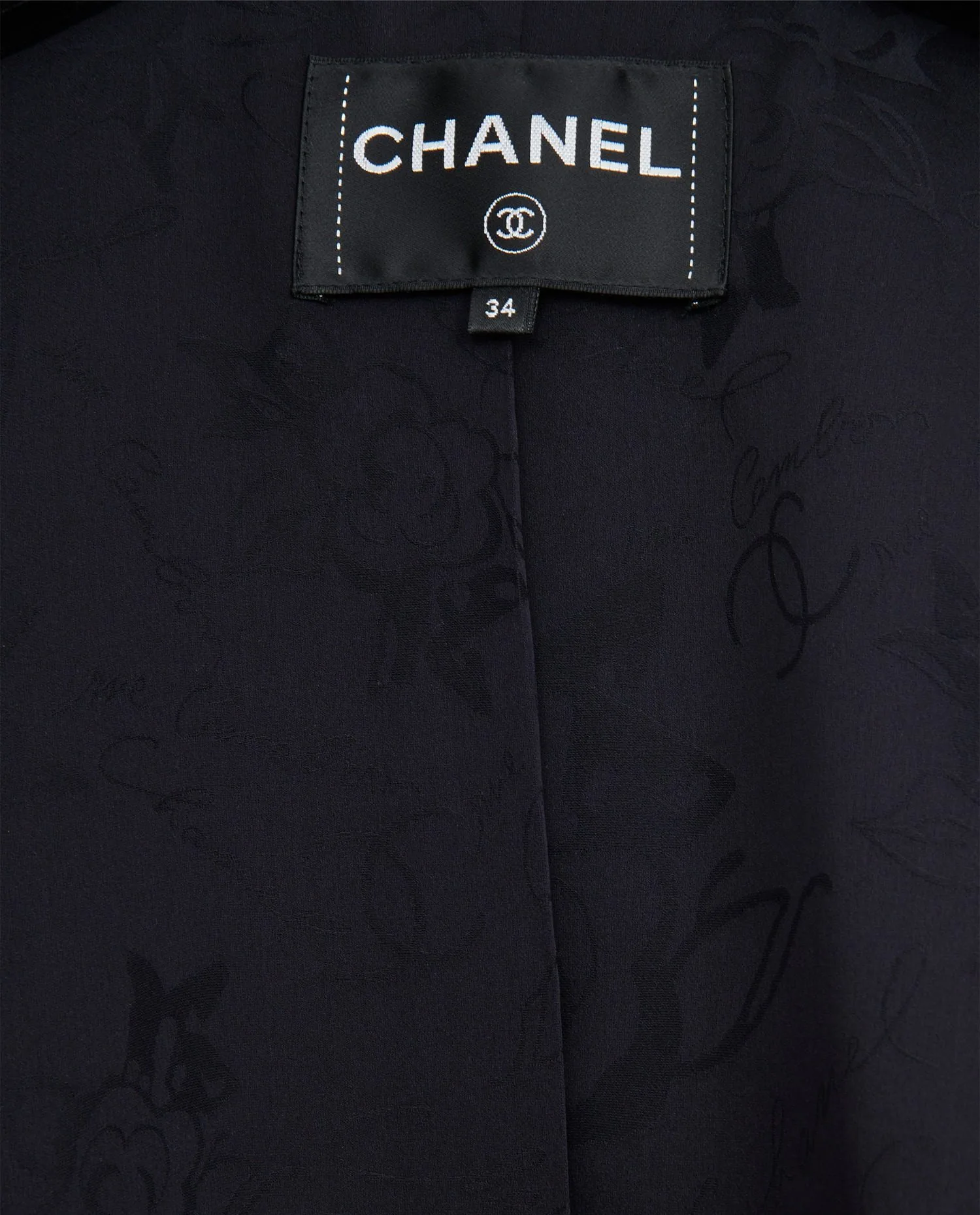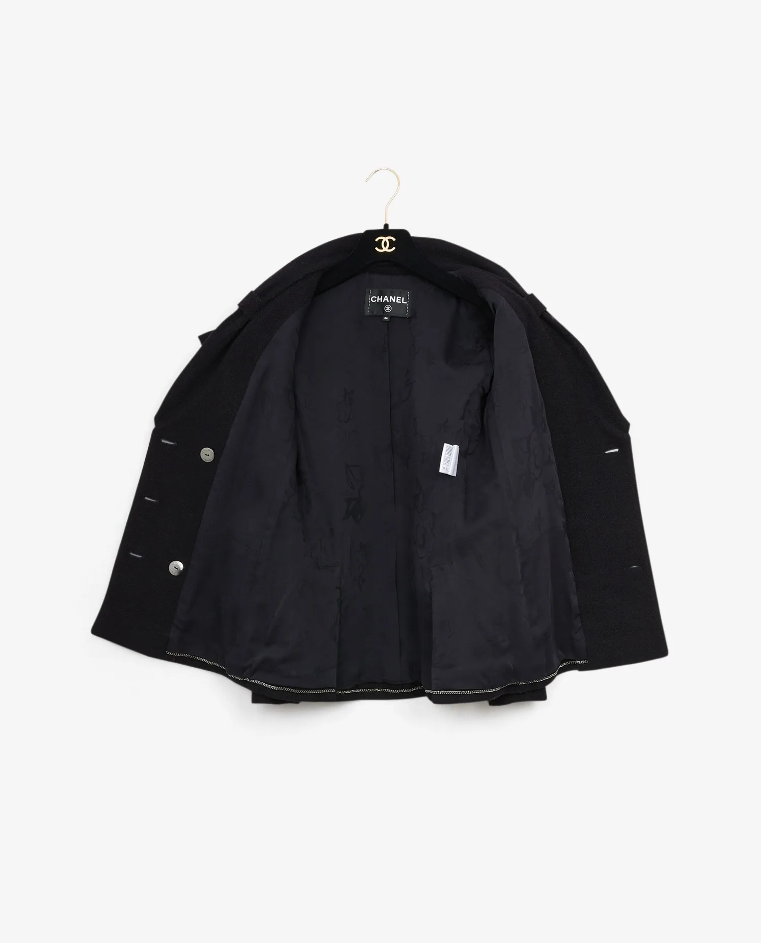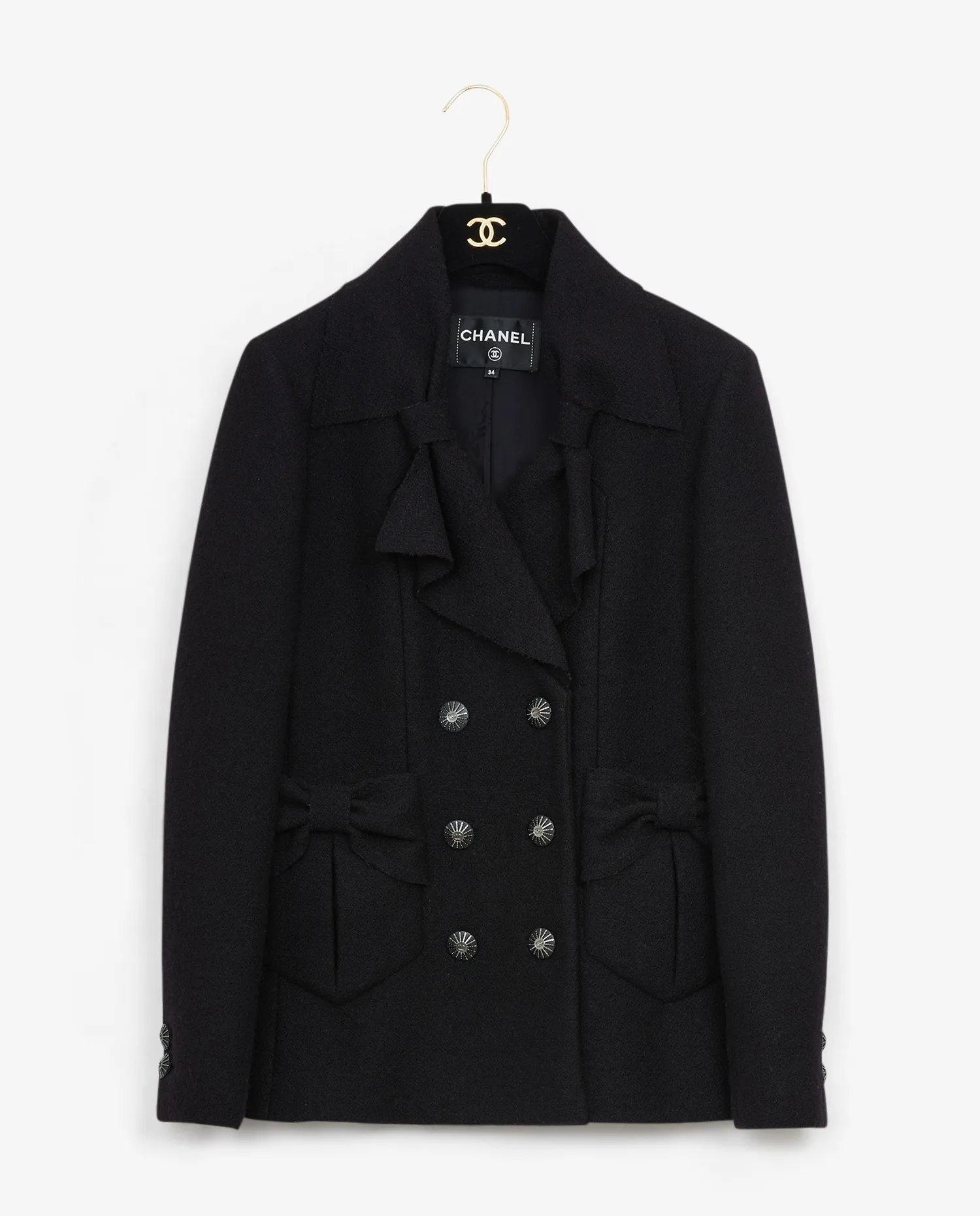 Veste croisée tweed noir Chanel. Taille 34. Doublure en soie noire. Deux poches plaquées à l’avant. En très bon état.