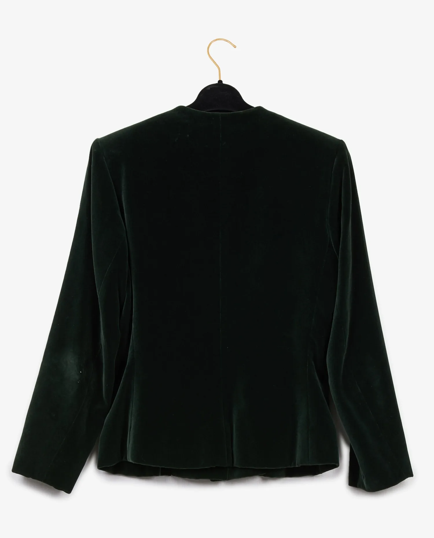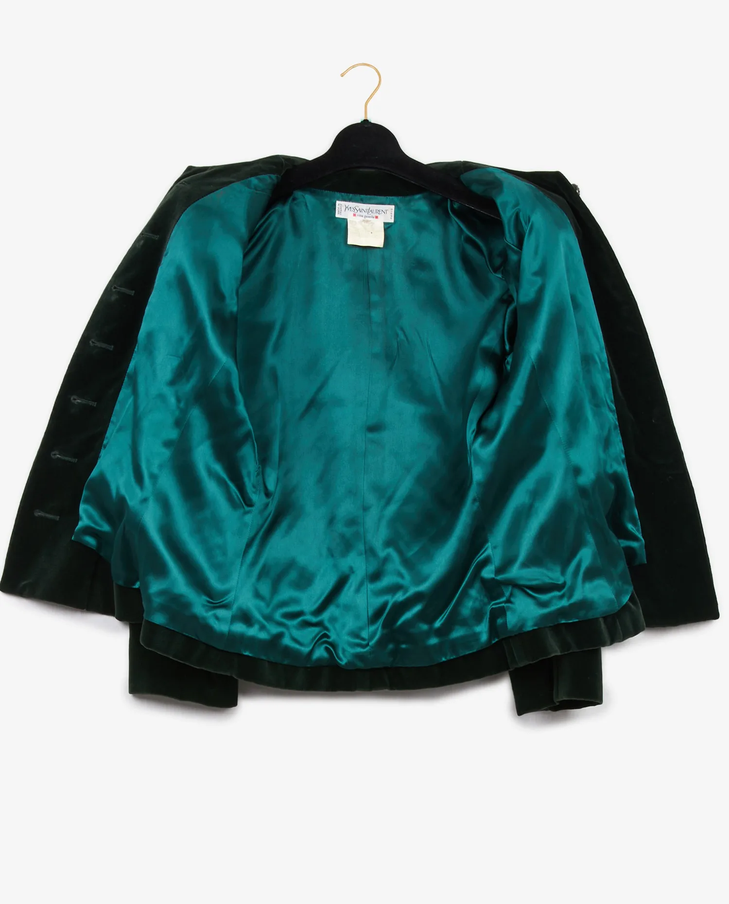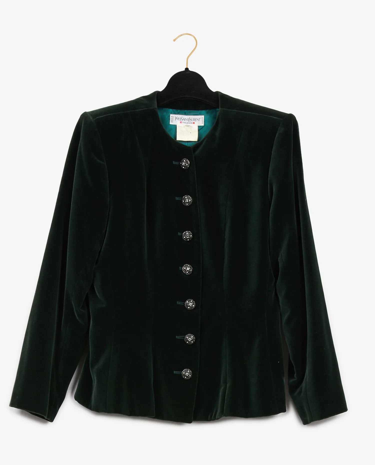 Veste Yves Saint Laurent rive gauche en velours vert. Boutons bijoux argent. Cintrée à la taille. En très bon état.