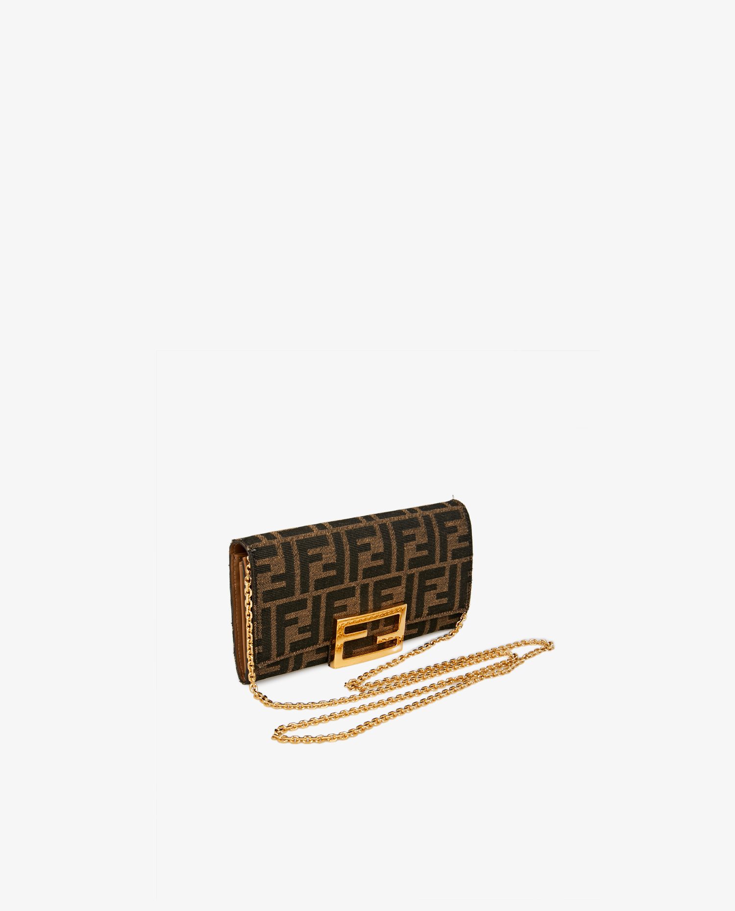 Wallet on chain Baguette Fendi en toile monogramme marron. Il peut se porter à la main en pochette ainsi qu’à l’épaule à l’aide d’une bandoulière en chaine dorée. A l’intérieur, 10 fentes pour cartes, 4 fentes pour billets, une poche zippée et deux grands espaces de rangements. Fermeture par bouton pression. En très bon état. Il sera livré dans son dustbag d’origine.