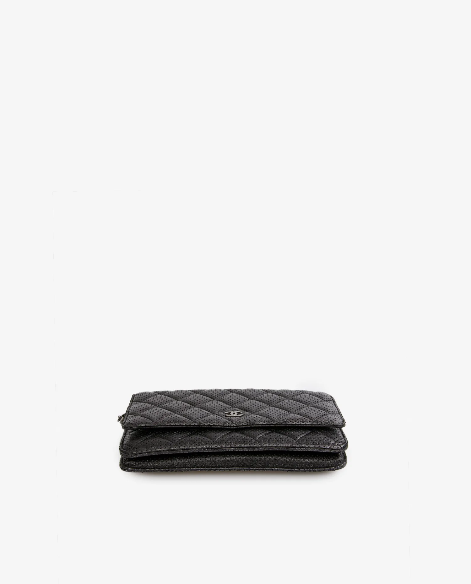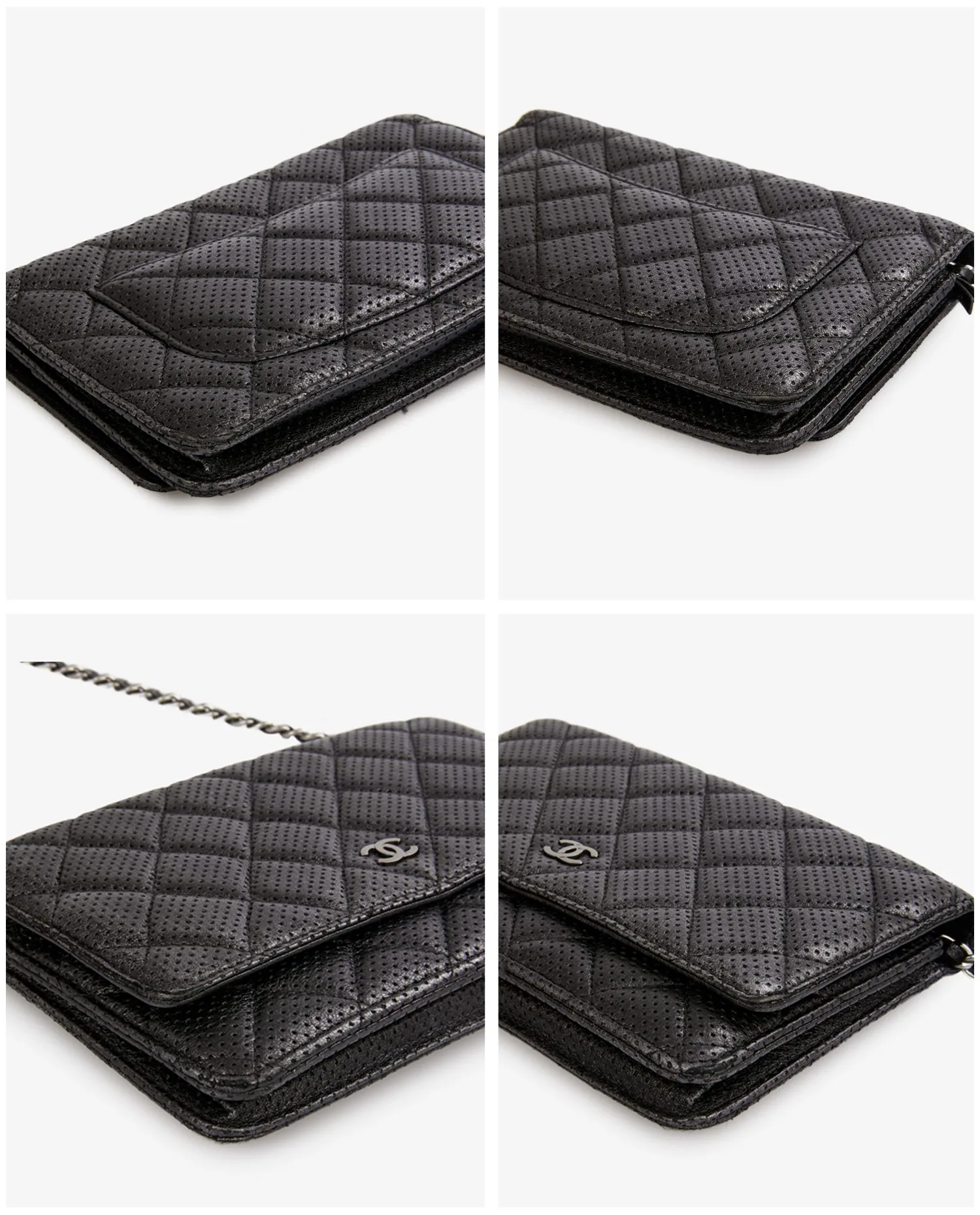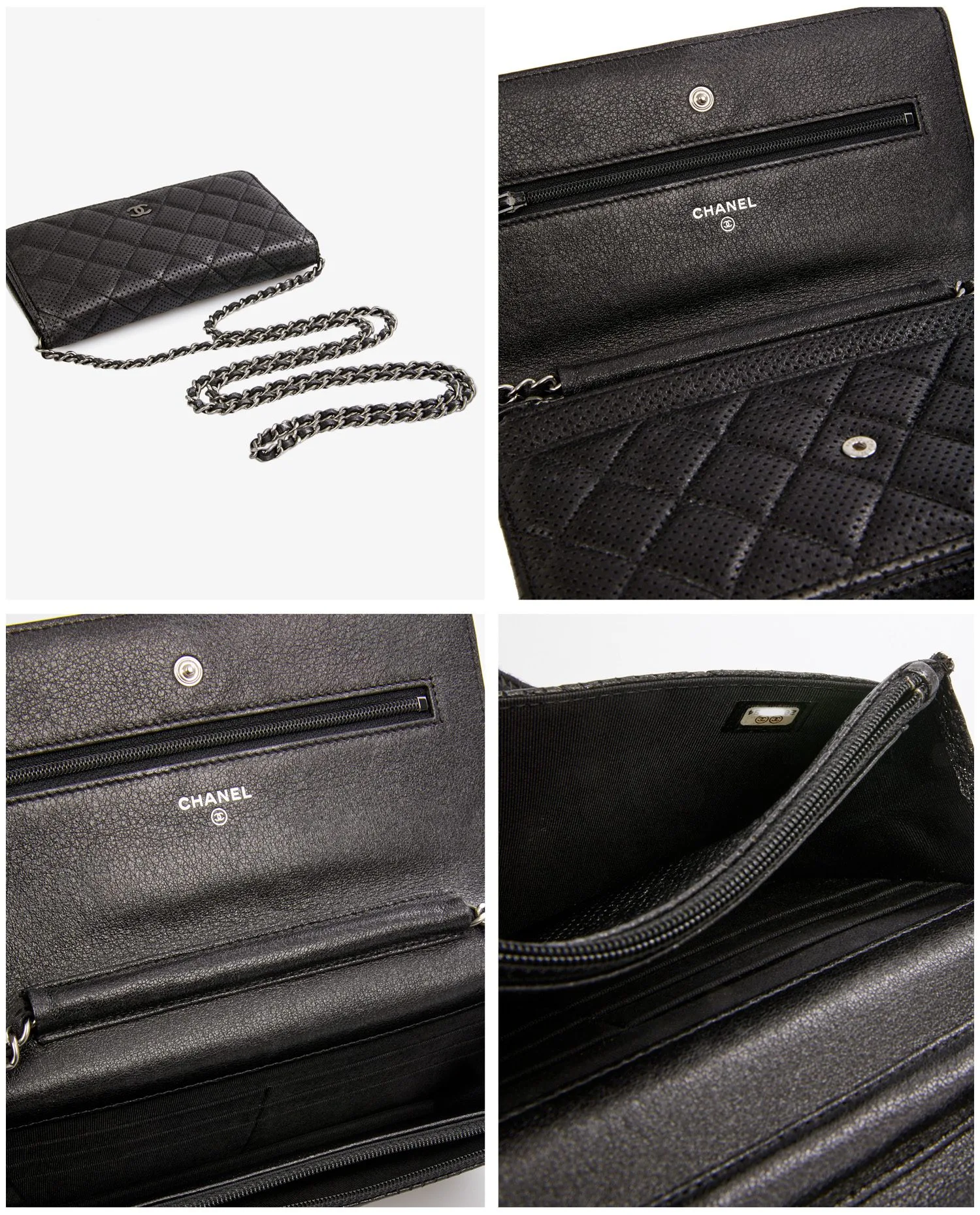 Wallet on chain Chain Chanel en cuir noir perforé. Fermeture par bouton pression. Porté en bandoulière ou comme une pochette. L’intérieur est en tissu noir, 6 fentes pour cartes et une poche zippée. En très bon état. Livré dans son dustbag et boite d’origine.