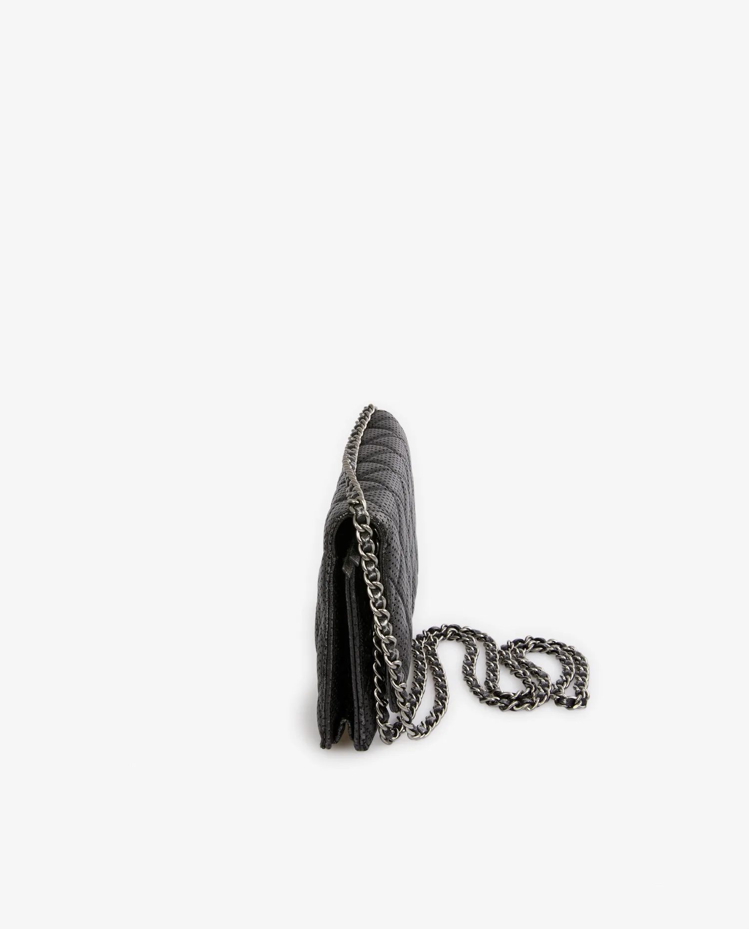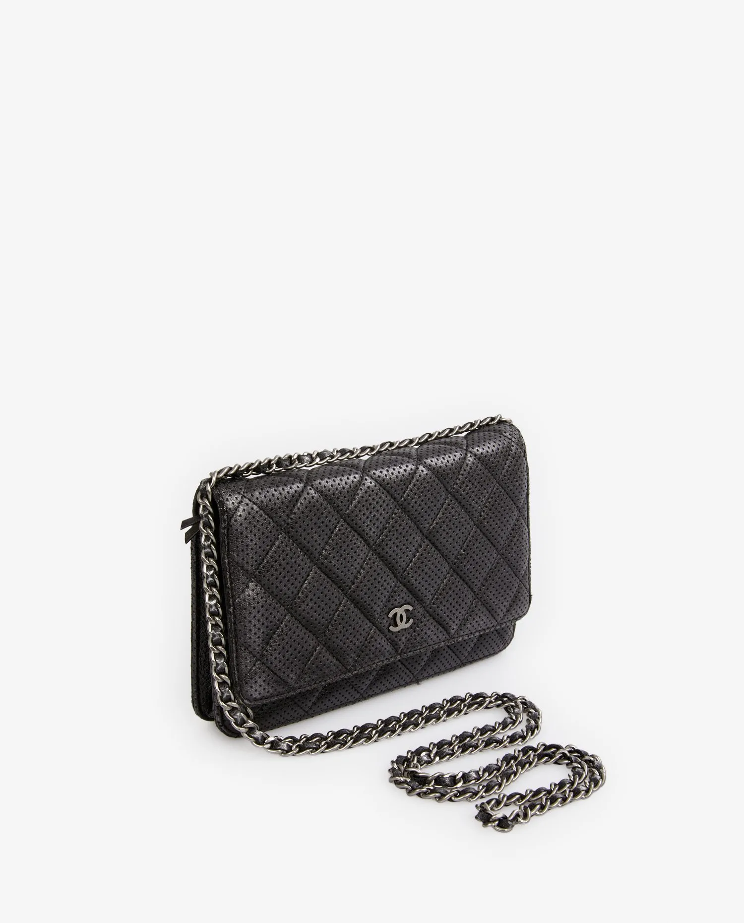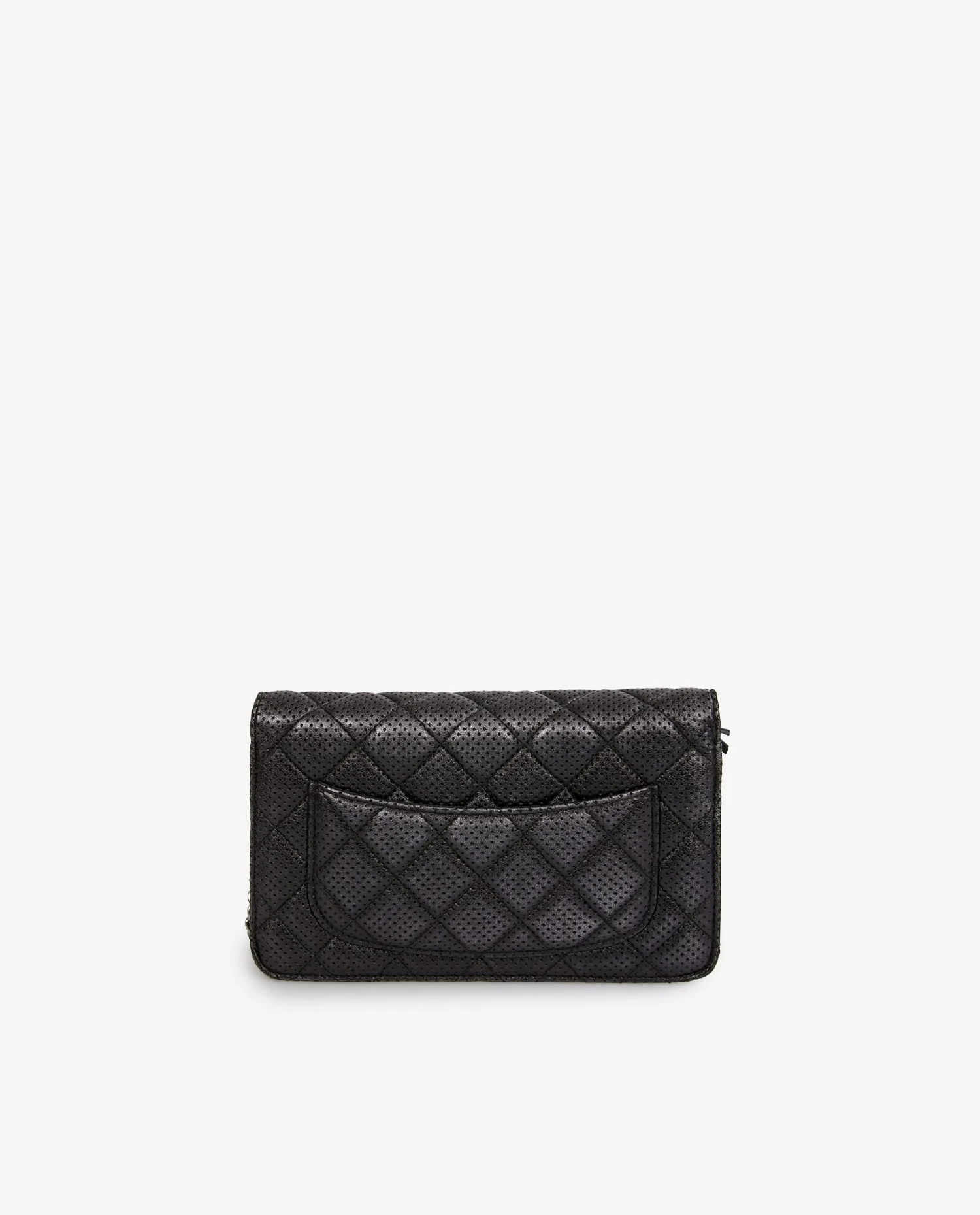 Wallet on chain Chain Chanel en cuir noir perforé. Fermeture par bouton pression. Porté en bandoulière ou comme une pochette. L’intérieur est en tissu noir, 6 fentes pour cartes et une poche zippée. En très bon état. Livré dans son dustbag et boite d’origine.